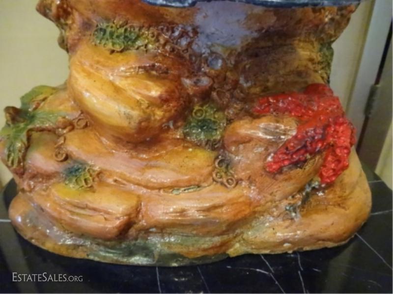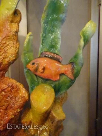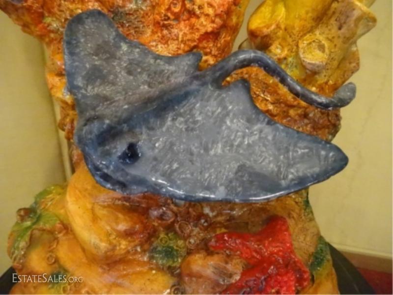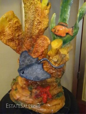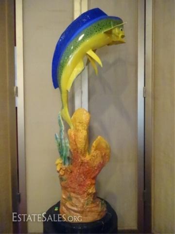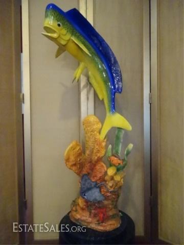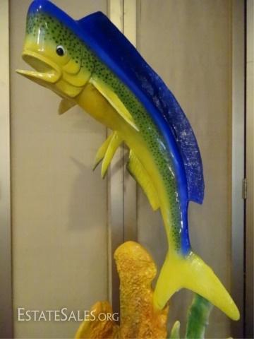 LOT 89B: LARGE PATINATED BRONZE SCULPTURE, MAHI MAHI ON MARBLE BASE WITH RAY, CORAL, AND FISH, NEW IN SHOWROOM CONDITION, 50"H X 15"W X 14"D, SKU006.14 H1300