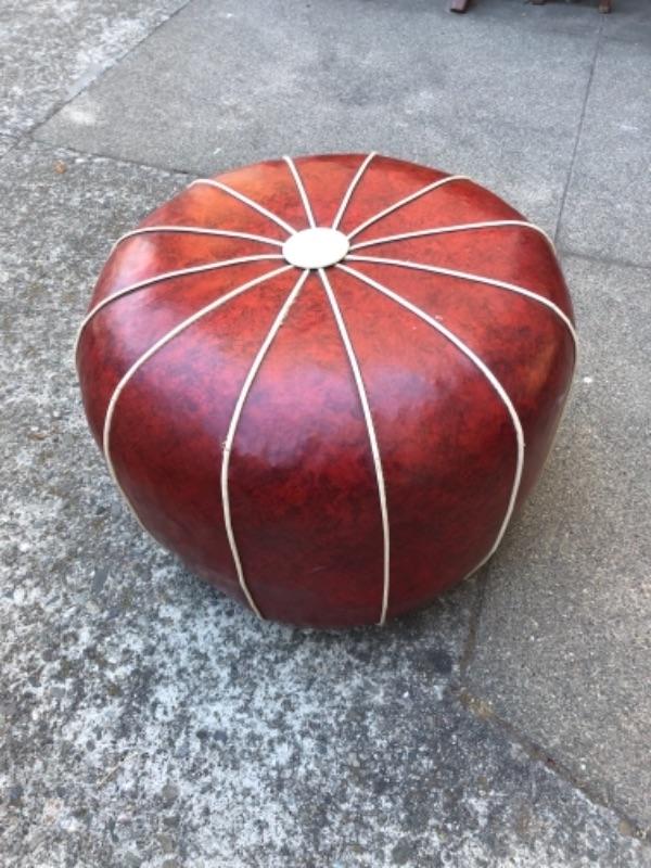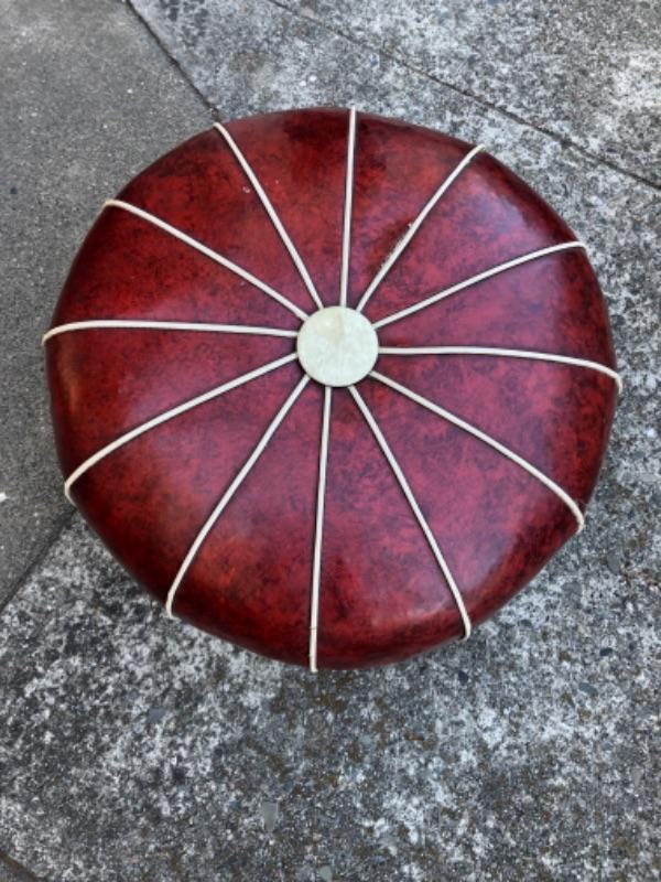 Lot 89DM. Vintage Midcentury round Hassock Footstool/Ottoman, oxblood red and white piping, naugahyde vinyl, 19” Diameter x 14” Tall, 1950-60’s “” $45
