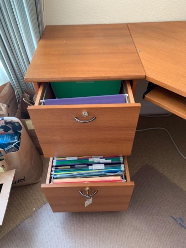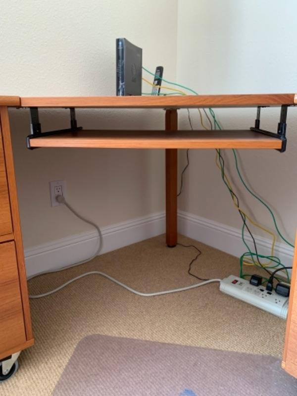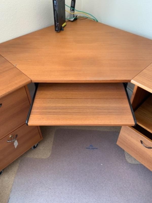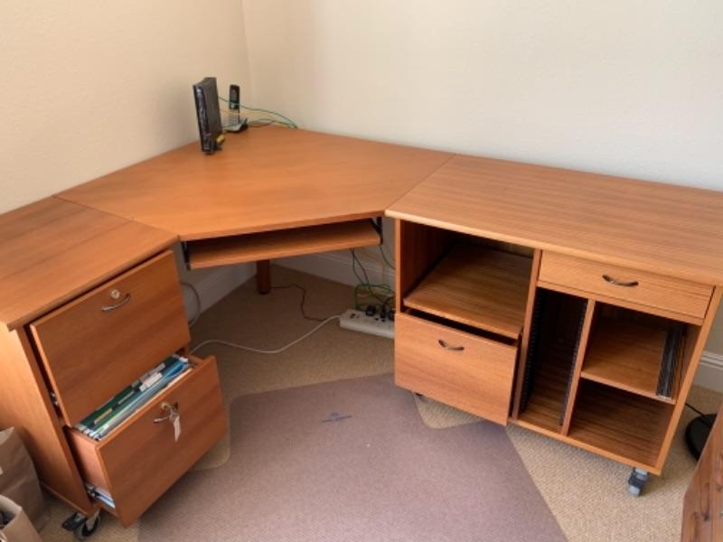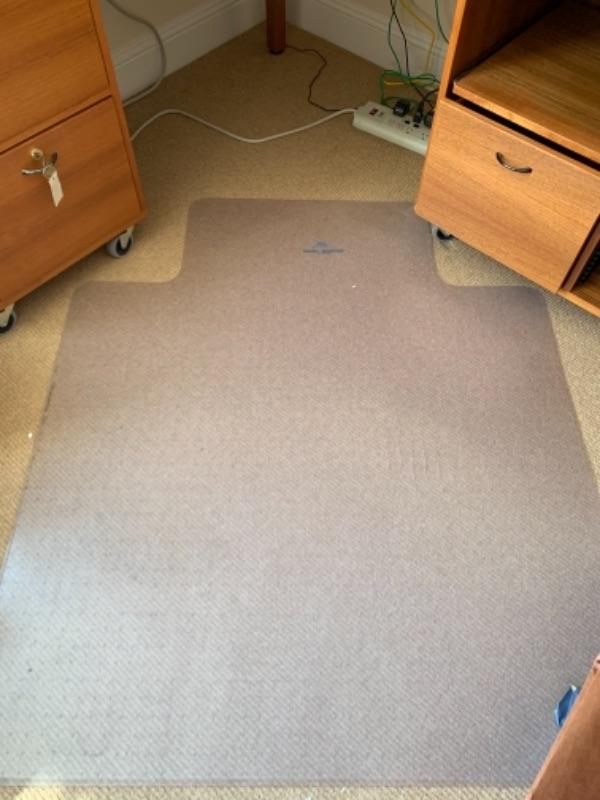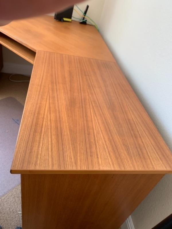 Lot 8U. Oak corner office desk on wheels, 71” long, 29” high, 55” deep, with floor pad“”52” x 44”--Was$85 - Now $45