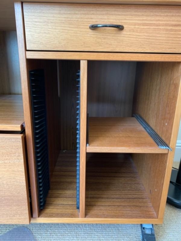 Lot 8U. Oak corner office desk on wheels, 71” long, 29” high, 55” deep, with floor pad“”52” x 44”--$45