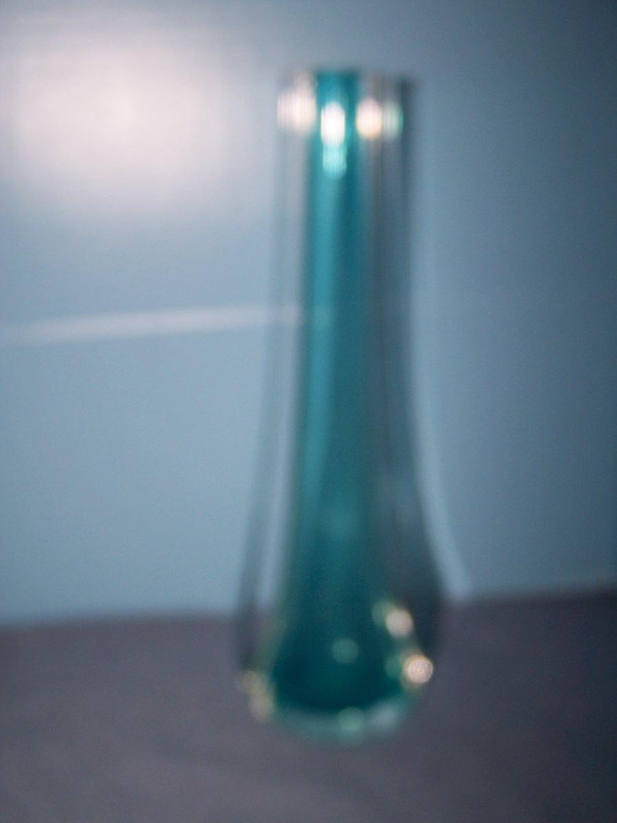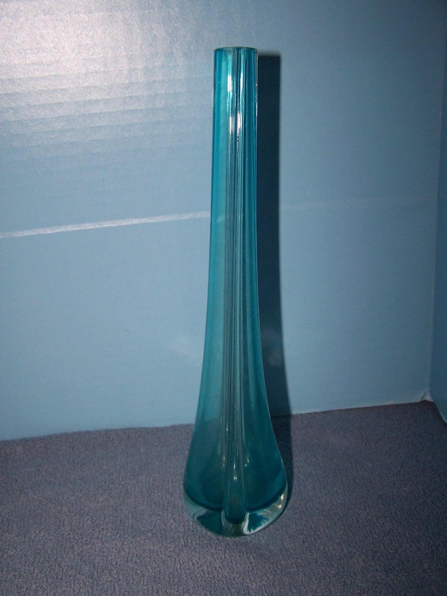 GREAT VINTAGE MCM COLORFUL ART GLASS TEAL VASE HAS SOME RIM CHIPS AND IS 9 3/4 TALL LIGHT WEAR