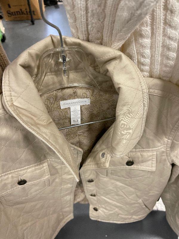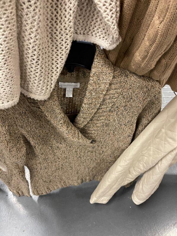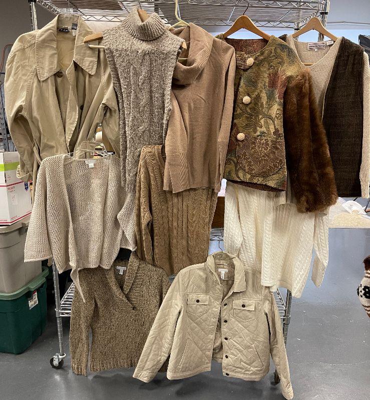 Good Wearable Condition. Banana Republic, Gap, Charter Club etc. Mostly Tan Toned. Medium to Large. Coats and Swearers. All Used.