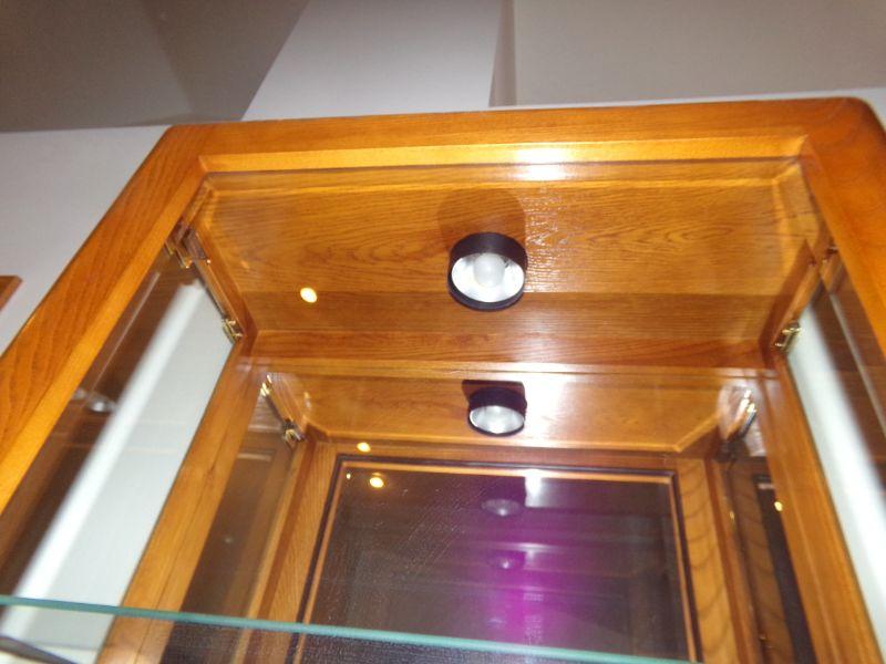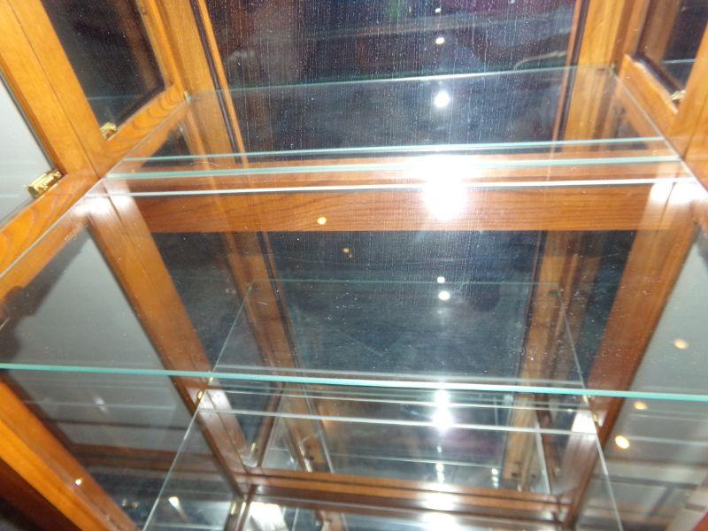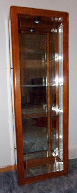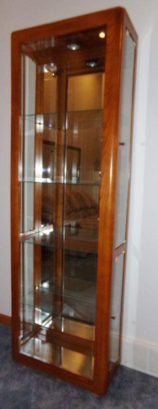 LIGHT CABINET TO DISPLAY ALL YOUR TREASURES. EACH GLASS SHELF IS CUT TO DISPLAY PLATES. CABINET MEASURES 24" X 12" X 76" TALL
