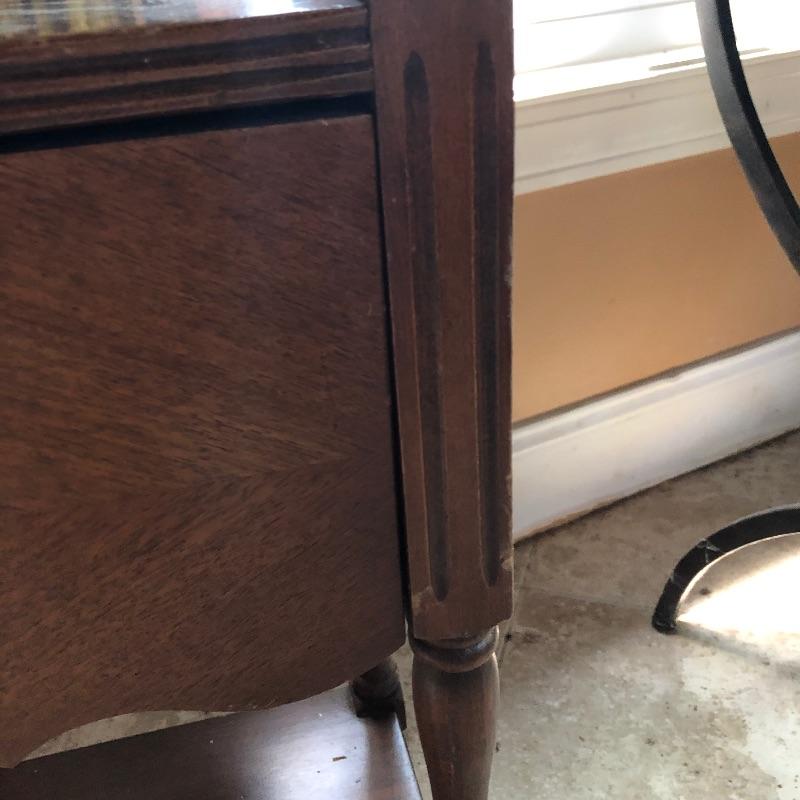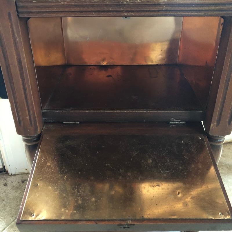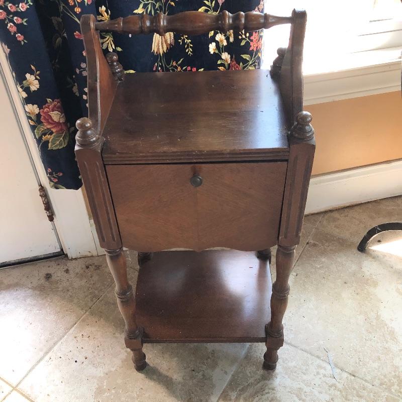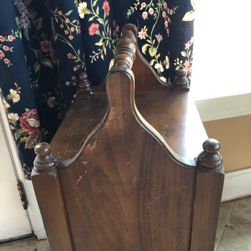 Included in this lot is a beautiful stained wooden humidor stand. Humidors are used to store cigars, cigarets, and other similar items in the copper lined cabinet. Good condition with a couple small surface level scratches on the side. It measures about 13" x 10" x 29.5” Local pick up only.