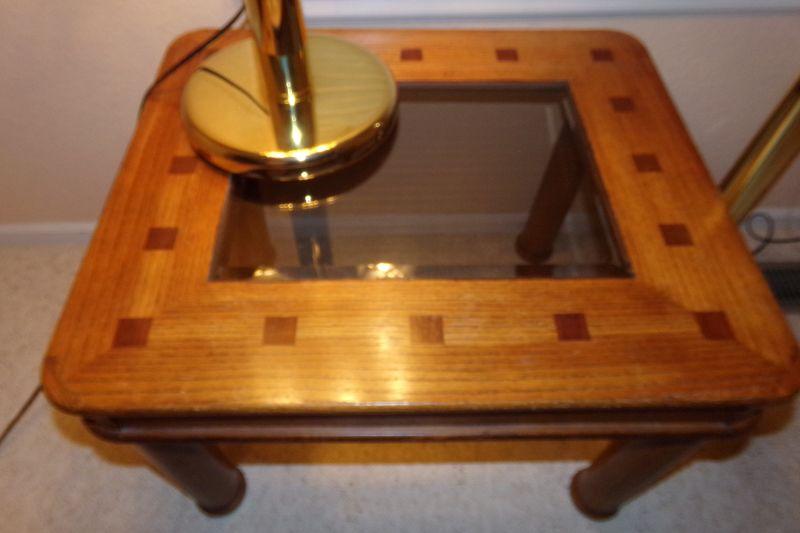 INCLUDED IS A GLASS TOP TABLE WITH WOODEN INLAYS
