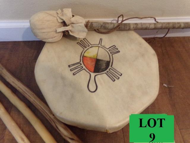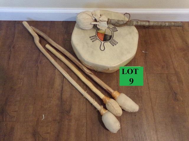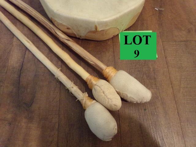LOT 9 NATIVE AMERICAN PAINTED LEATHER HAND DRUM WITH MALLETS