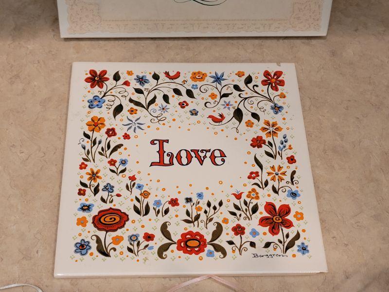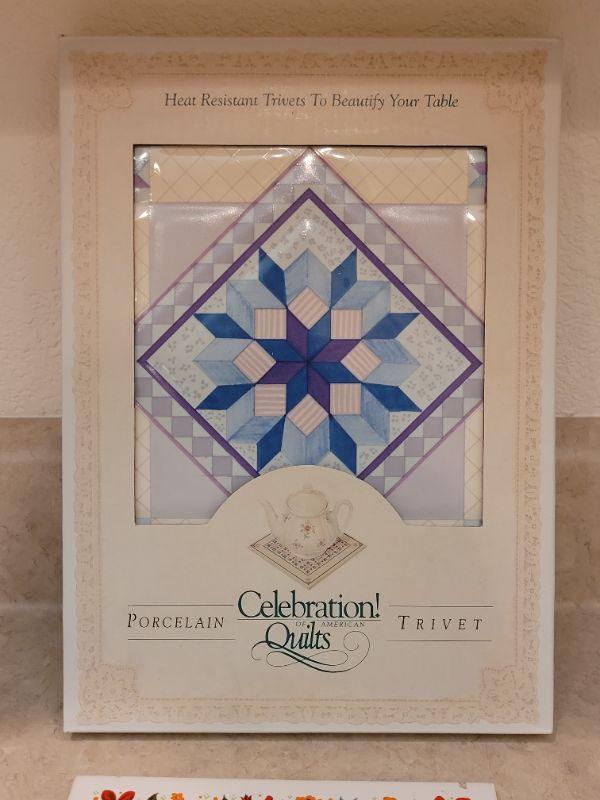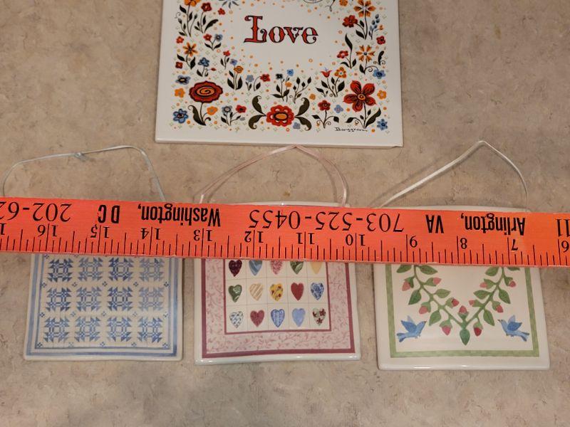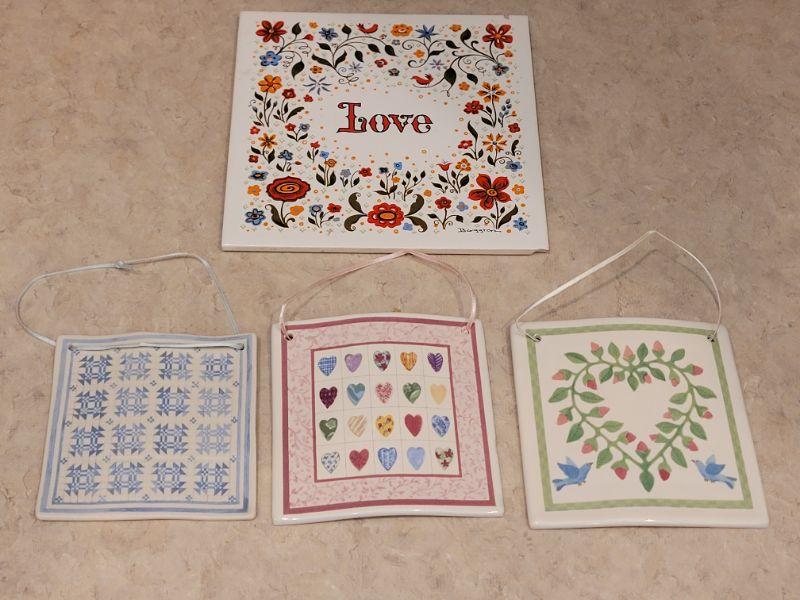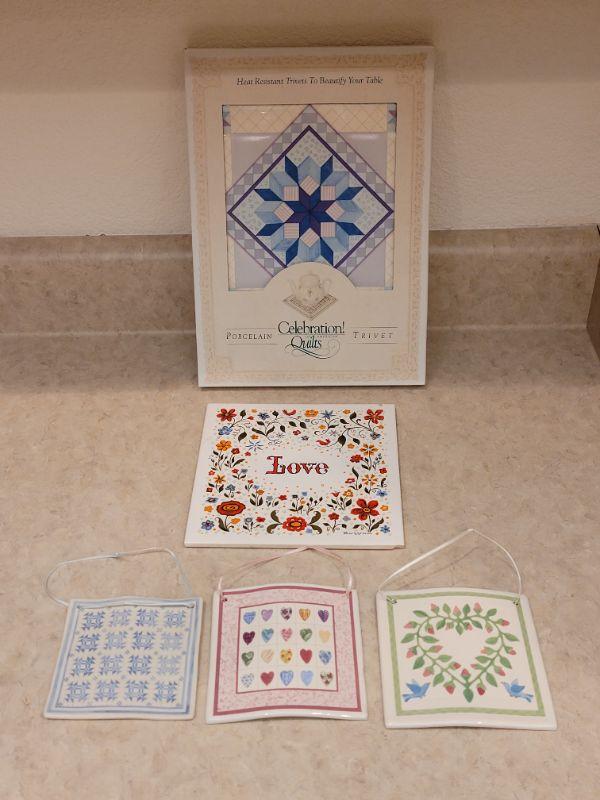 Lot 9: New Celebration Quilts Porcelain Trivet, Vintage Love Trivet & (3) Ceramic Quilt Hanging Deco