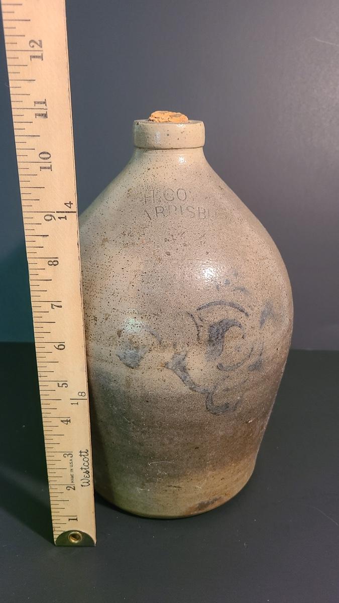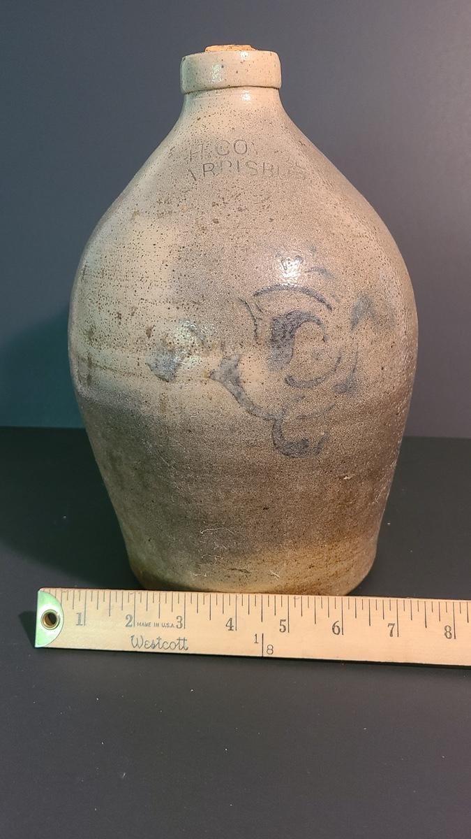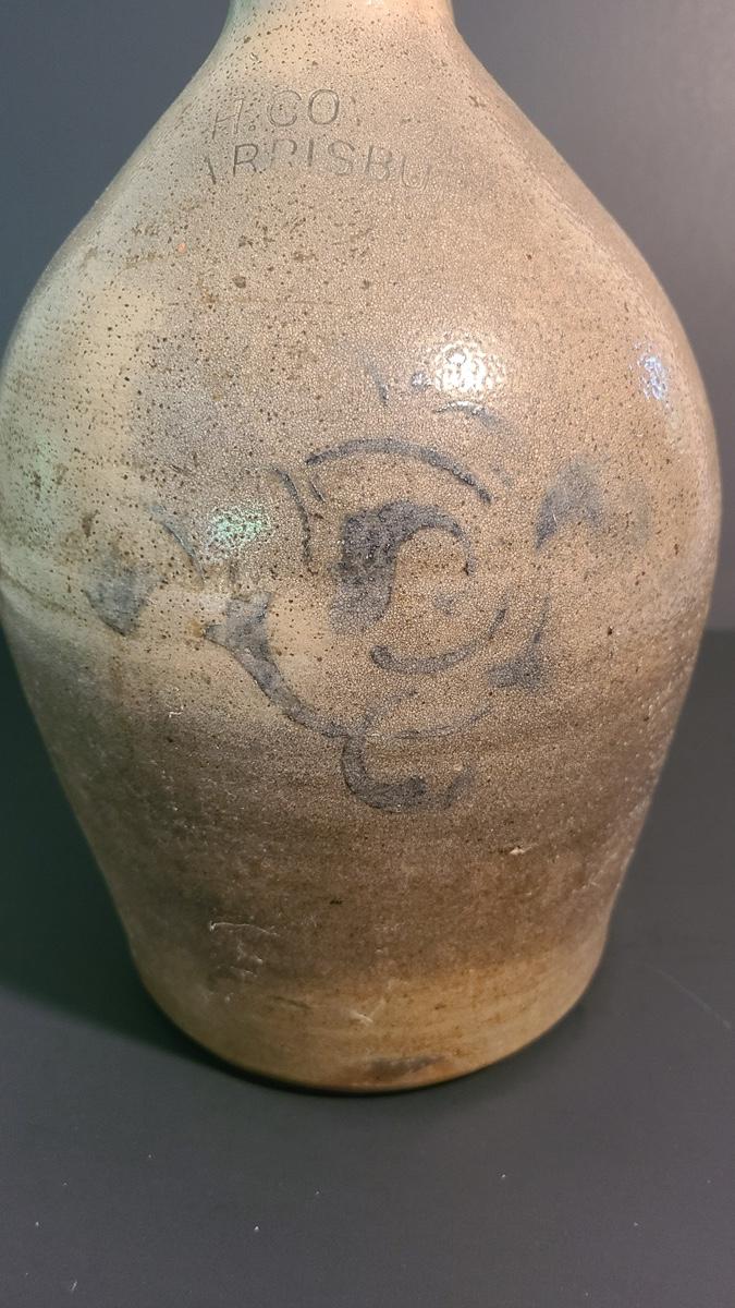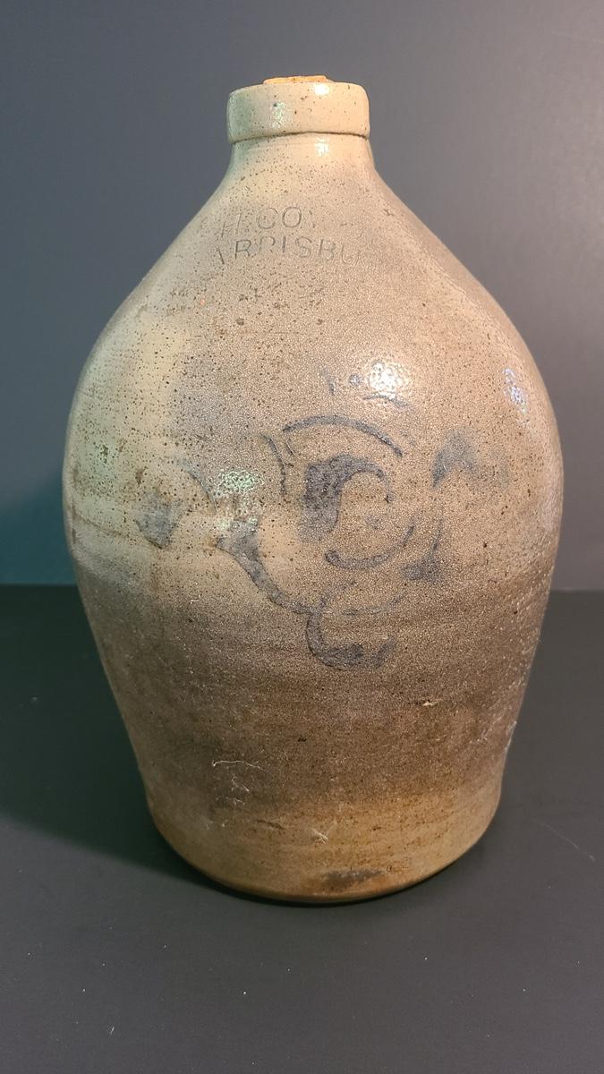 This is a beautiful jug signed FH Cowden Harrisburg stoneware jug, but due to an incomplete stamp mark, the F is missing and so is the H in Harrisburg. It is has a primitive decoration on front stenciled in cobalt. This jug is in amazing condition for its age, with normal surface wear, but no noted chips or cracks. Pictures are the best representation of the item in the lot, the condition of the items in the lot, and the size if measurements were taken. All items are sold as-is, since they are pre-owned and antiques. We are not experts and do our best to describe and pictures have been taken from every angle. Thank you for looking and have fun bidding.