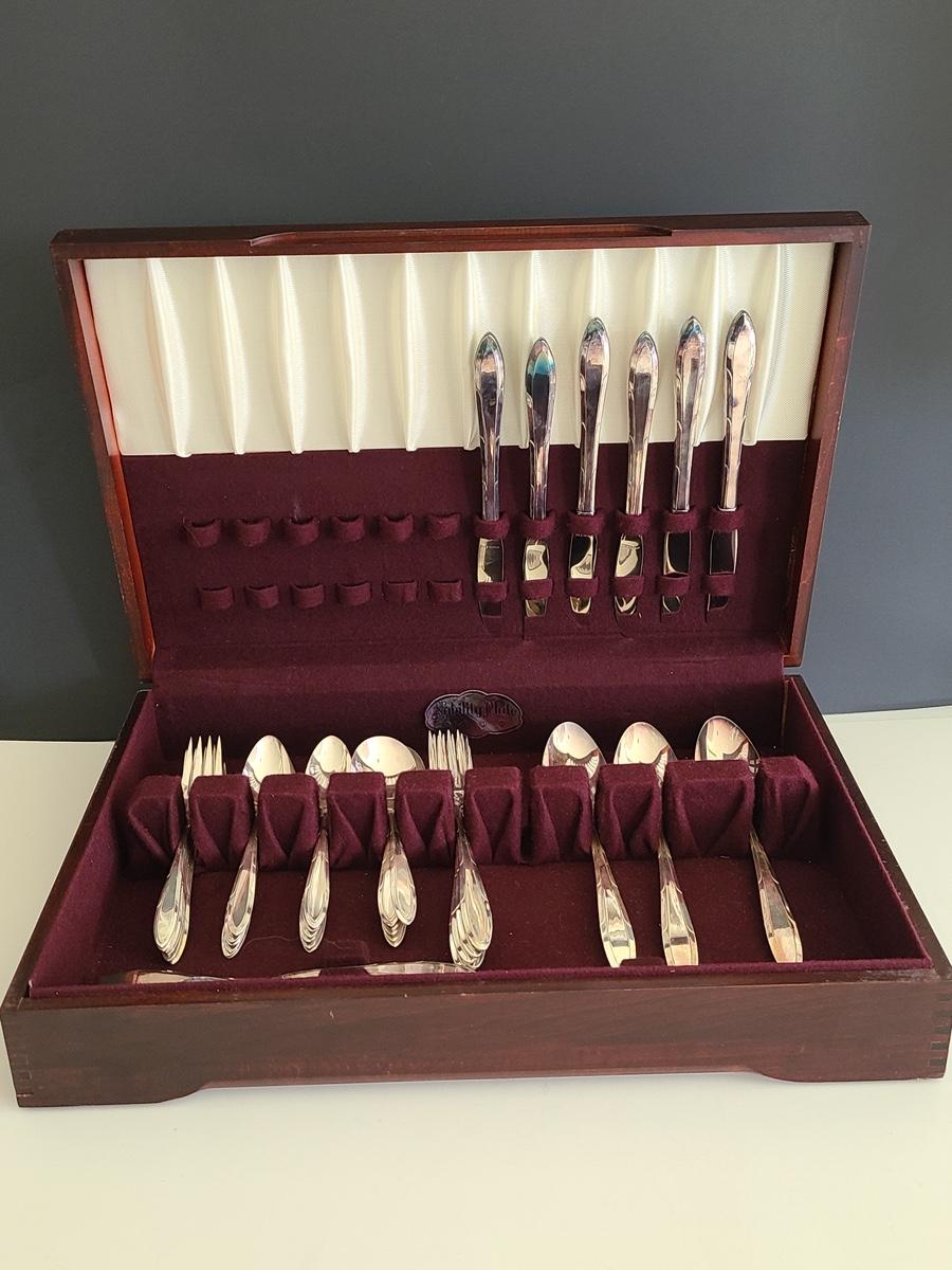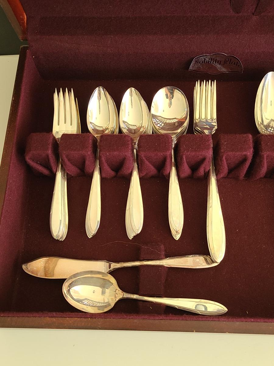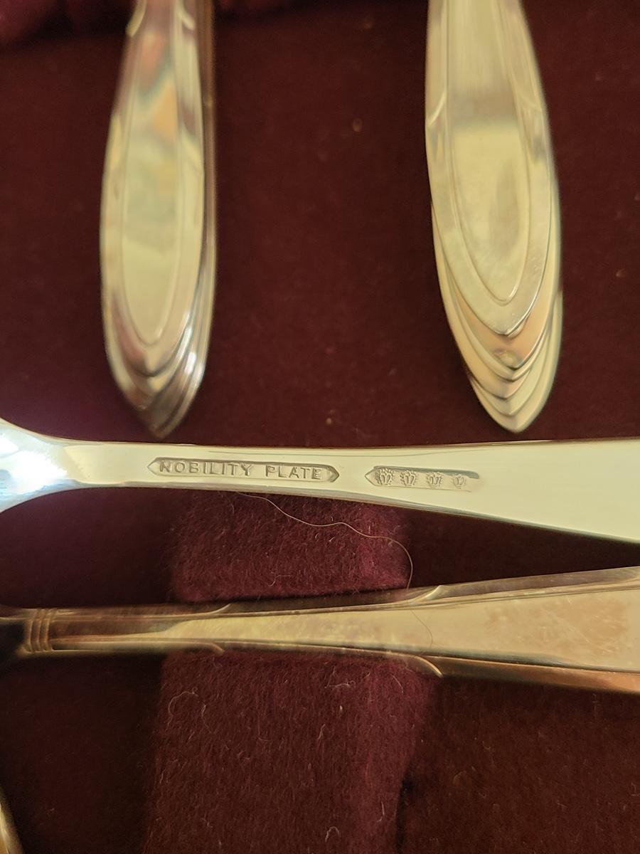 This boxed set of "Nobility Plate" has enough for a place setting for four with extras. Please see all pictures for content of the lot, condition of the lot, and measurements if taken. Pictures are the best representation of the items listed and items are untested unless indicated in description. Thank you for looking and have fun bidding![