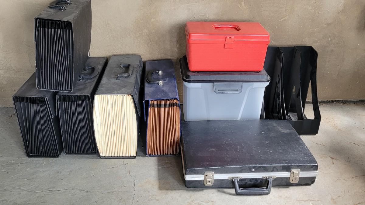 Lot 9: Accordian File Boxes, Plastic File Box, Red Organizer Box, Magazine Holders and a Vintage Briefcase