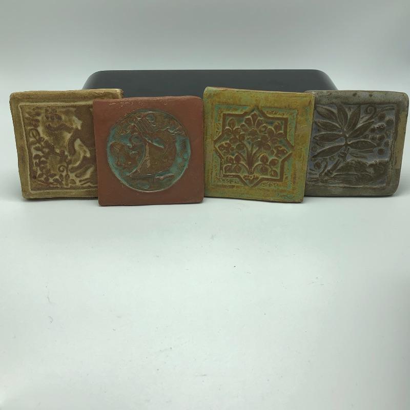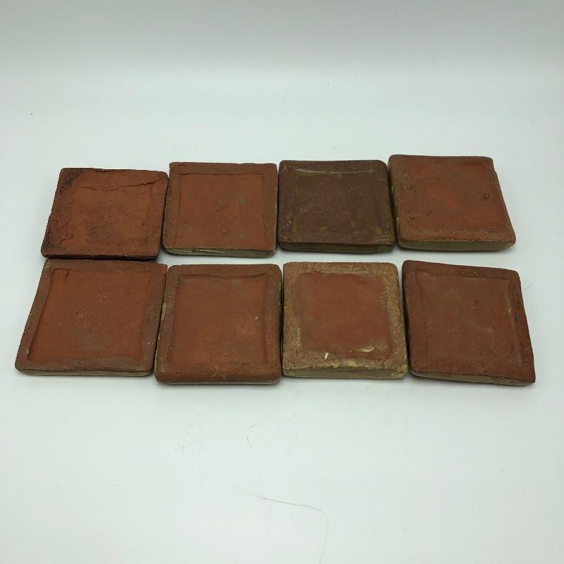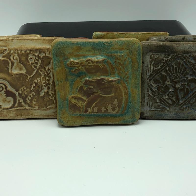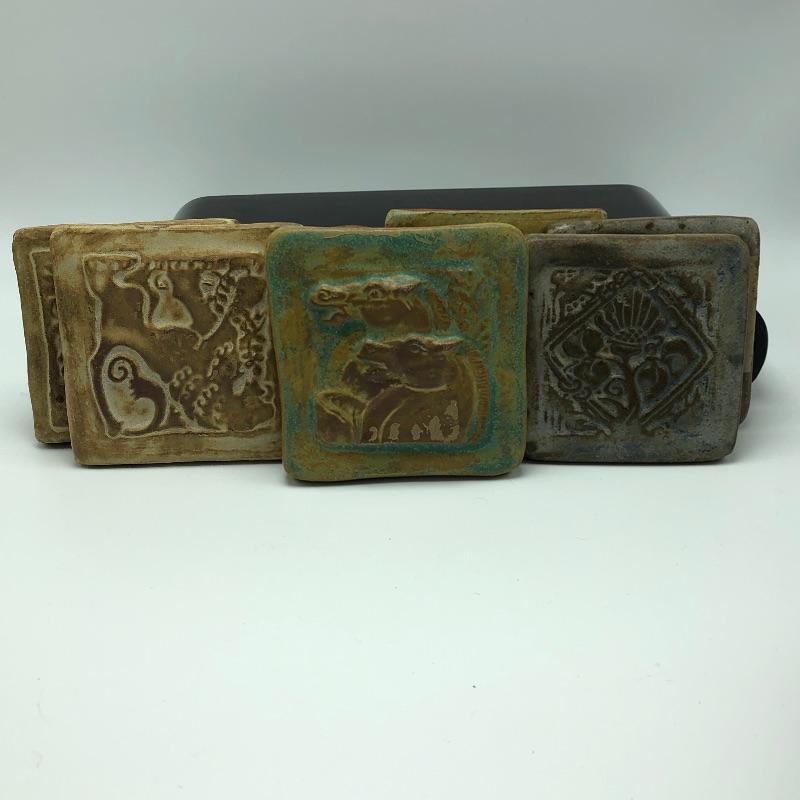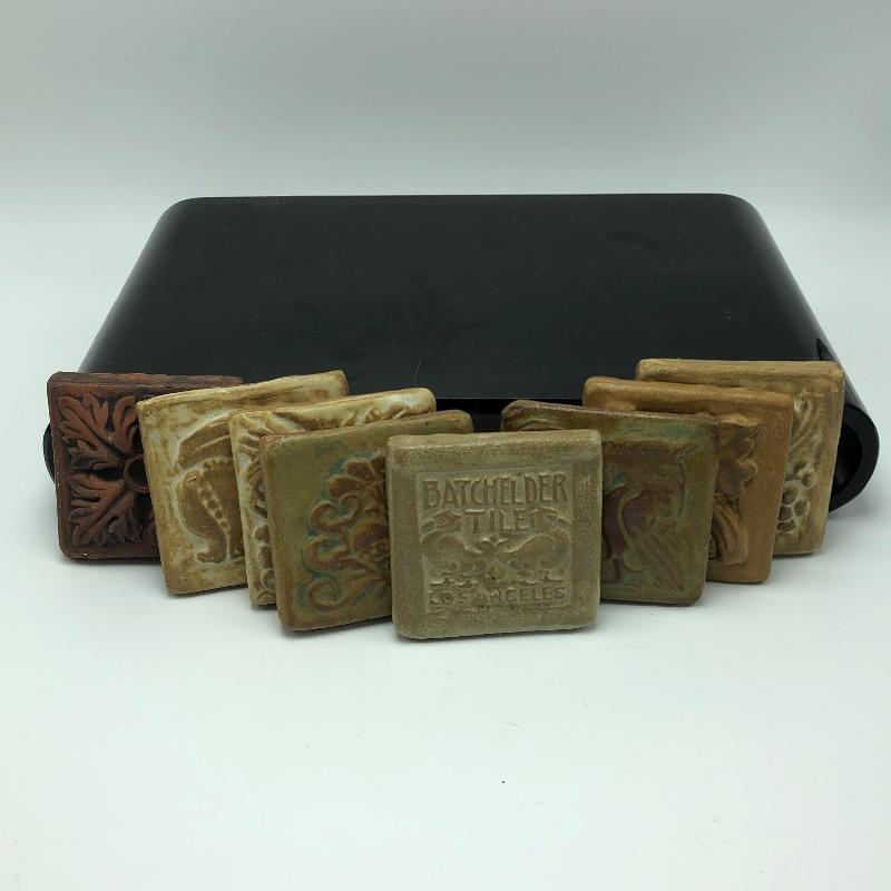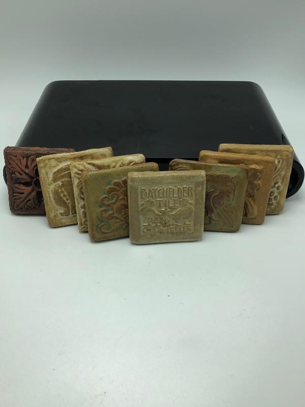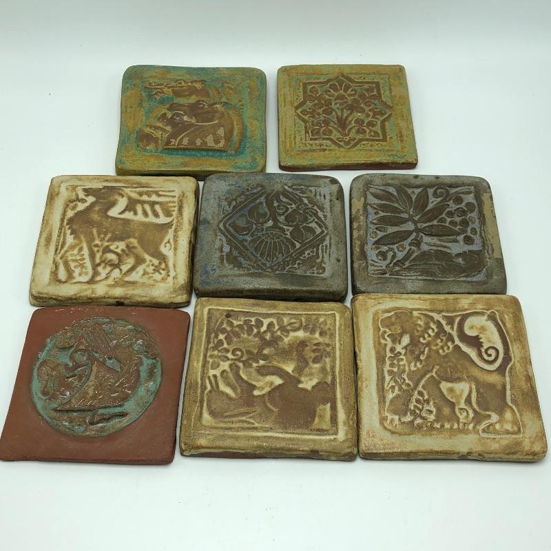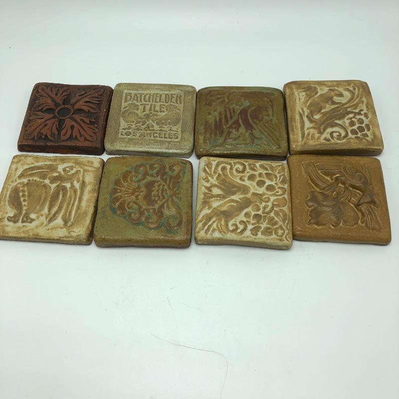 Eight 2” x 2” Batchelder tiles in several patterns. Each tile will stand on its own as well as in a mosaic arrangement. There are eight 4” x 4” tiles, eight 2' x 2" tiles and one 7” x 7” tile with similar designs.