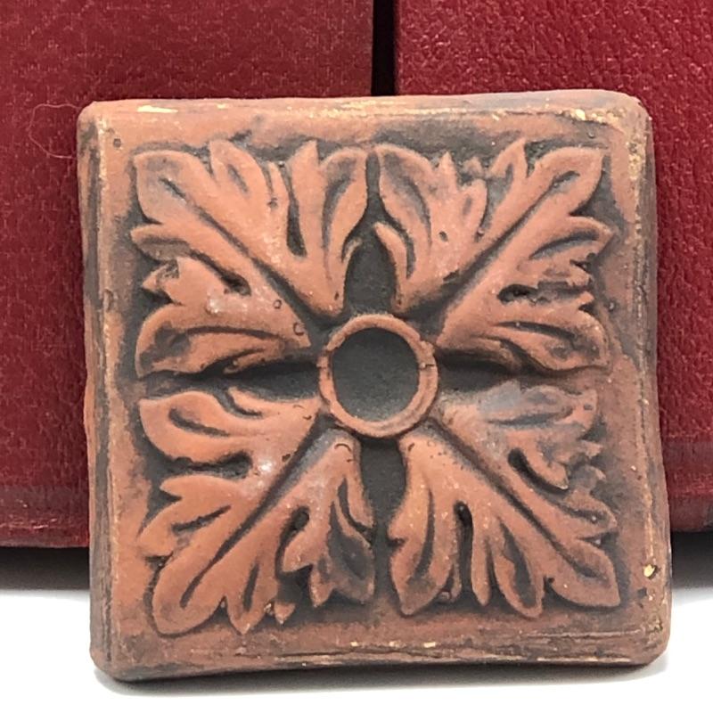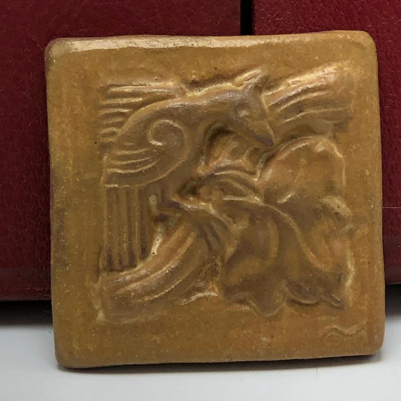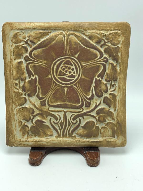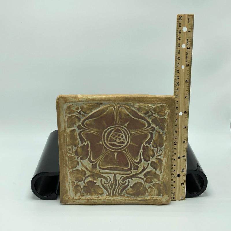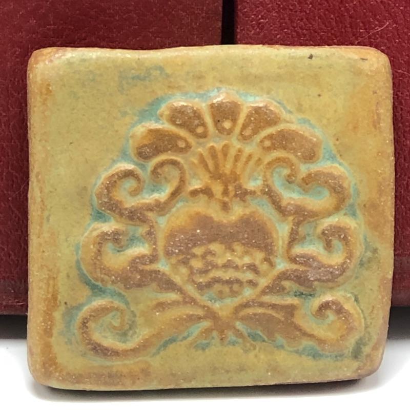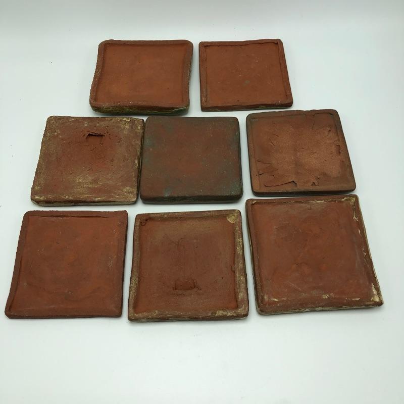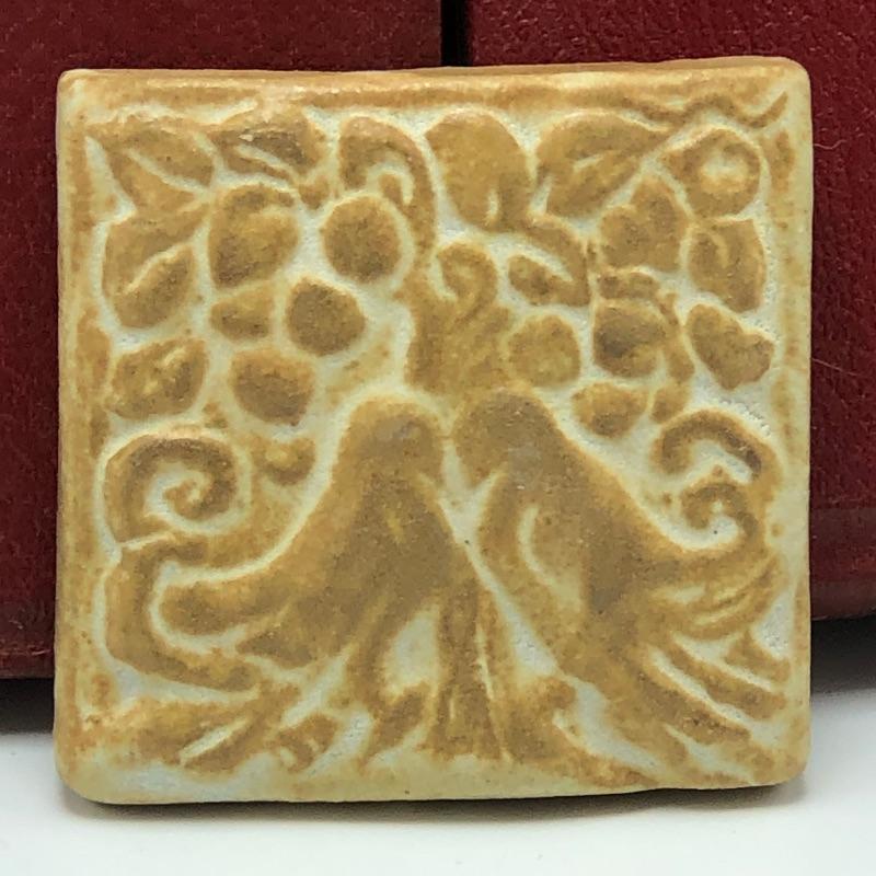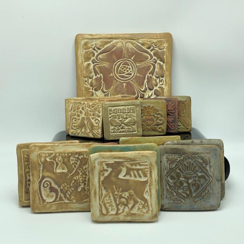 Eight 2” x 2” Batchelder tiles in several patterns. Each tile will stand on its own as well as in a mosaic arrangement. There are eight 4” x 4” tiles, eight 2' x 2" tiles and one 7” x 7” tile with similar designs.