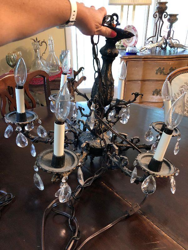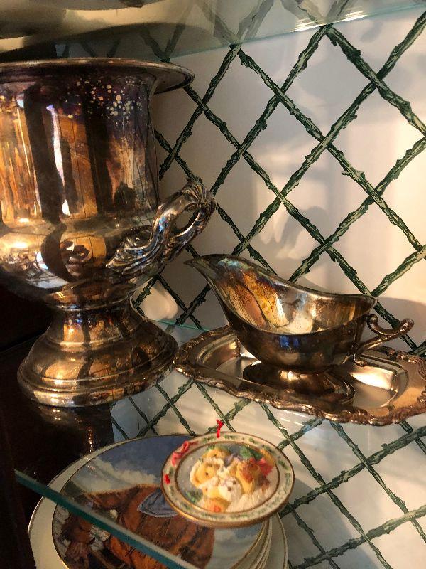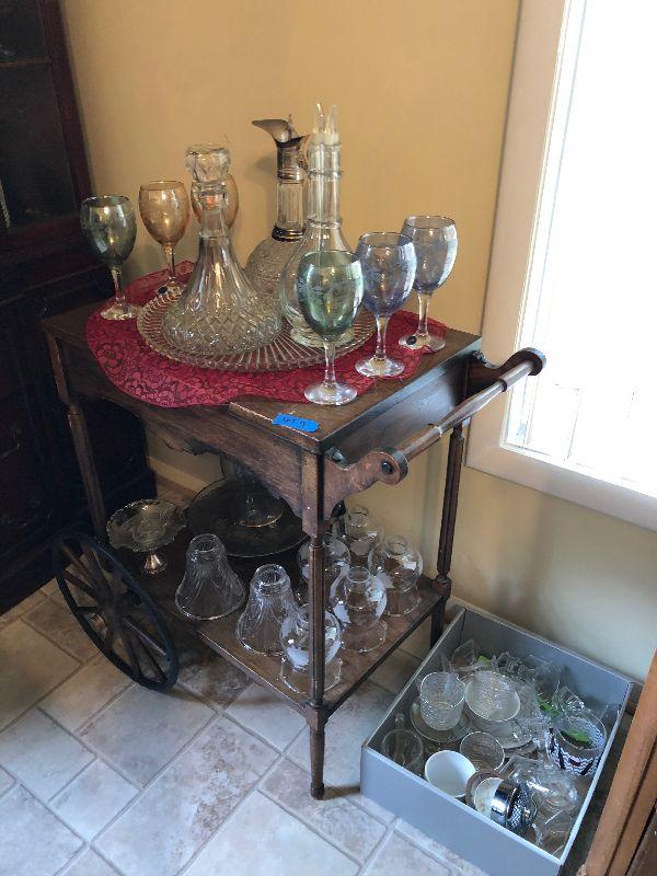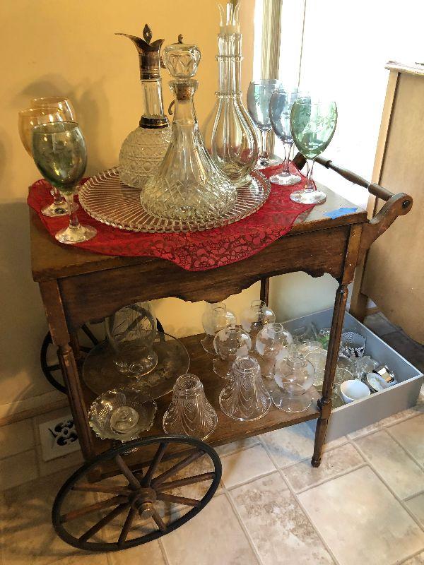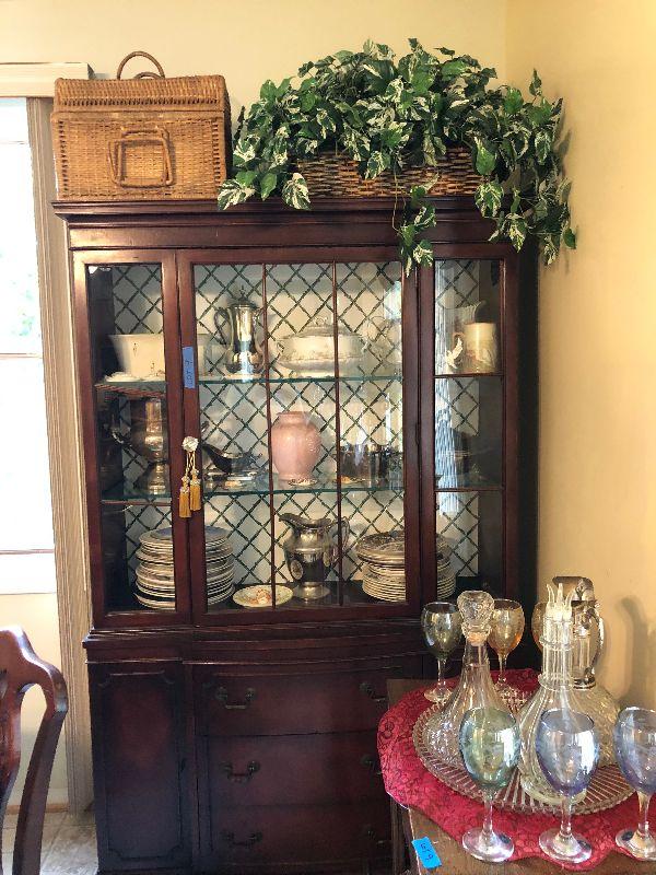 48" Round dining table on wheels with 2 sets of chairs, chandelier, Lighted China Closet, wood teat cart and other miscellaneous items.