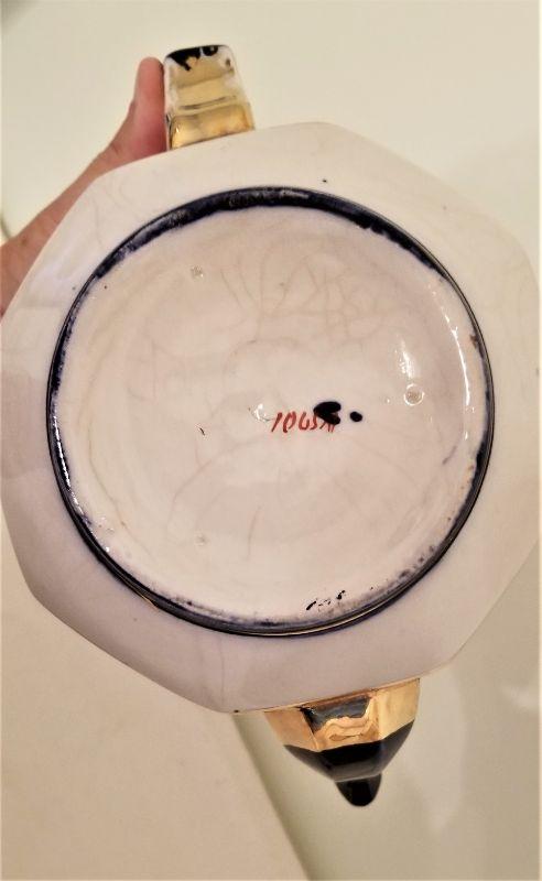 Though unmarked, this teapot of typical of the type made in England by Mason's Ironstone for the British market. Nice Asian styling, deep cobalt blues - a classic! Some age-related crazing. Measures 10" handle to handle, 6.5" tall.