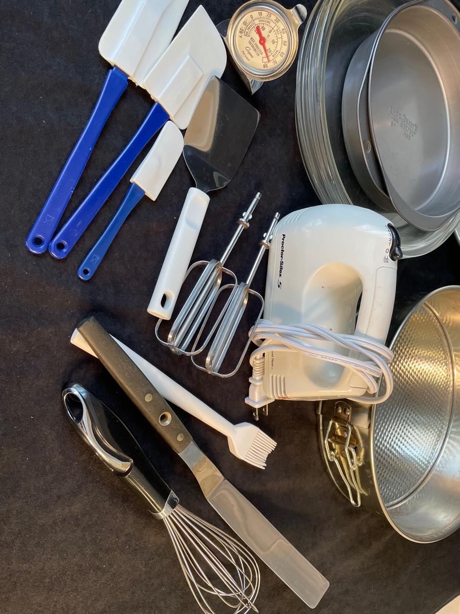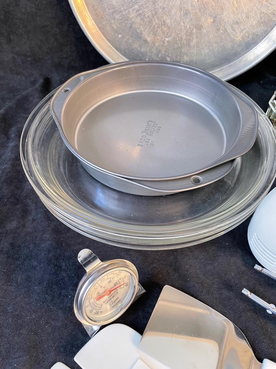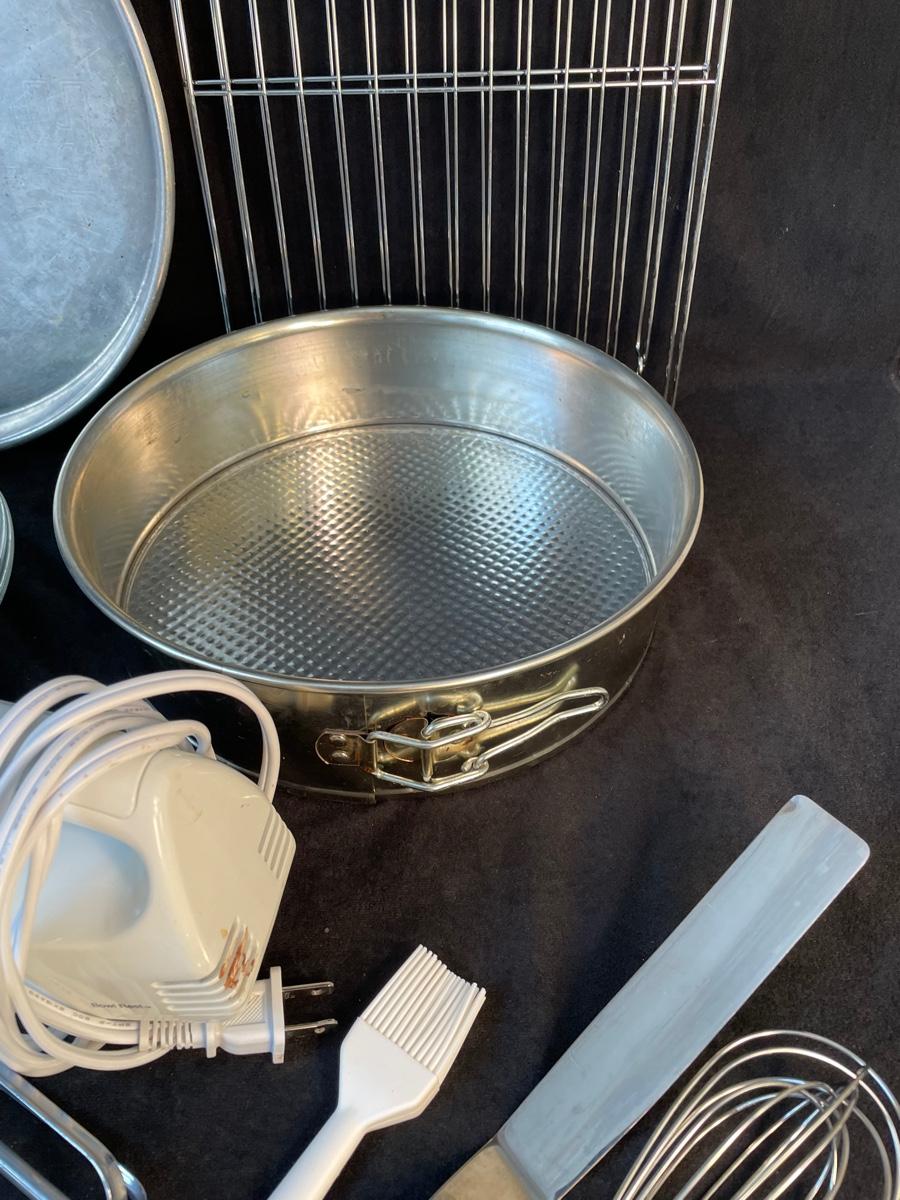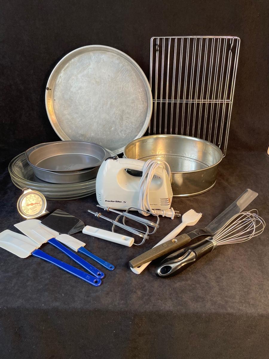 Hand mixer, spring form pan, tart pan, 2 round cake pans, 3 glass pie plates, 2 cooling racks, oven thermometer and utensil assortment