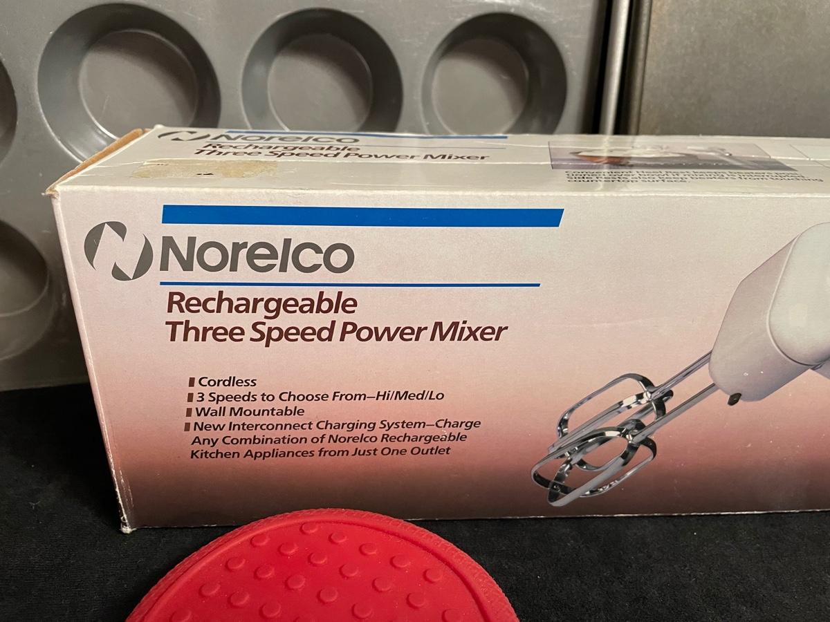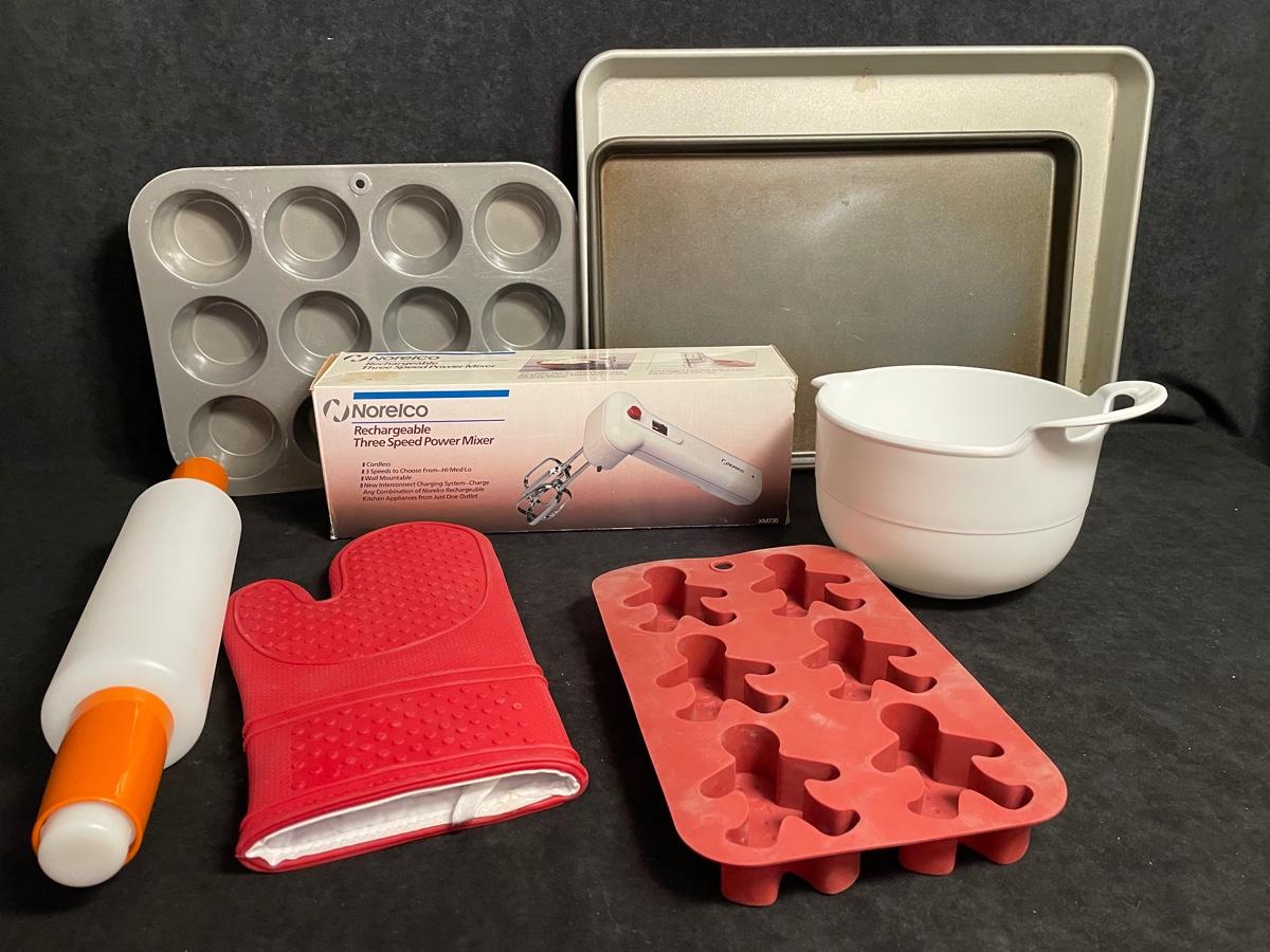 2 cookie sheets, Norelco hand mixer, mixing bowl, plastic rolling pin, silicone oven mitt, cupcake pan, silicon mold
