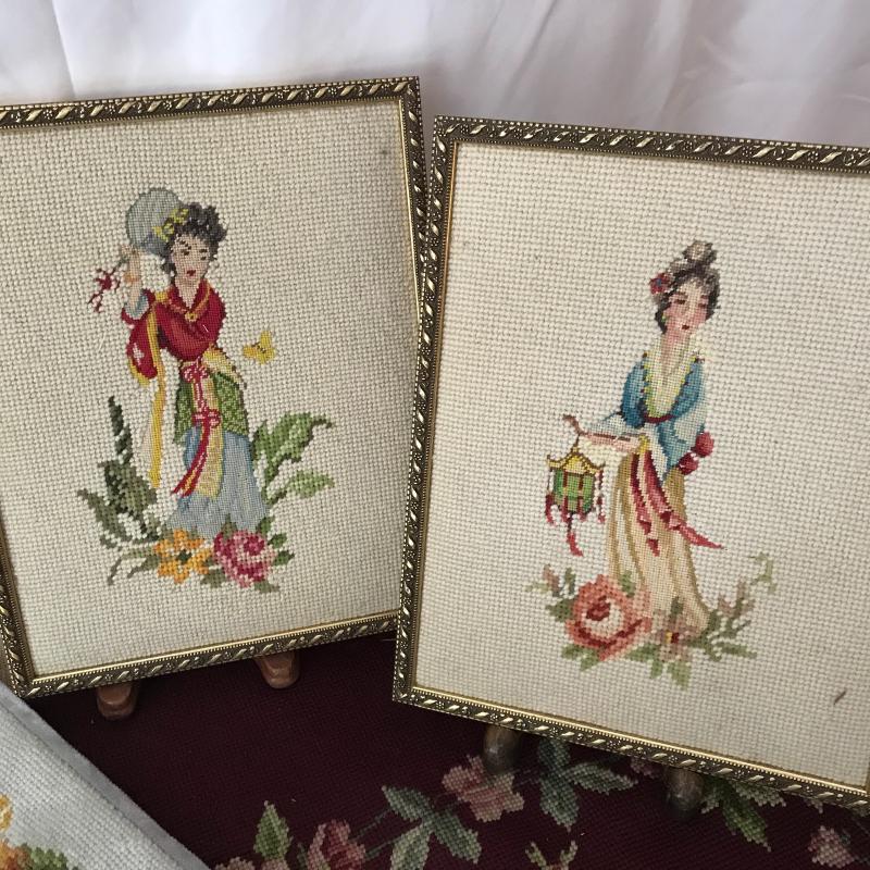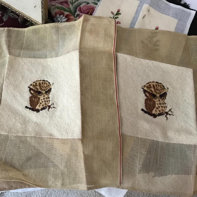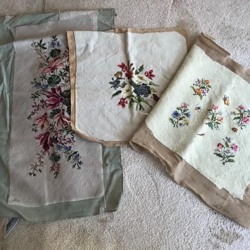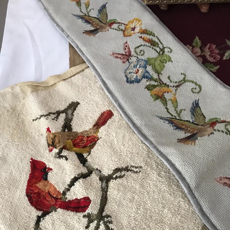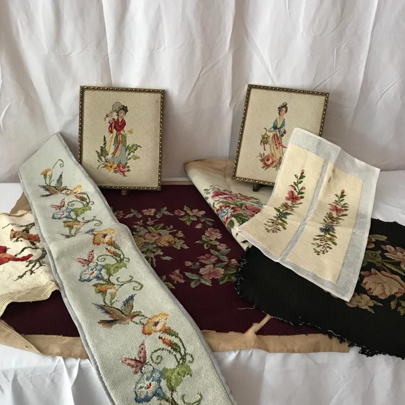 Unique lot of approx 15 flower and woodland animal needle point pieces. Framed pieces are 9.5”x11.5, Largest is 22.5”x37” and finished long/thin piece is 7.5x43”. Shipping available.