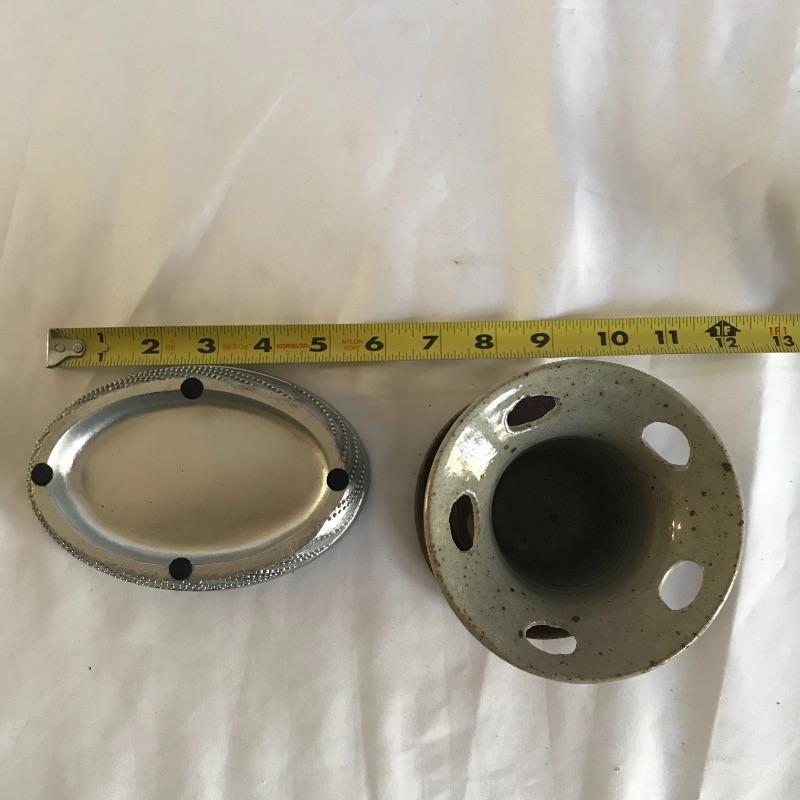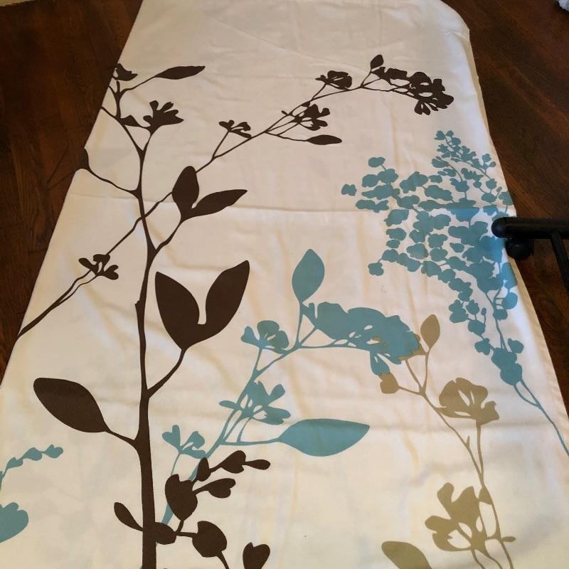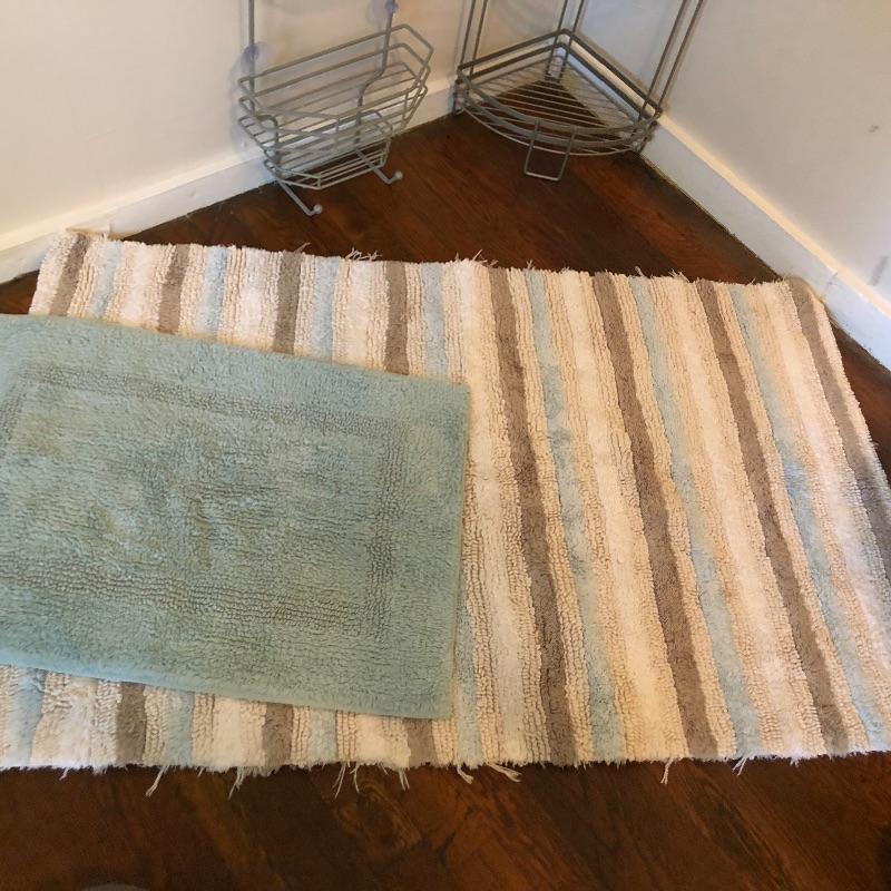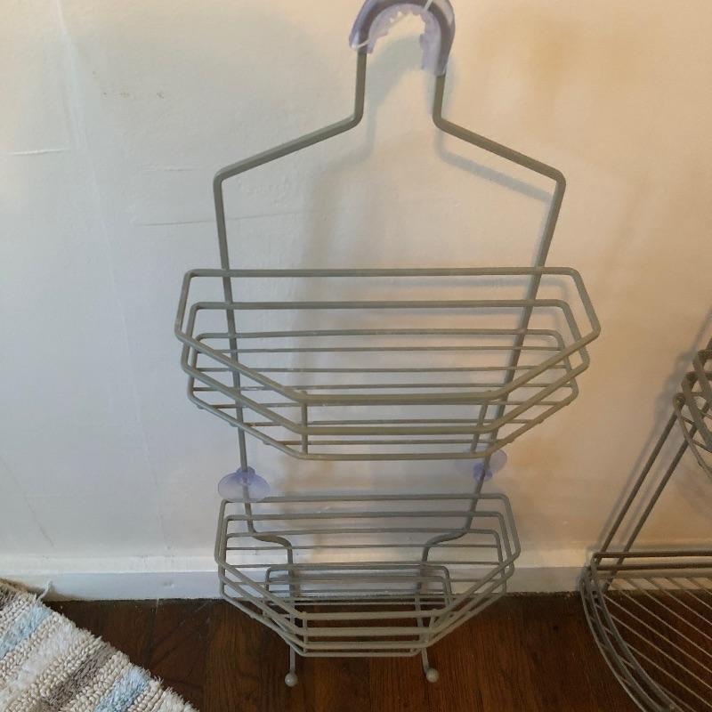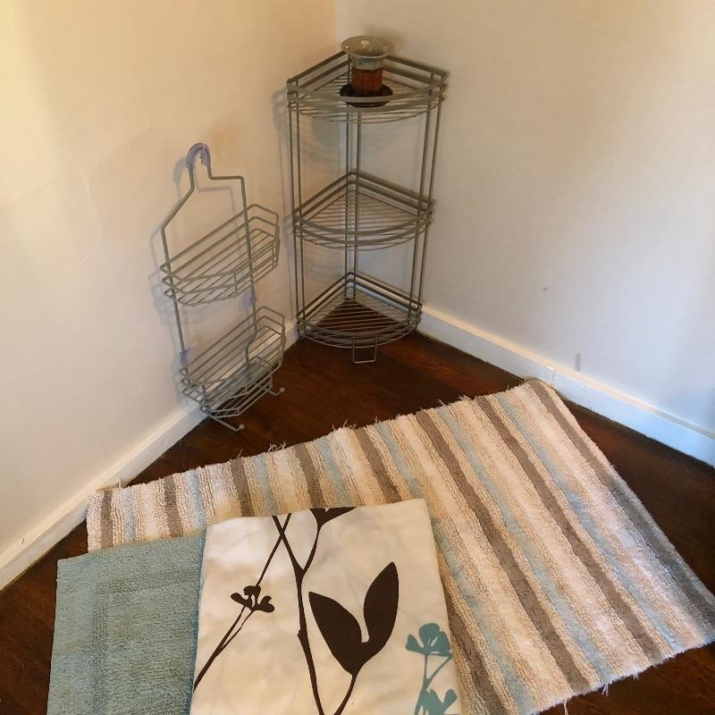 An almost complete bathroom setup here minus the towels which are in Lot 11. Blue and brown is the color theme for the shower curtain and bath mats. The ceramic stoneware toothbrush holder compliments the lot well. A shower caddy and a small corner shelf are also included in a brushed nickel. Lastly, 6” ceramic-like silver painted soap dish.