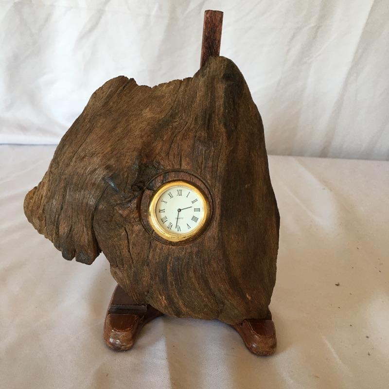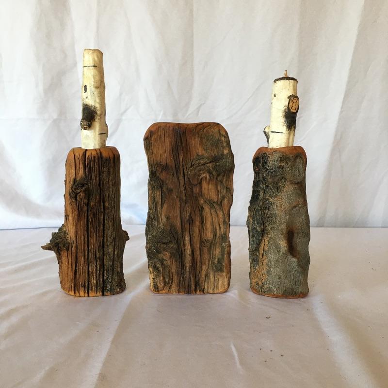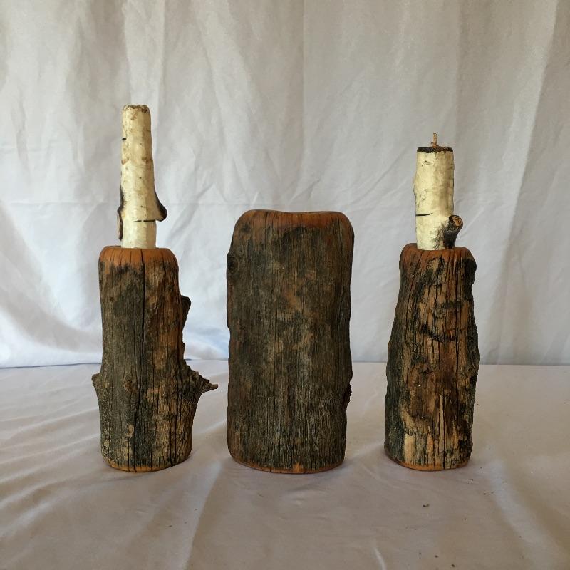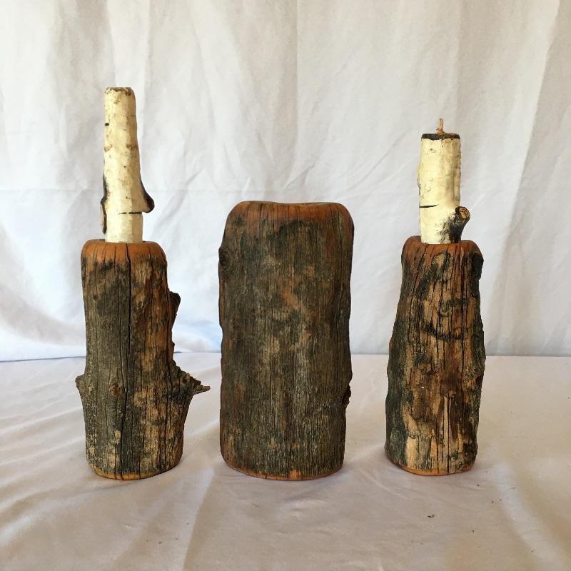 This natural looking lot would be great in your cabin and includes two branch shaped lamps with shades, three wooden candle holders and a wooden wall hanging clock. The lamps