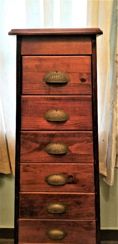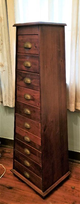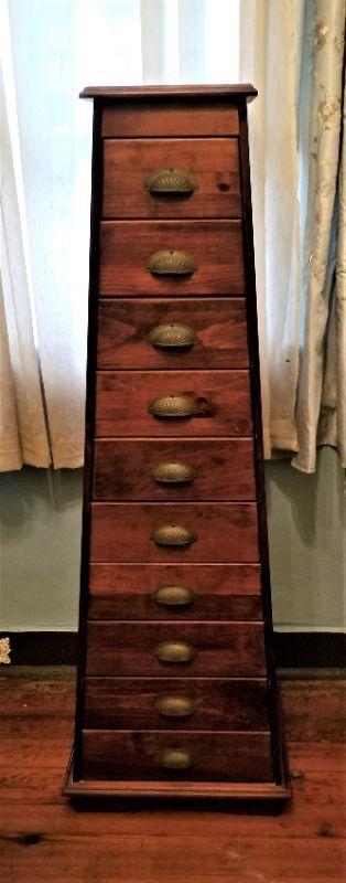 Good looking contemporary Mission style 10 drawer chest - pyramid style. Brass hardware. Good used condition. Heavy 59" tall. 16" deep at the base. 12" wide at top, 20.5" wide at base.