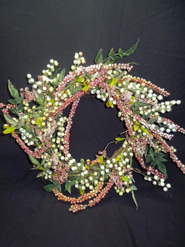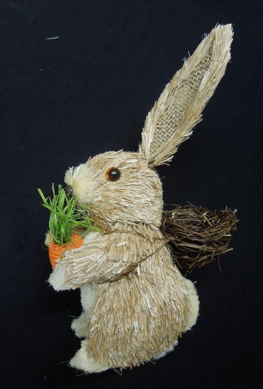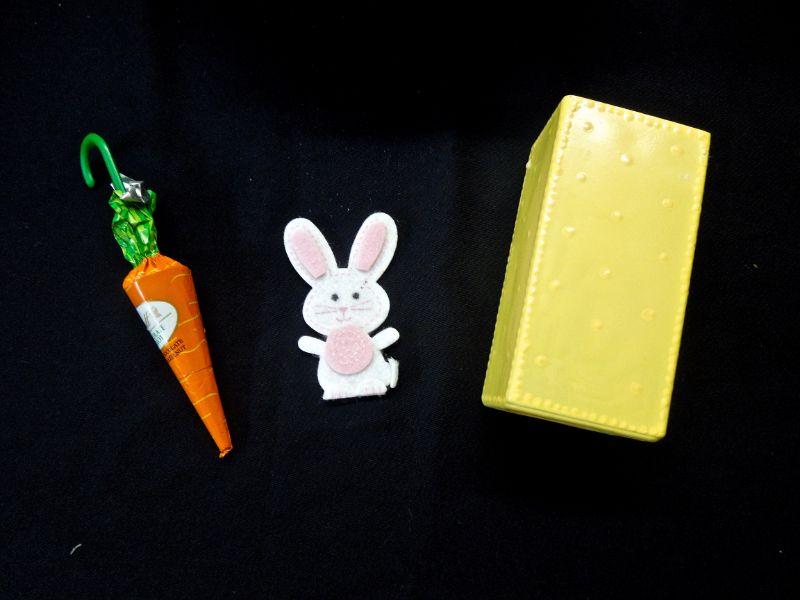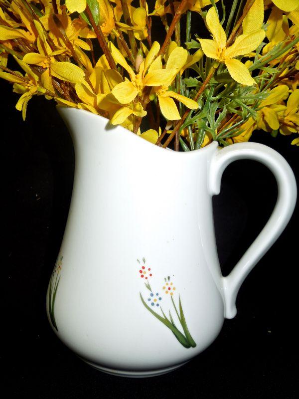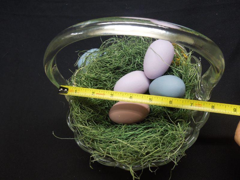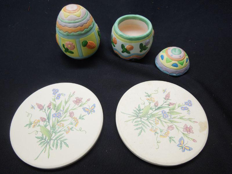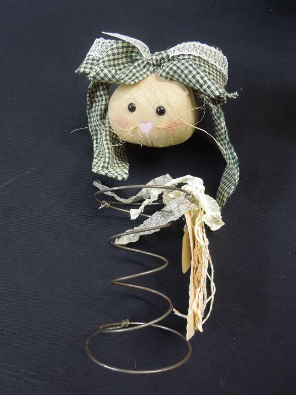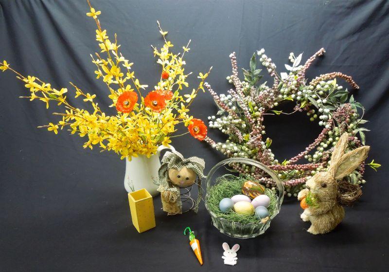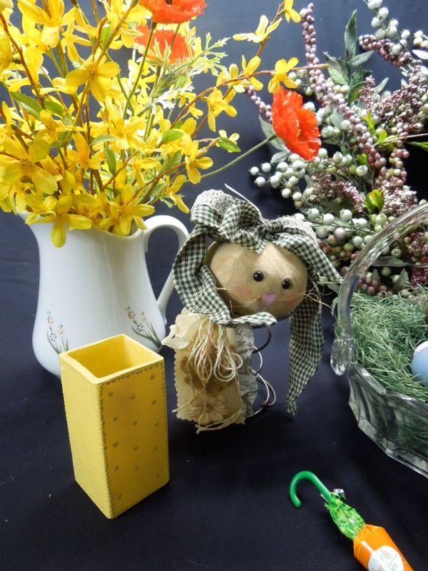 Nice rafia style covered easter bunny, glass easter basket with resin and plastic colored eggs, a ukranian hand painted egg, a mauve and light green berry wreath, silk forsythia in a white pitcher vase, a bedspring inspired she-rabbit, a small yellow hobnail glass vase, a pair of votive egg holders, sanstone coasters, and some small things to make life sweeter.