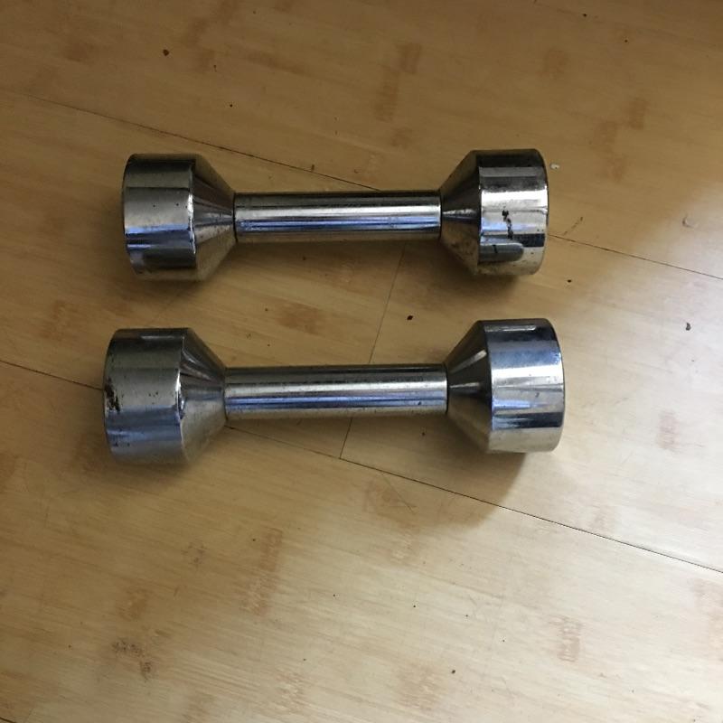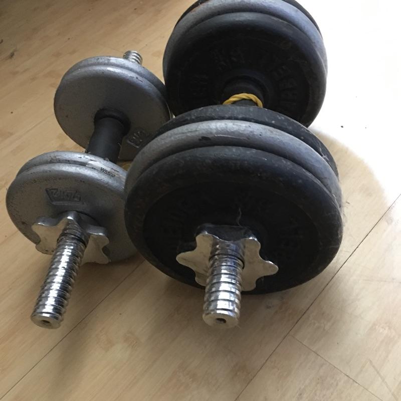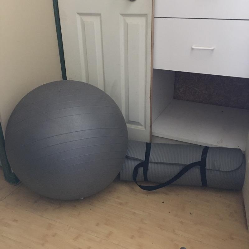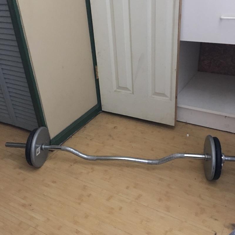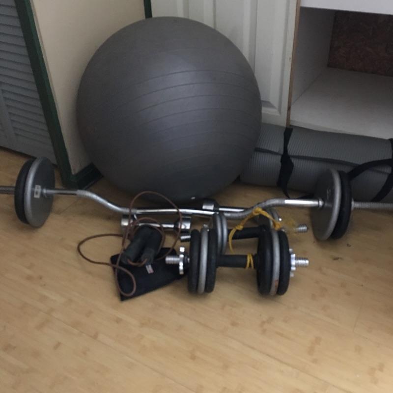 Exercise equipment. Lot includes curling bar, two five pound dumbbells, two adjustable weight dumbbells, exercise ball and mat and two jump ropes. Get yourself in shape in the comfort of your own home. Loose weights add up to 80 pounds.