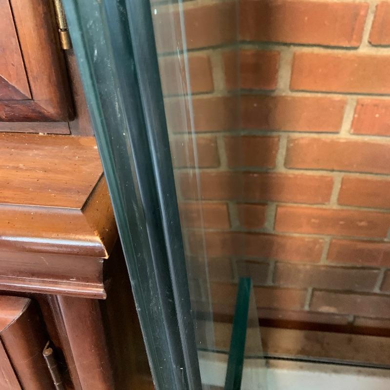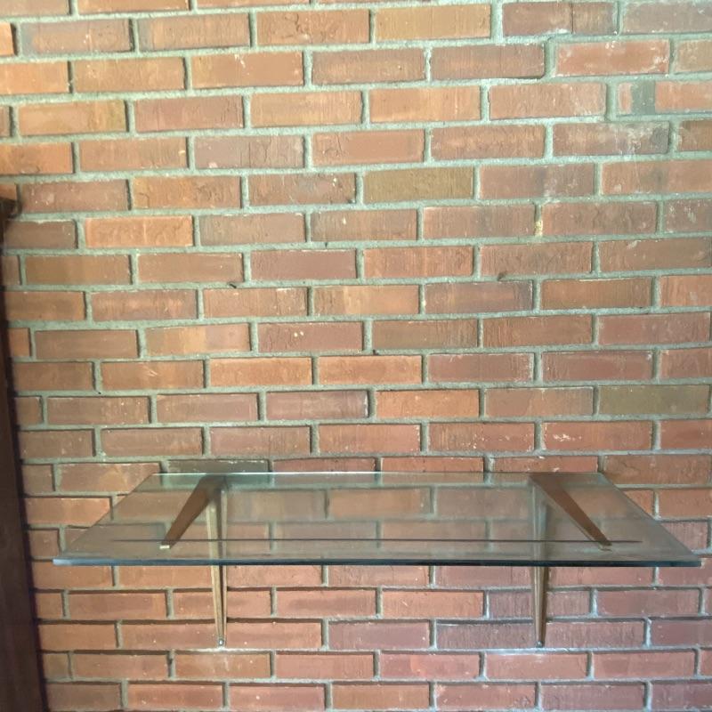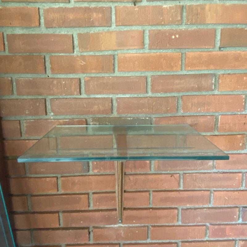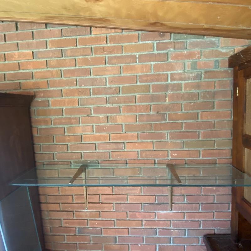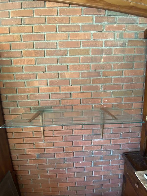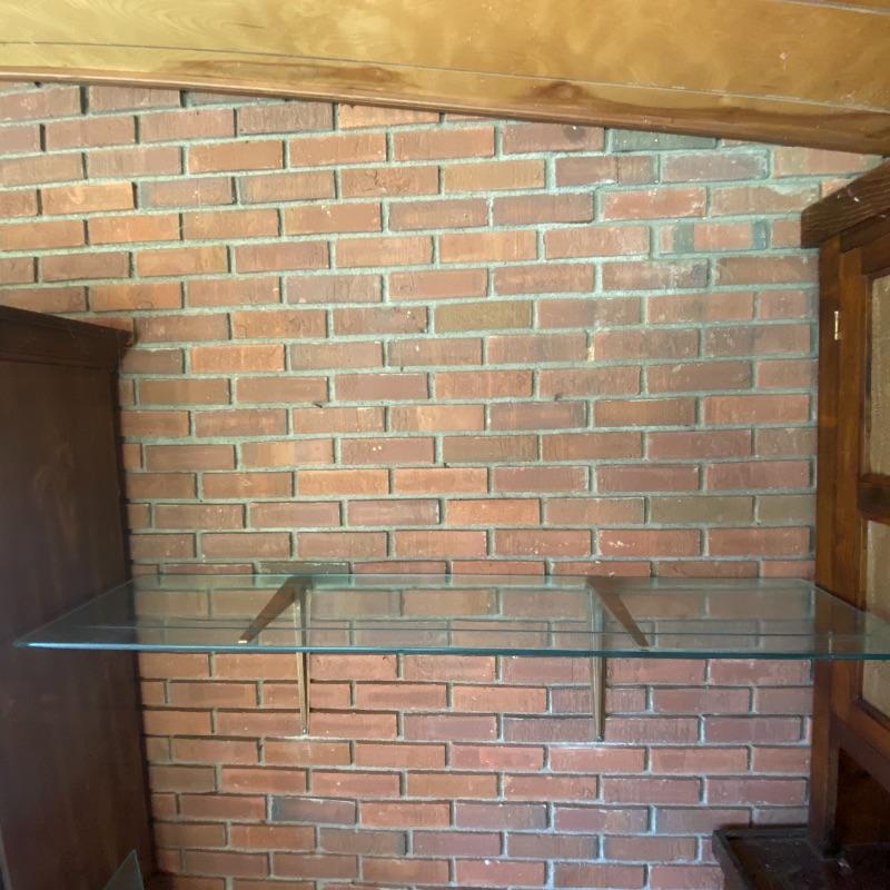 Five glass shelves. Shelf One measures 34.5x13, Shelf Two 36.5x14, Shelf Three 55x12, Shelf Four 55x12 and Shelf Five 17.5x11.5. Two brackets included. Local pickup only