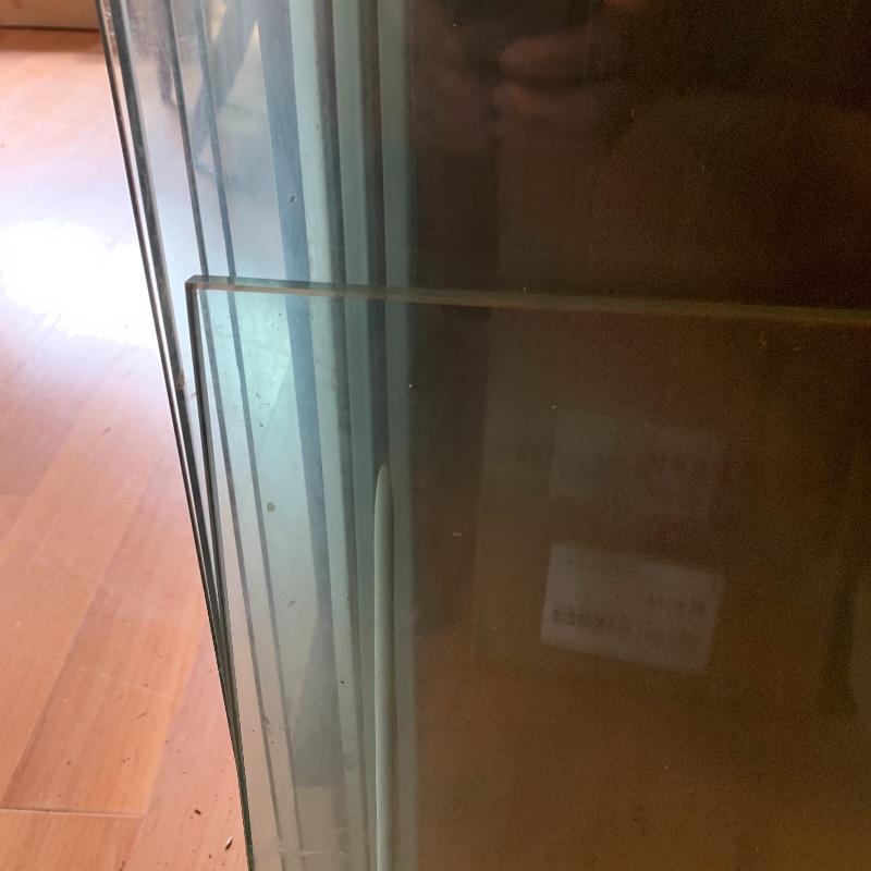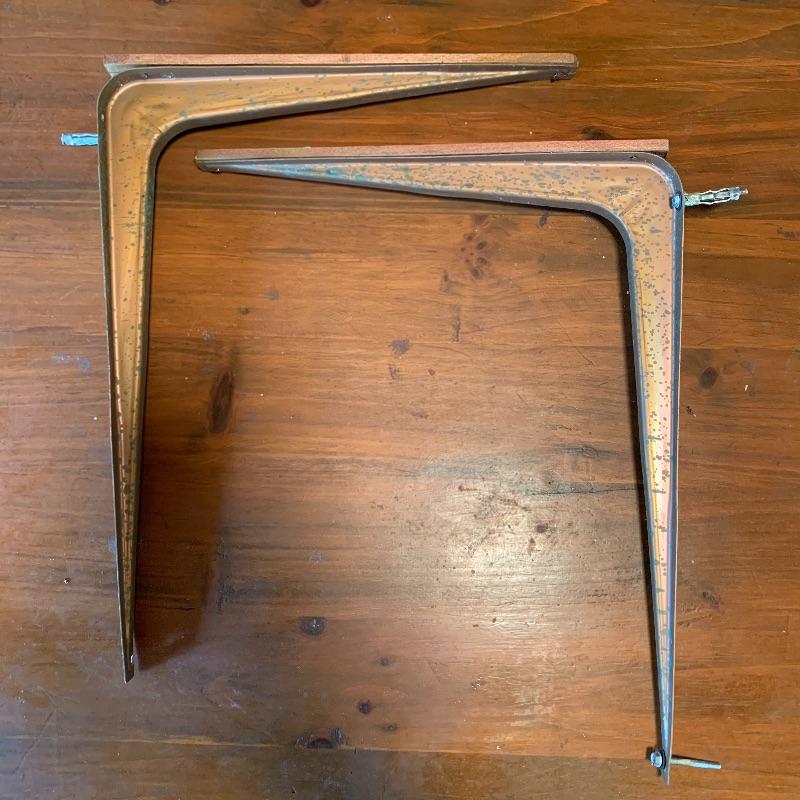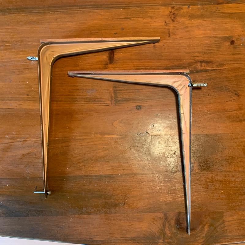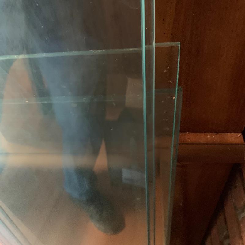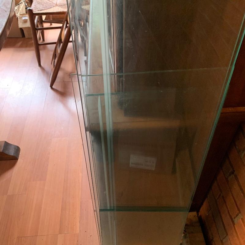 Five glass shelves. Shelf One measures 34.5x13, Shelf Two 36.5x14, Shelf Three 55x12, Shelf Four 55x12 and Shelf Five 17.5x11.5. Two brackets included. Local pickup only