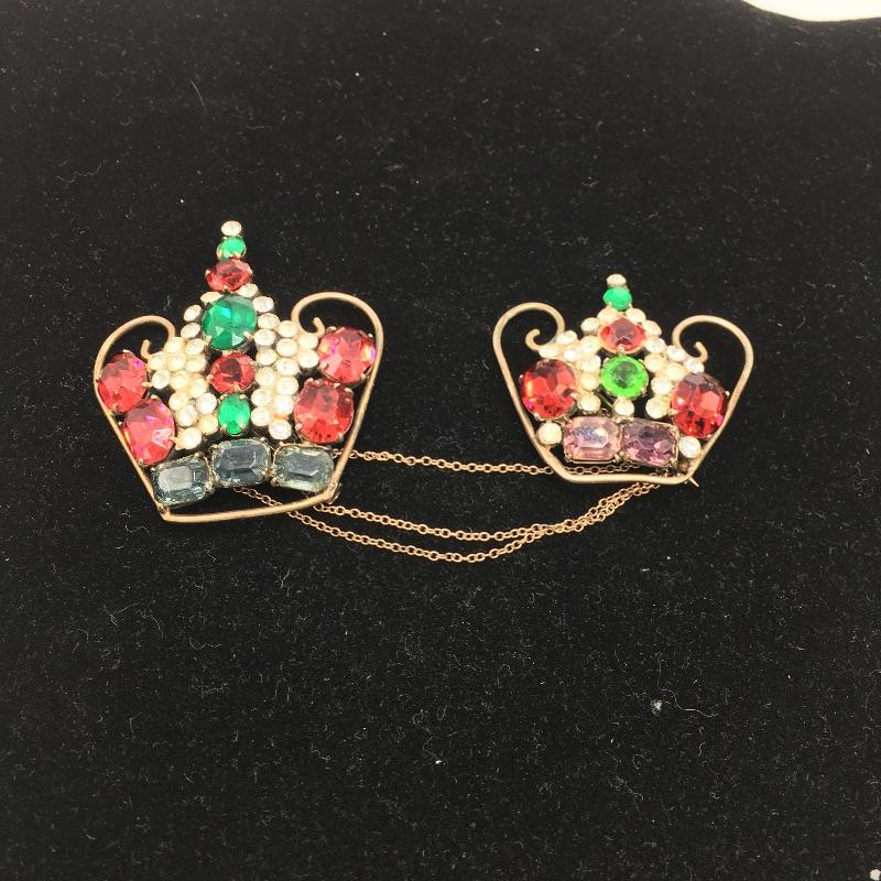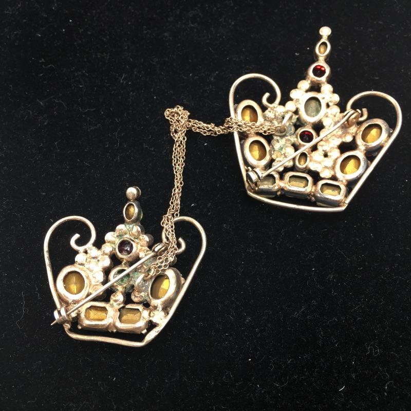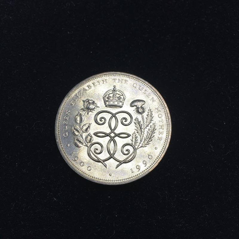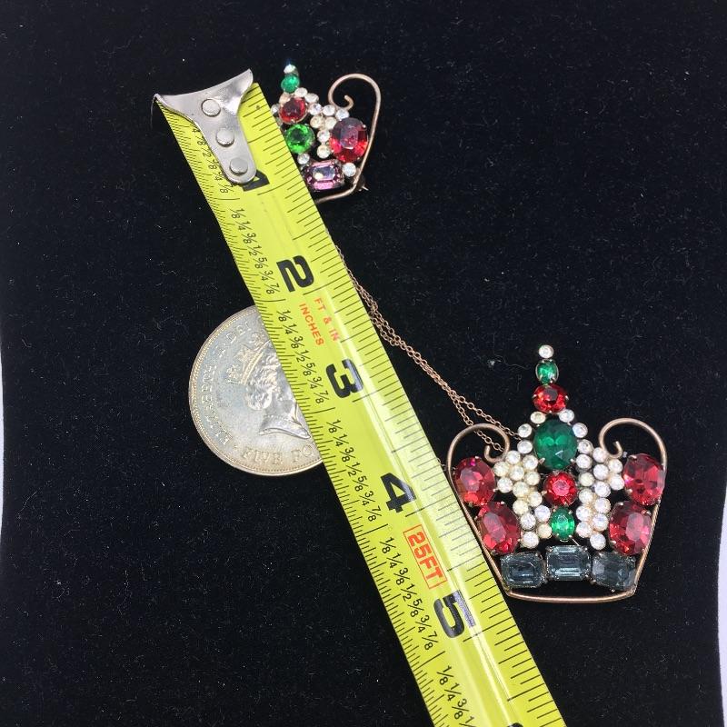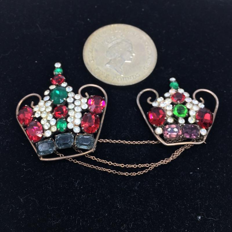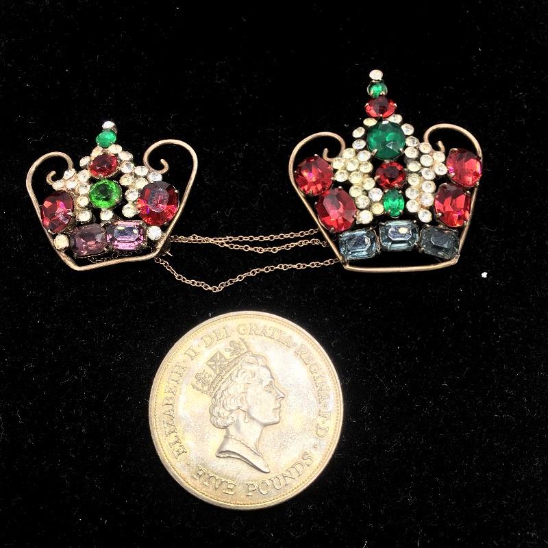 Lot includes and English five pound commemorative coin and two pins in the shape of crowns. The pins have colored stones and a chain connecting them. Coin celebrates the Queen's 90th birthday! A great present for a fan of the British monarchy.