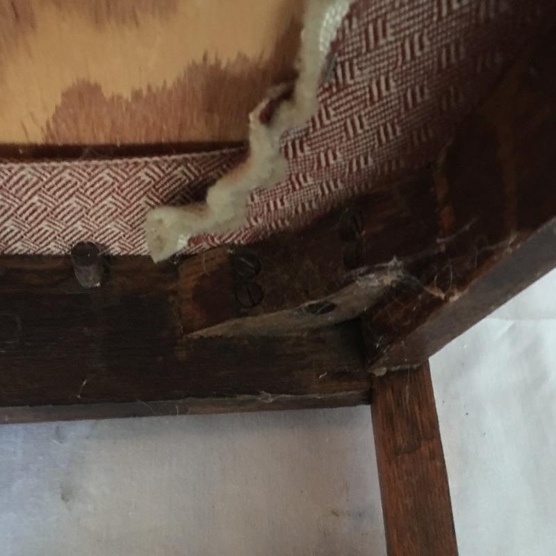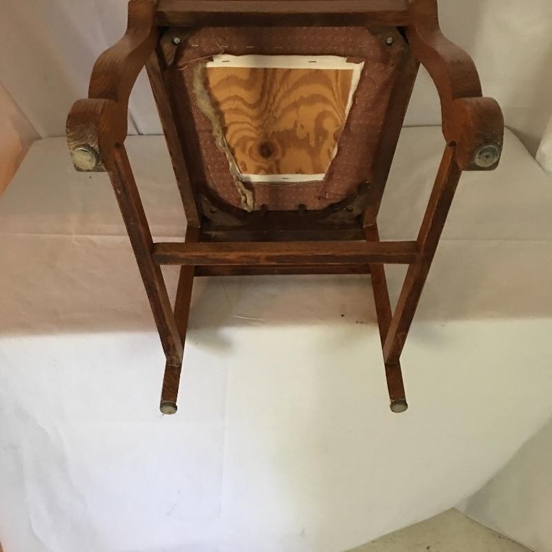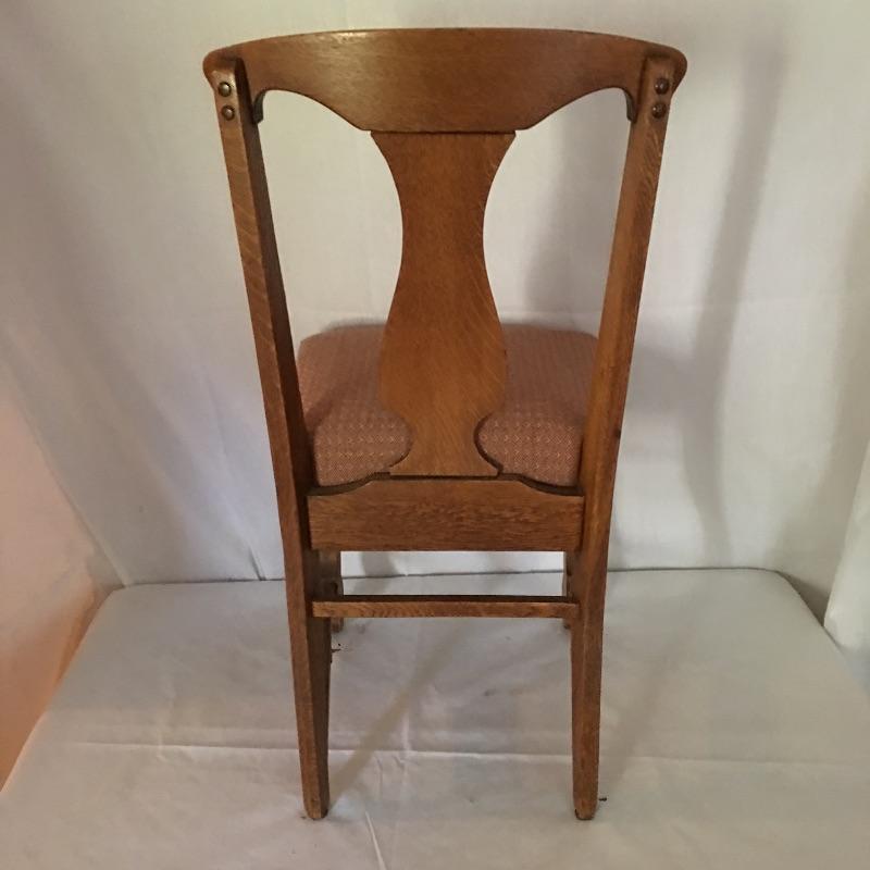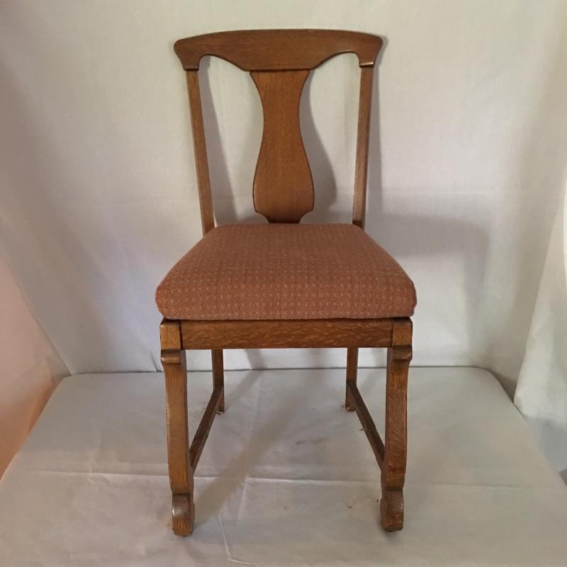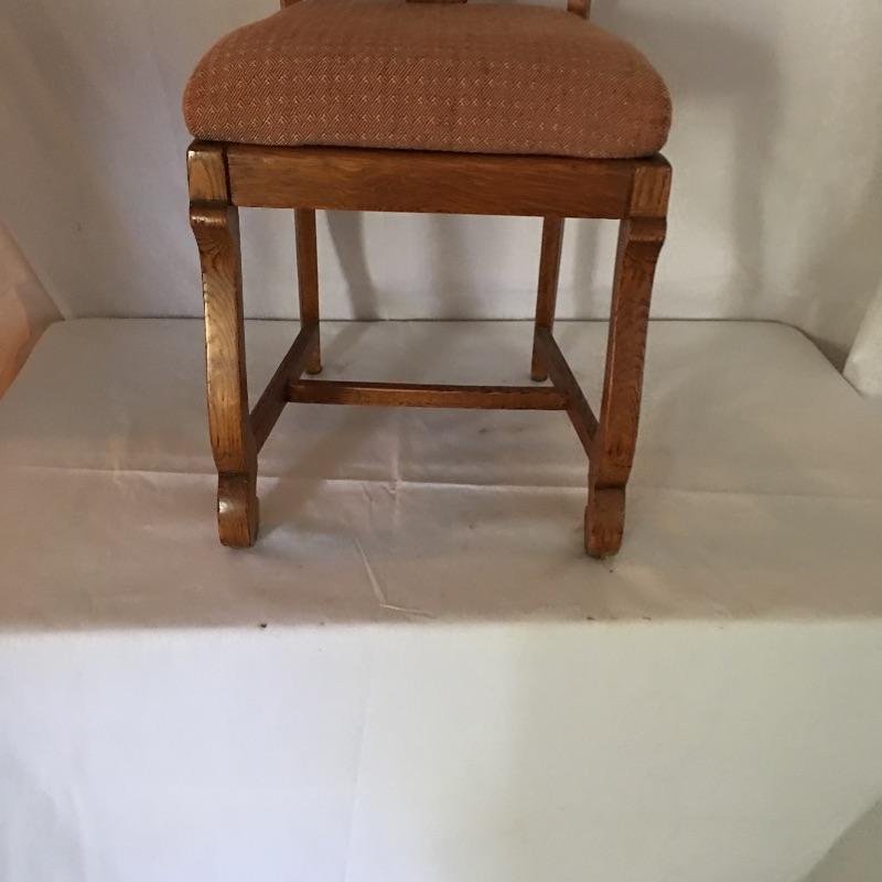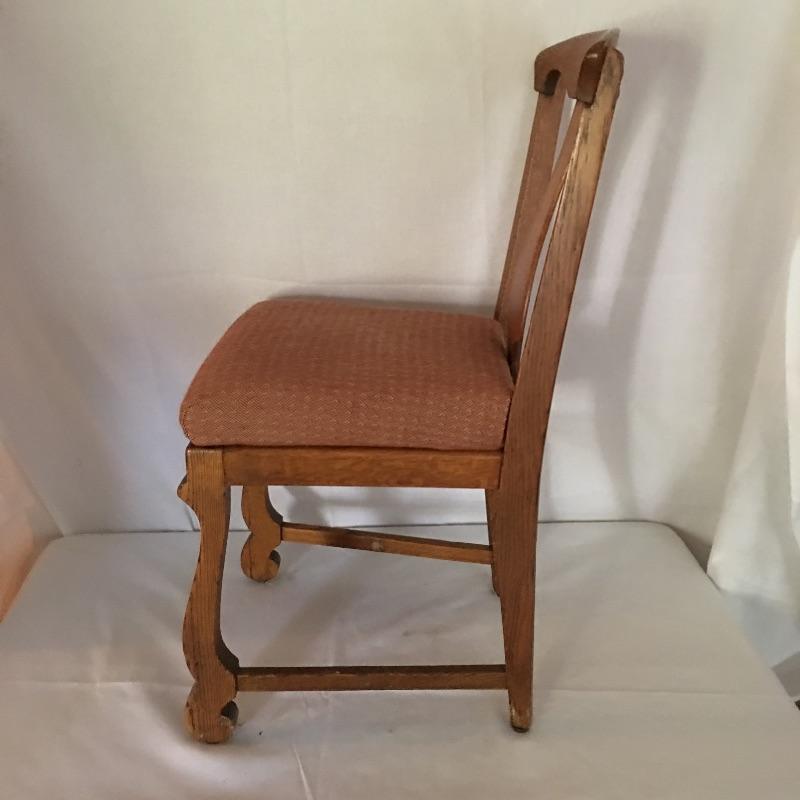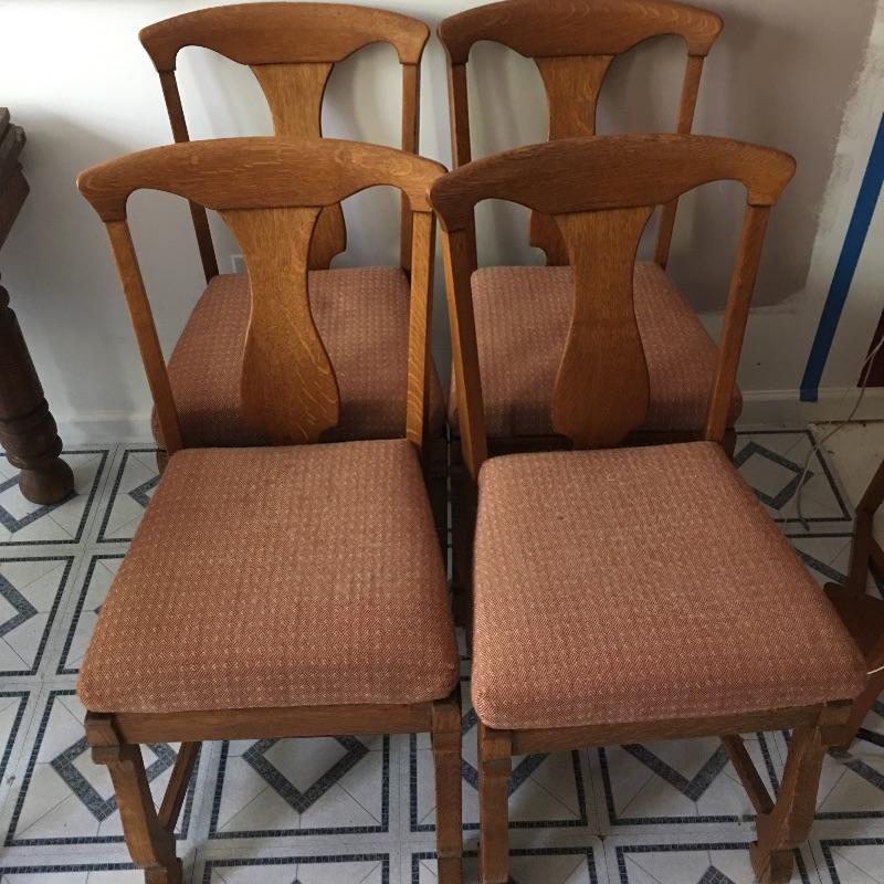 Four beautiful antique chairs. One chair is missing brace that goes across legs- see pictures. A Beautiful set of chairs to update your dining area. Use as is or change the fabric! Chairs measure 17.25” x 18.5” x 36”. Seat height 21”.