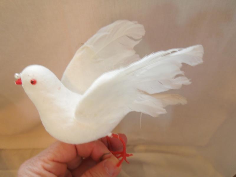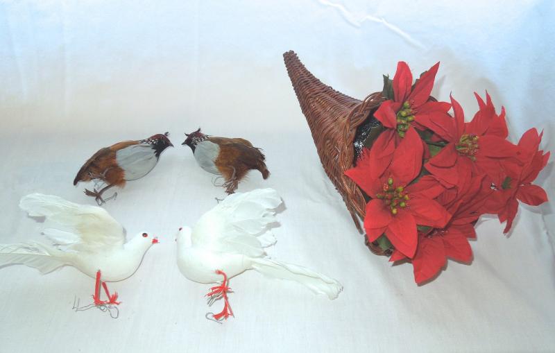 Two white doves and two partridge with wire feet for mounting. also includes cornucopia basket with artificial poinsetta stems.