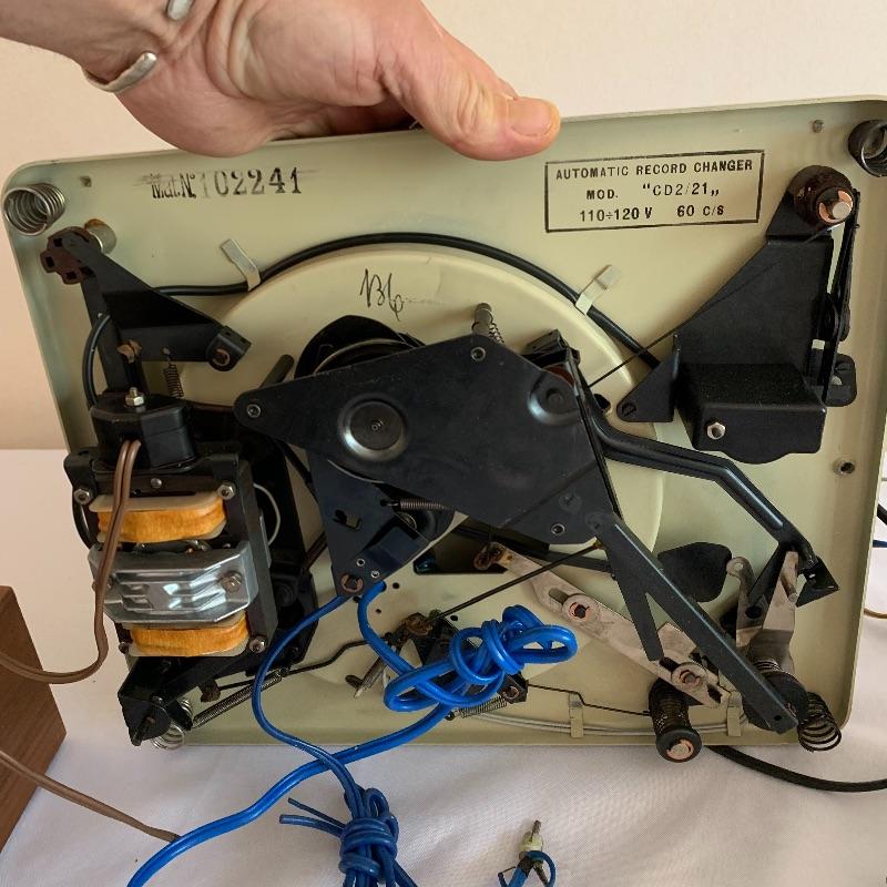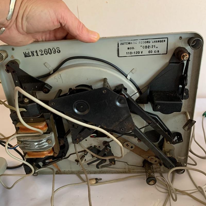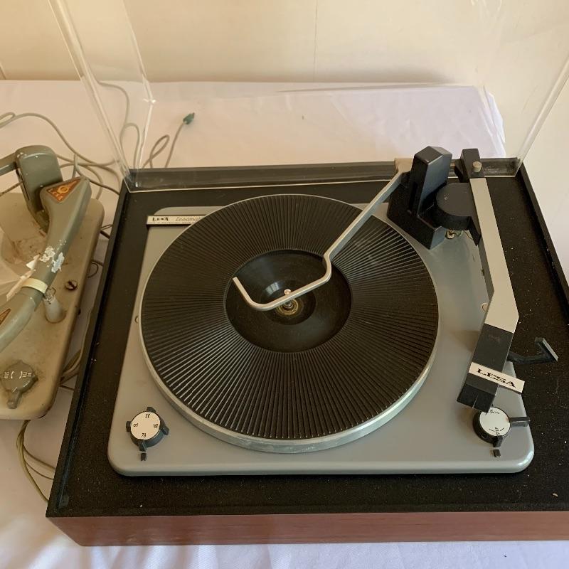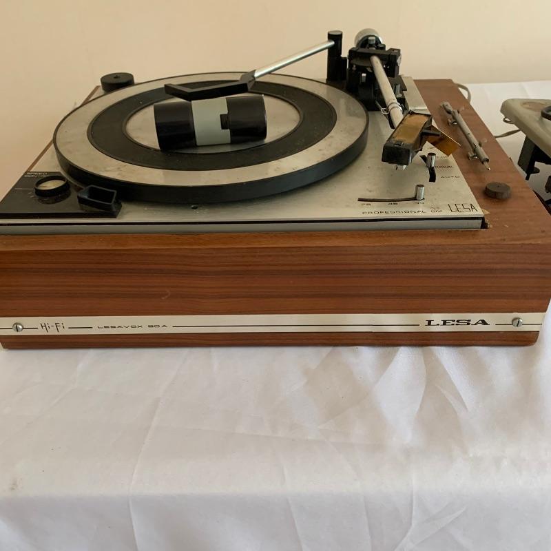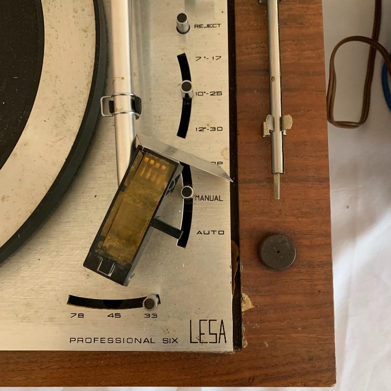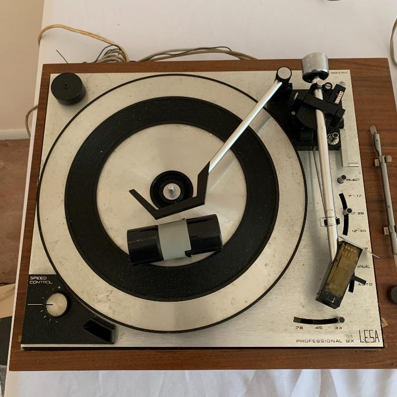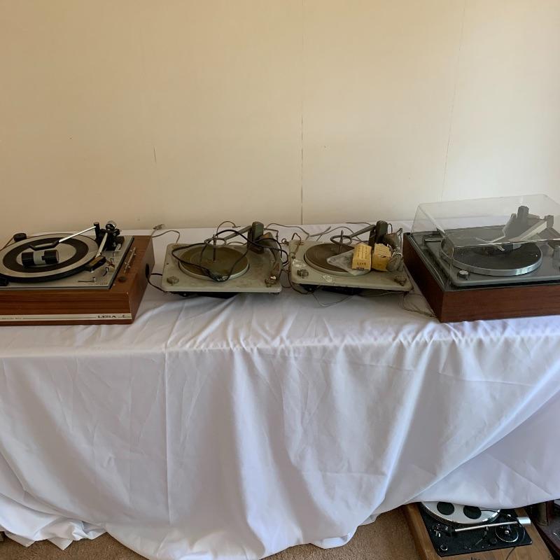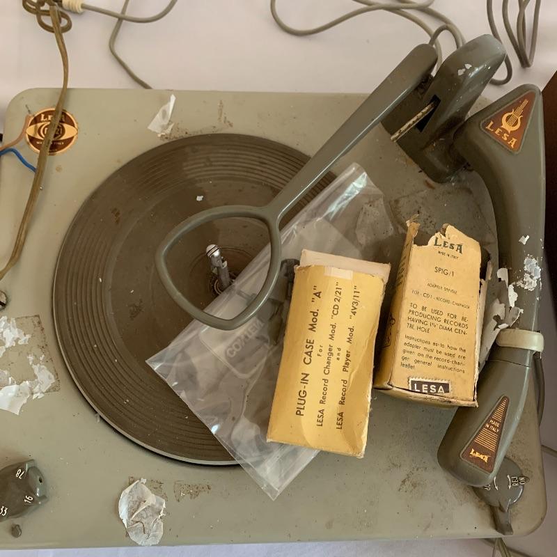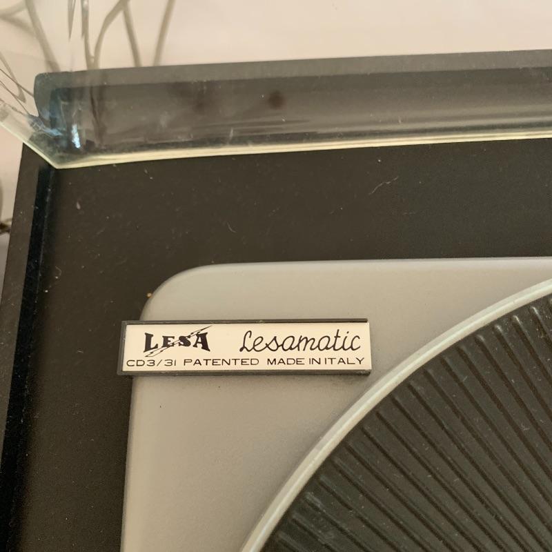 Four Lesa turntables. The first (far left in pic) Is a Lesavox 90A; the second and third are Lesa CD2/21 and both are missing bases. The last is a Lesamatic CD3/31 and powered on when tested. The two turntables missing bases did not power on when tested.
