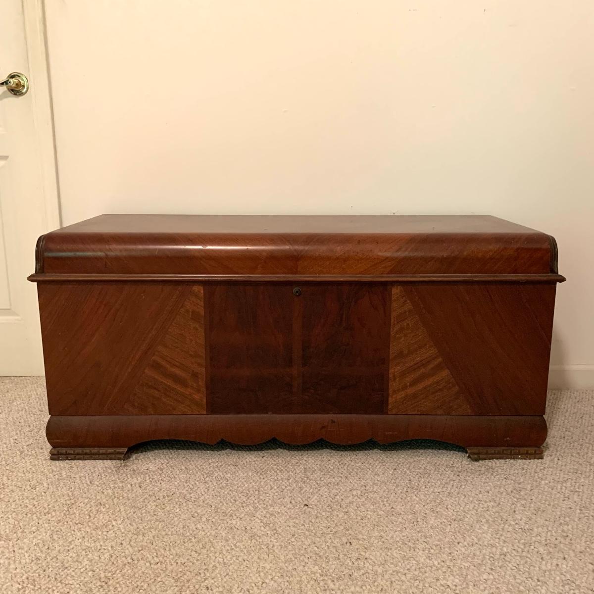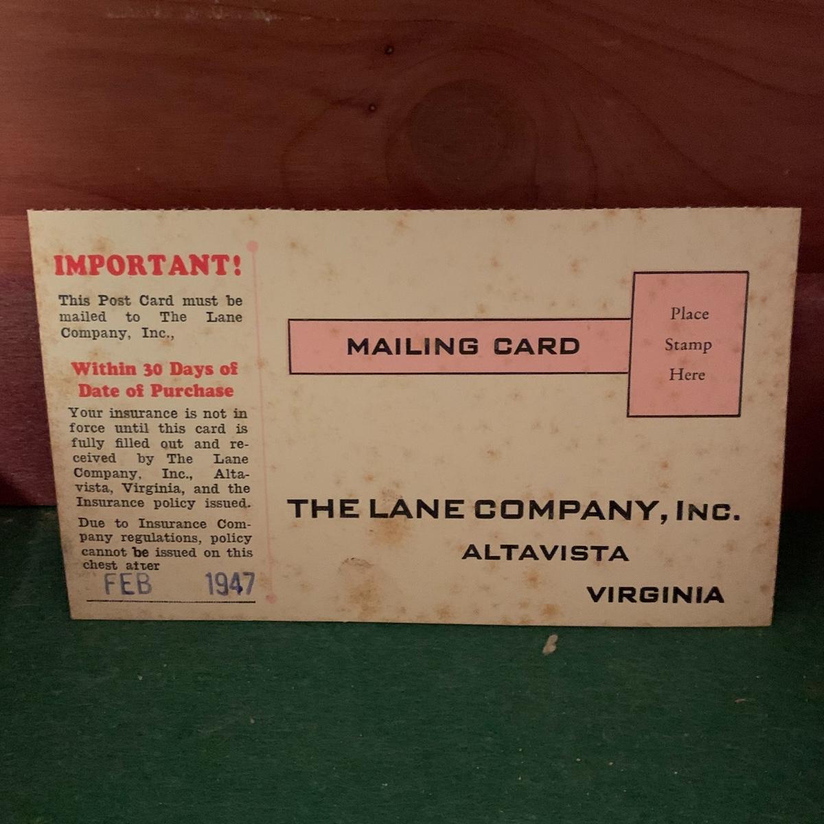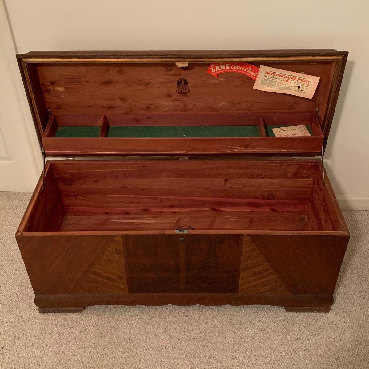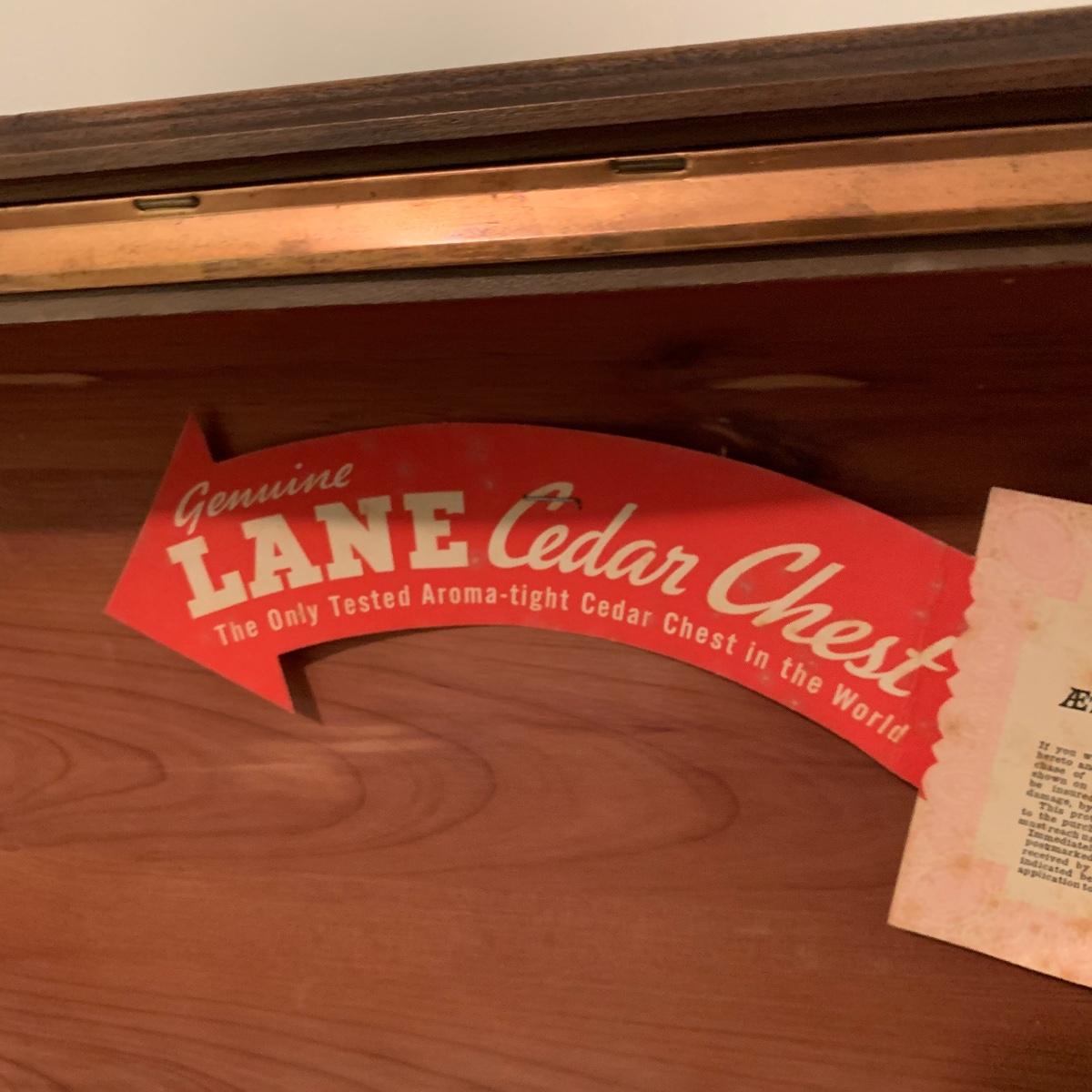According to a card found inside this gorgeous wooden cedar chest, it was originally purchased in 1947. This chest truly has withstood the test of time, for when it is opened it still has the delightful woodsy aroma of cedar wood. This trunk was made by the Lane company in Altavista, Virginia. It is in excellent shape, with a few minor scratches and a crack in the inside wooden shelf panel. A key to the chest is included, but the lock does not seem to function. On the bottom of the chest it says it is Style Number 2101. This chest measures 47” x 18.5” x 21.5” and would fit perfectly at the end of your bed. Local pickup only.