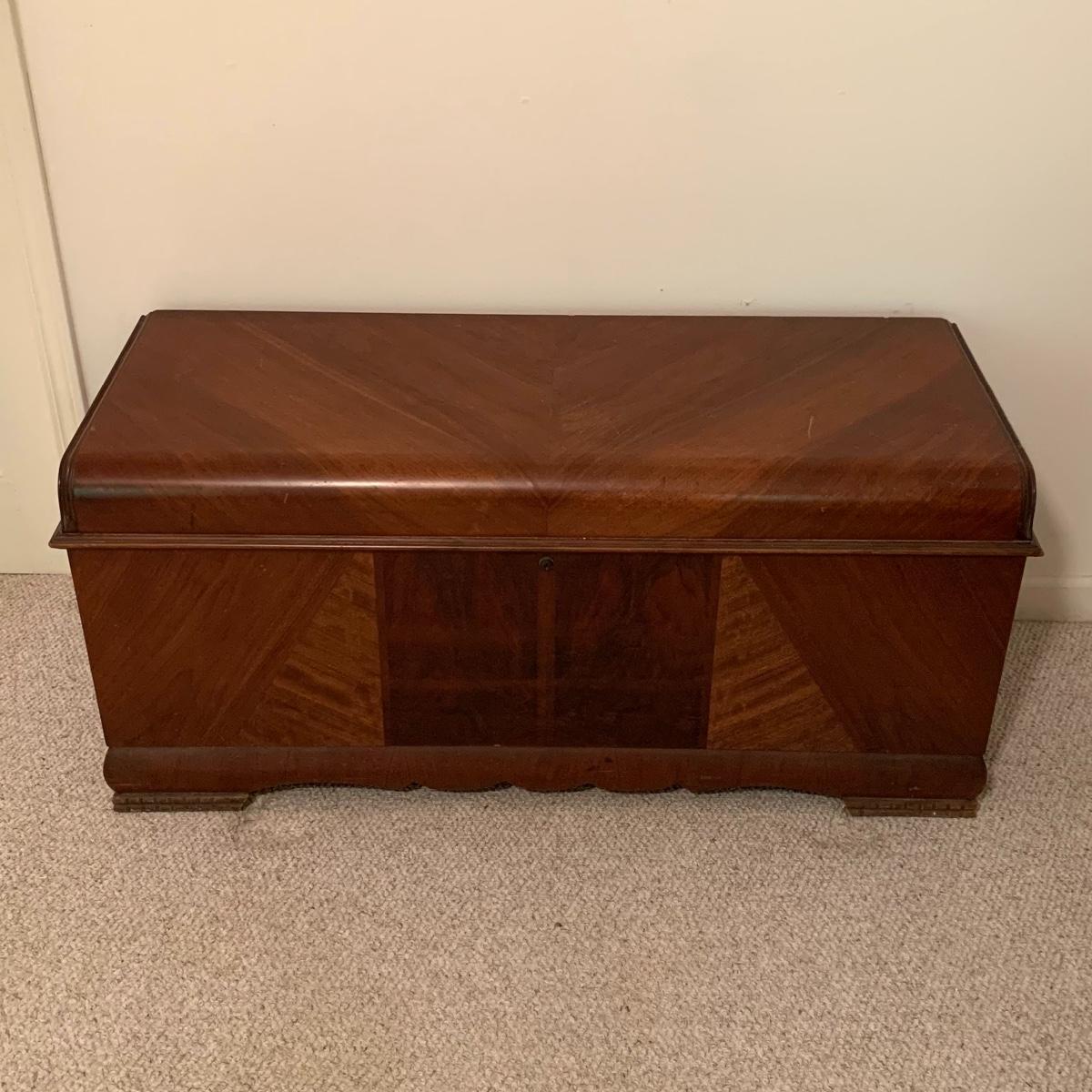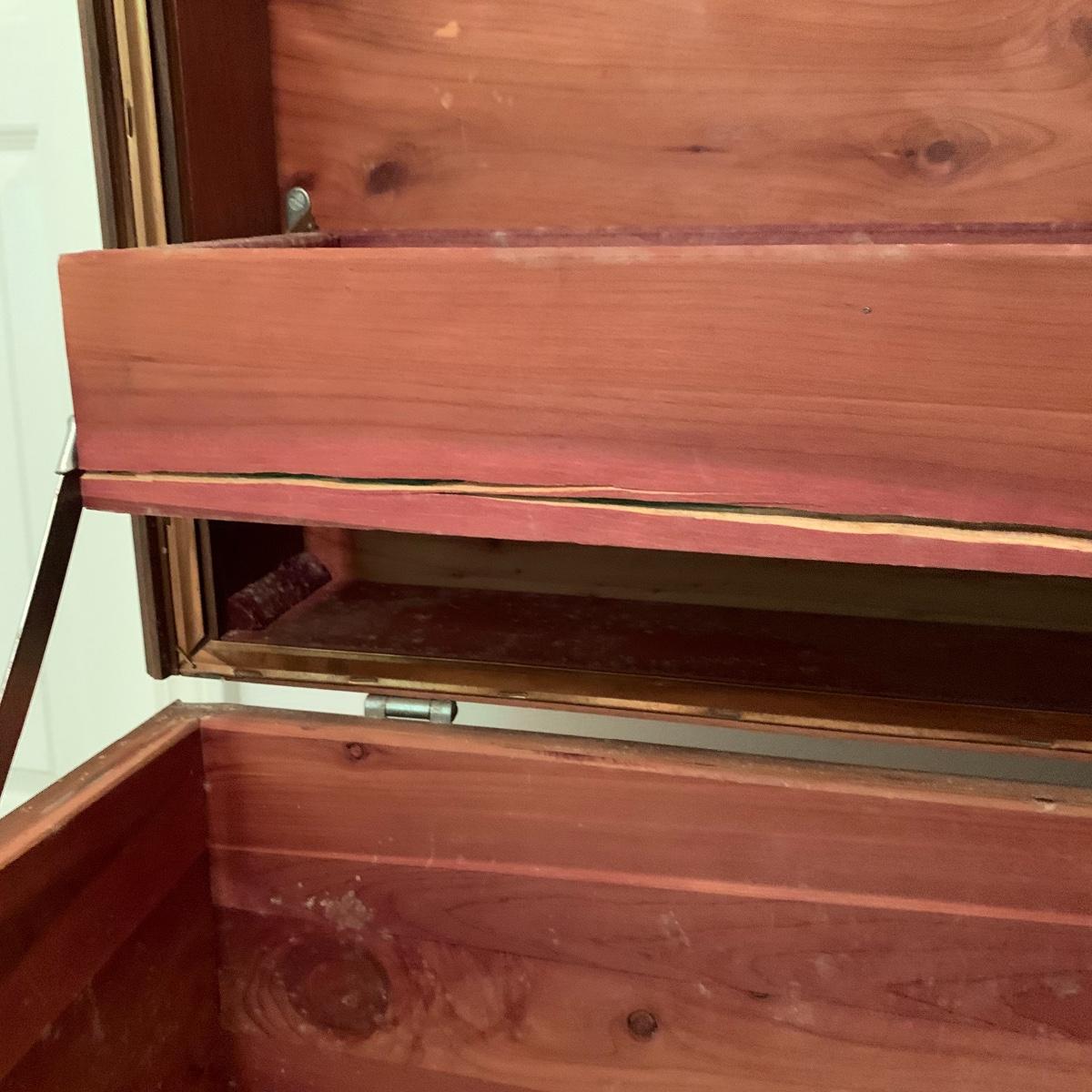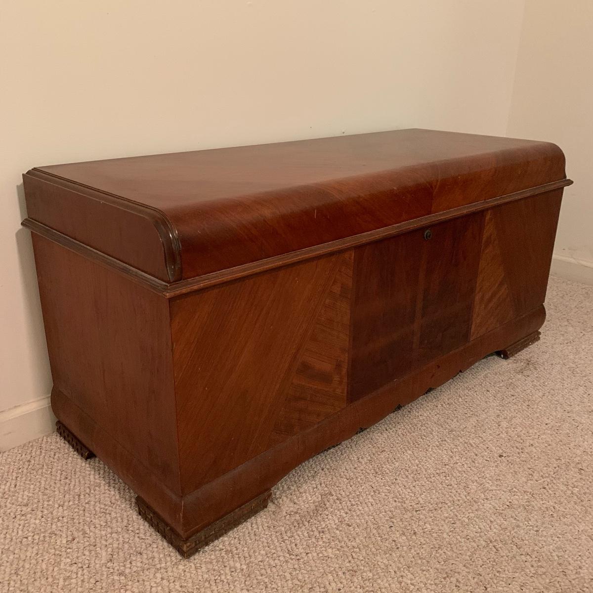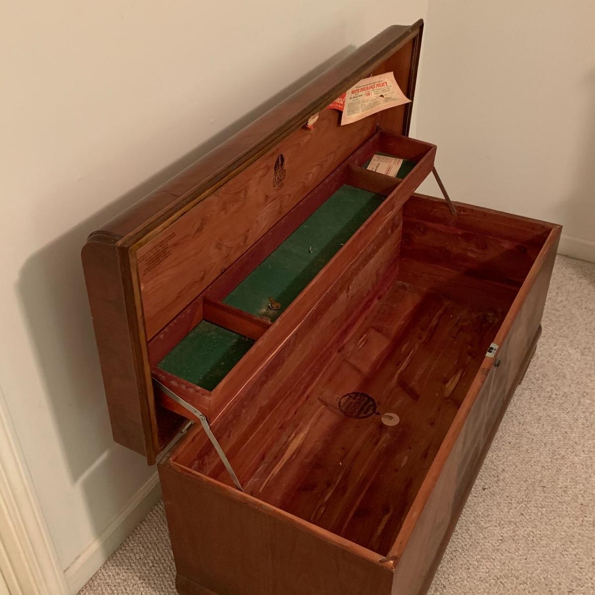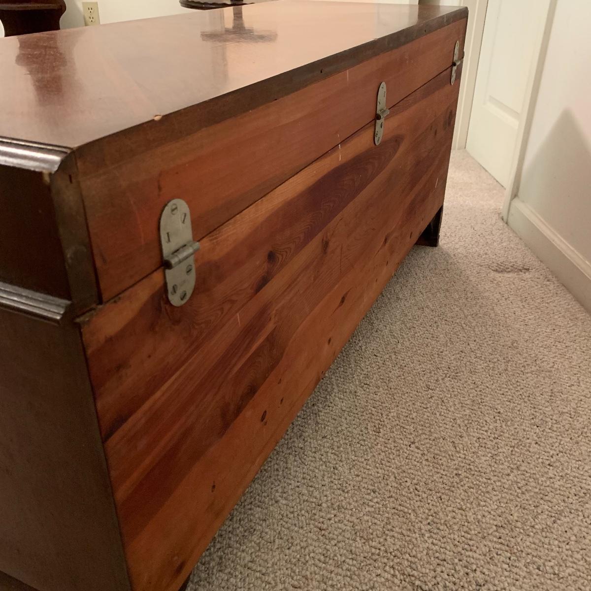 According to a card found inside this gorgeous wooden cedar chest, it was originally purchased in 1947. This chest truly has withstood the test of time, for when it is opened it still has the delightful woodsy aroma of cedar wood. This trunk was made by the Lane company in Altavista, Virginia. It is in excellent shape, with a few minor scratches and a crack in the inside wooden shelf panel. A key to the chest is included, but the lock does not seem to function. On the bottom of the chest it says it is Style Number 2101. This chest measures 47” x 18.5” x 21.5” and would fit perfectly at the end of your bed. Local pickup only.