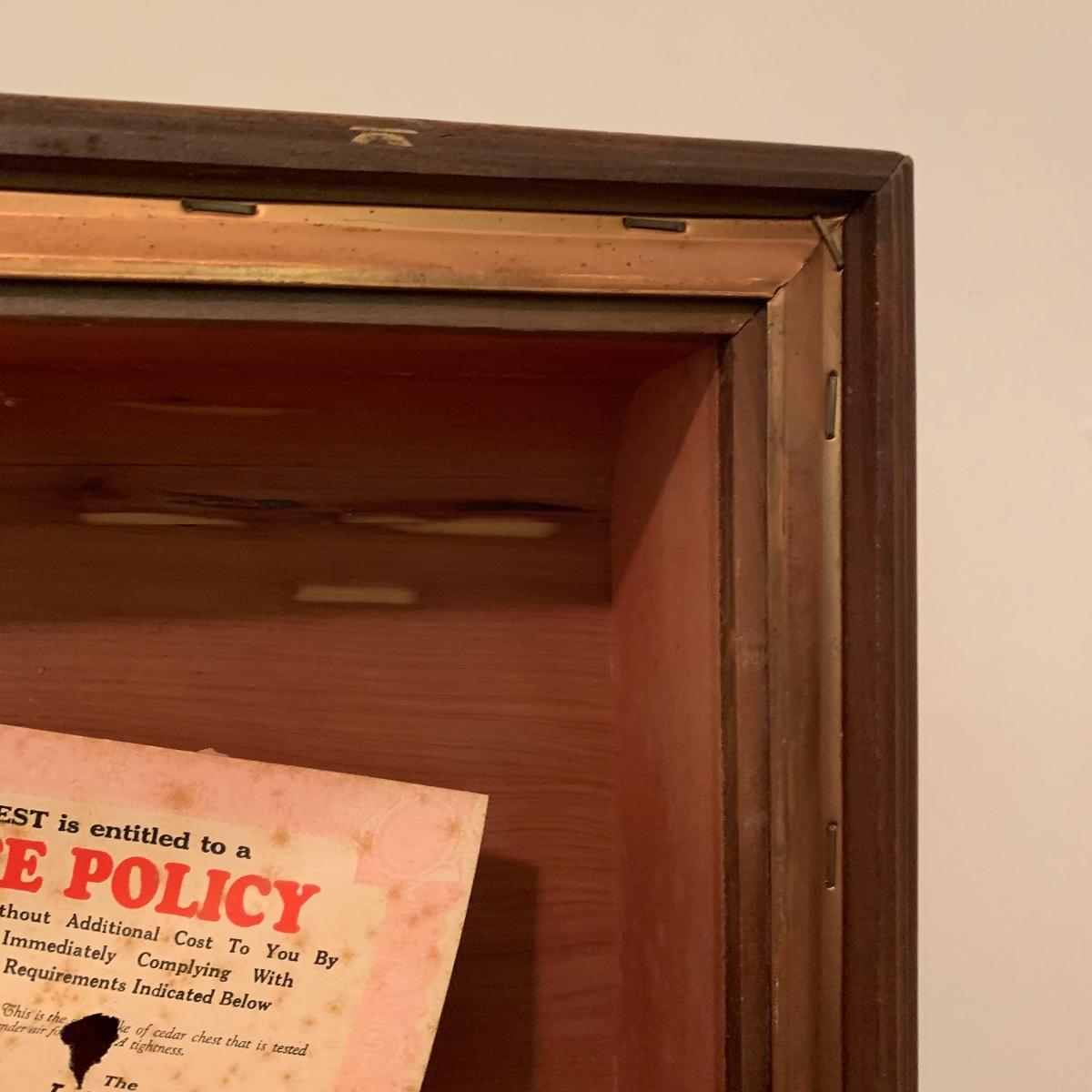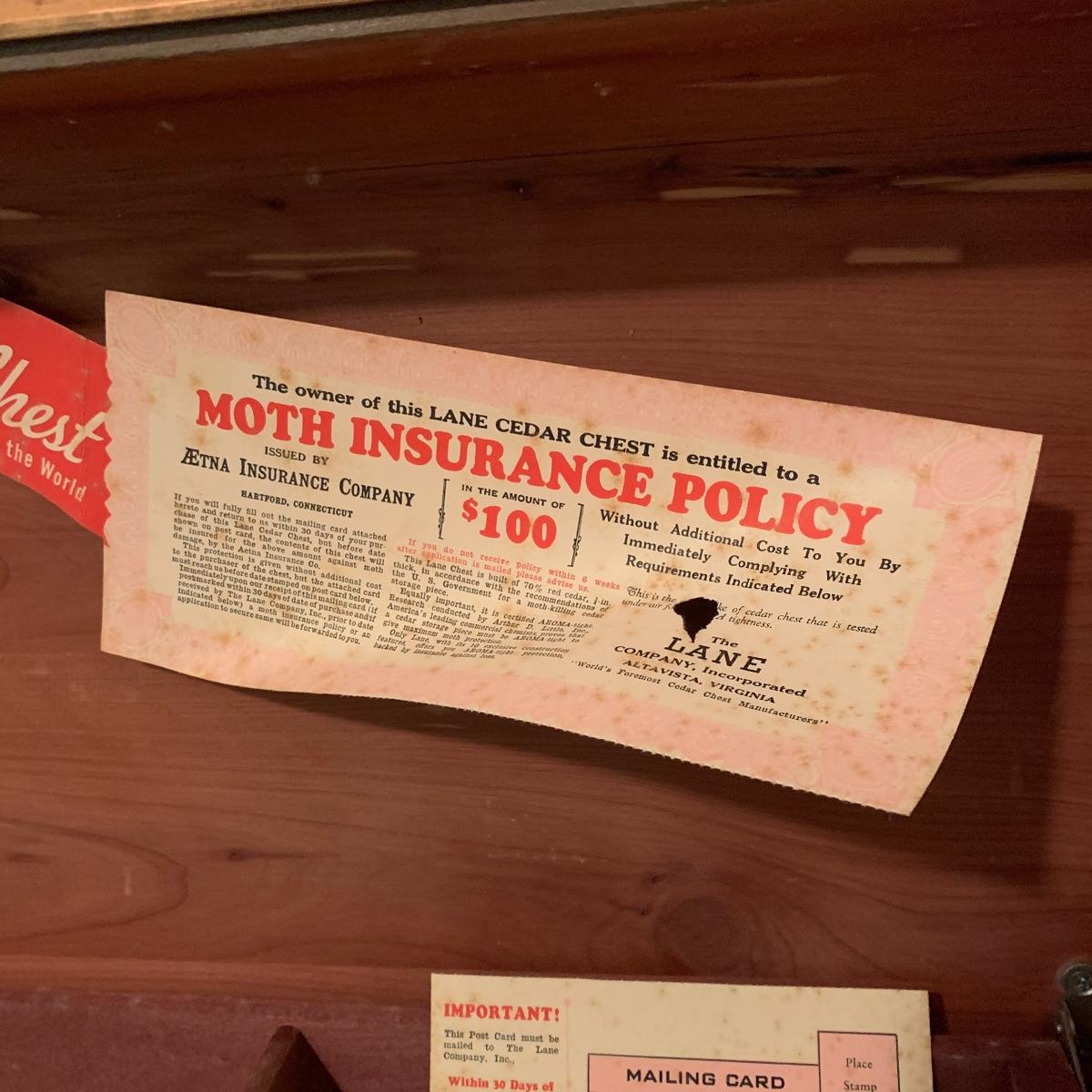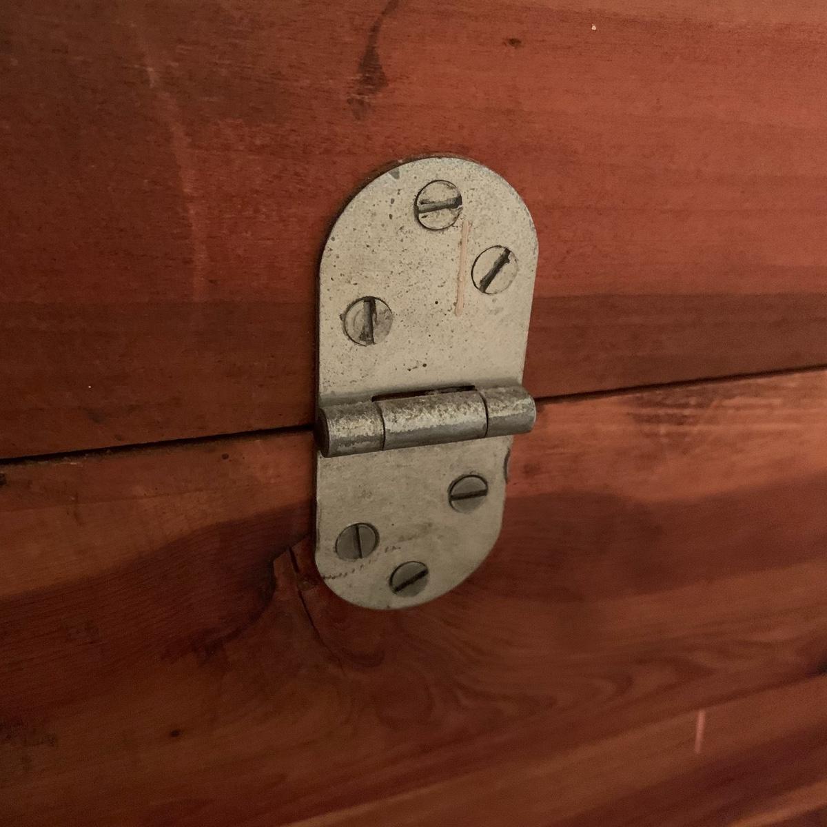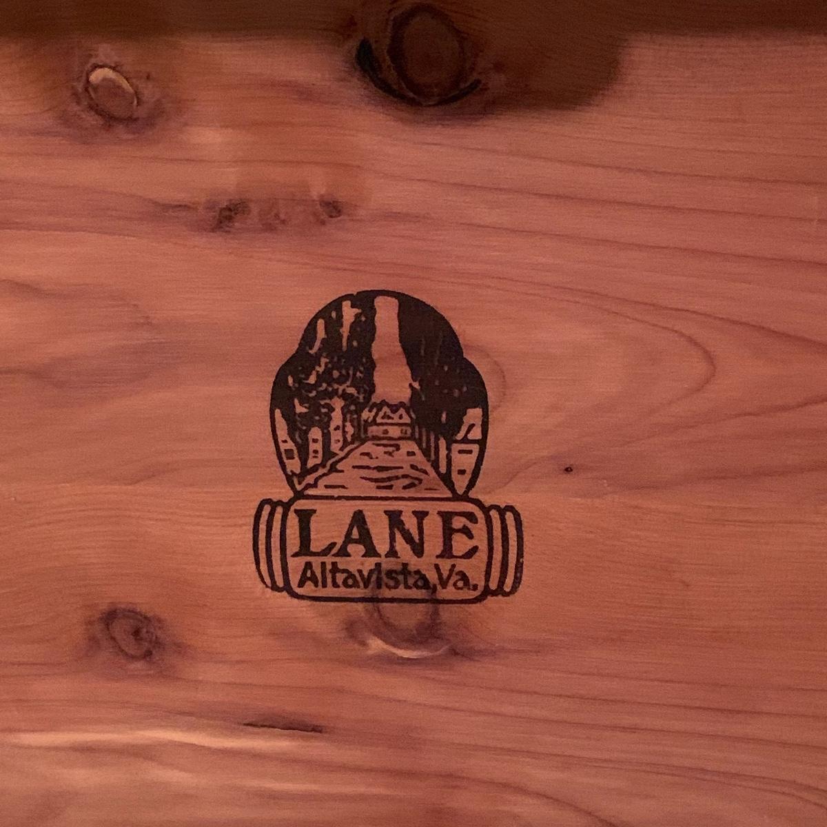 According to a card found inside this gorgeous wooden cedar chest, it was originally purchased in 1947. This chest truly has withstood the test of time, for when it is opened it still has the delightful woodsy aroma of cedar wood. This trunk was made by the Lane company in Altavista, Virginia. It is in excellent shape, with a few minor scratches and a crack in the inside wooden shelf panel. A key to the chest is included, but the lock does not seem to function. On the bottom of the chest it says it is Style Number 2101. This chest measures 47” x 18.5” x 21.5” and would fit perfectly at the end of your bed. Local pickup only.
