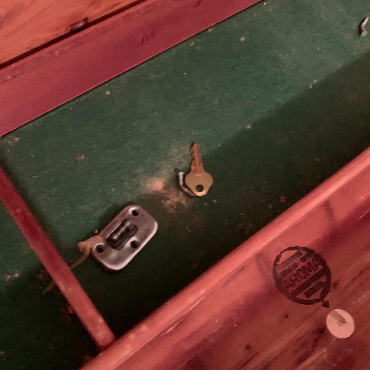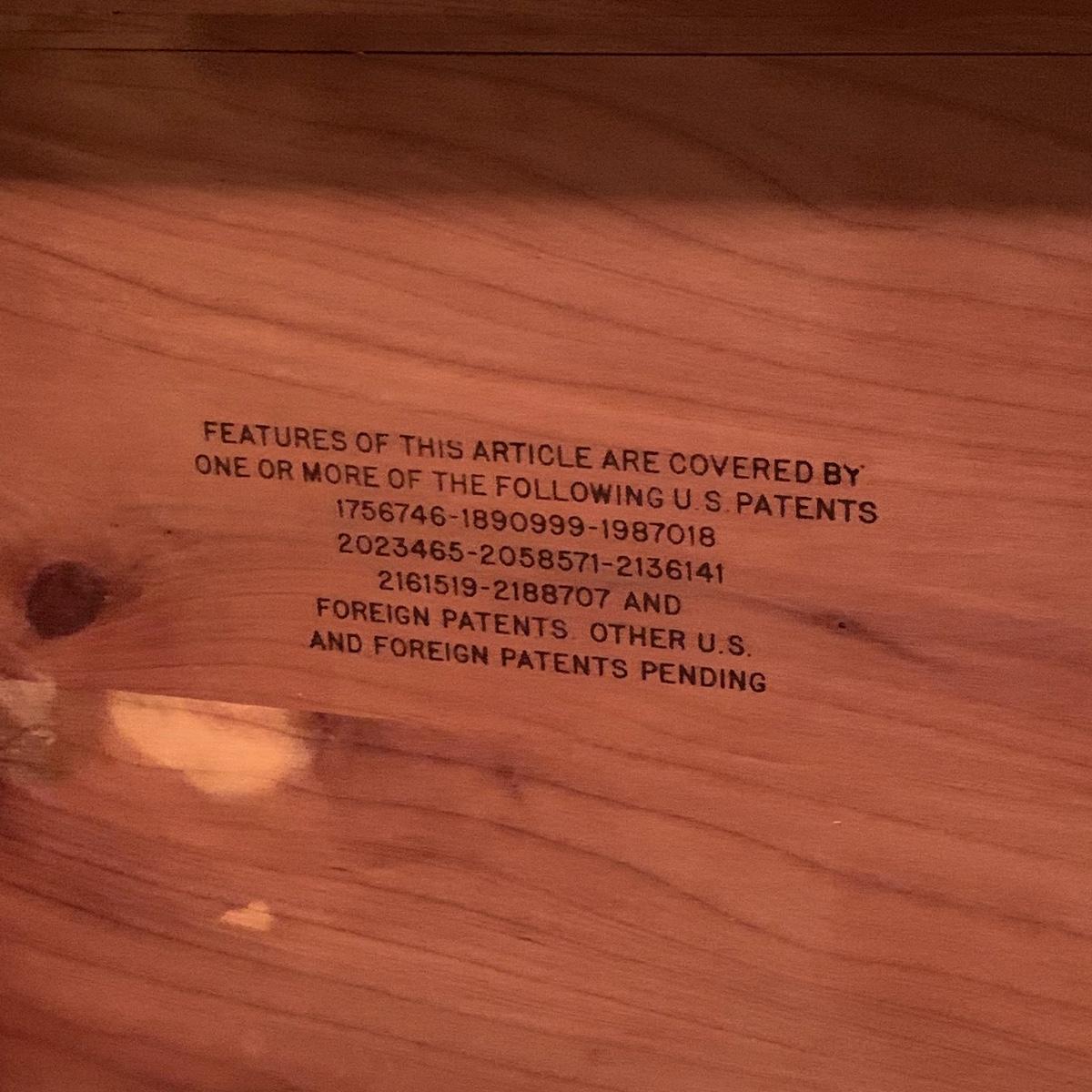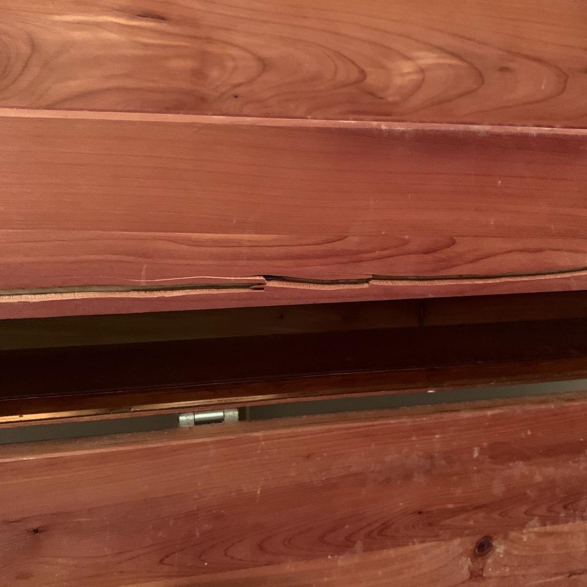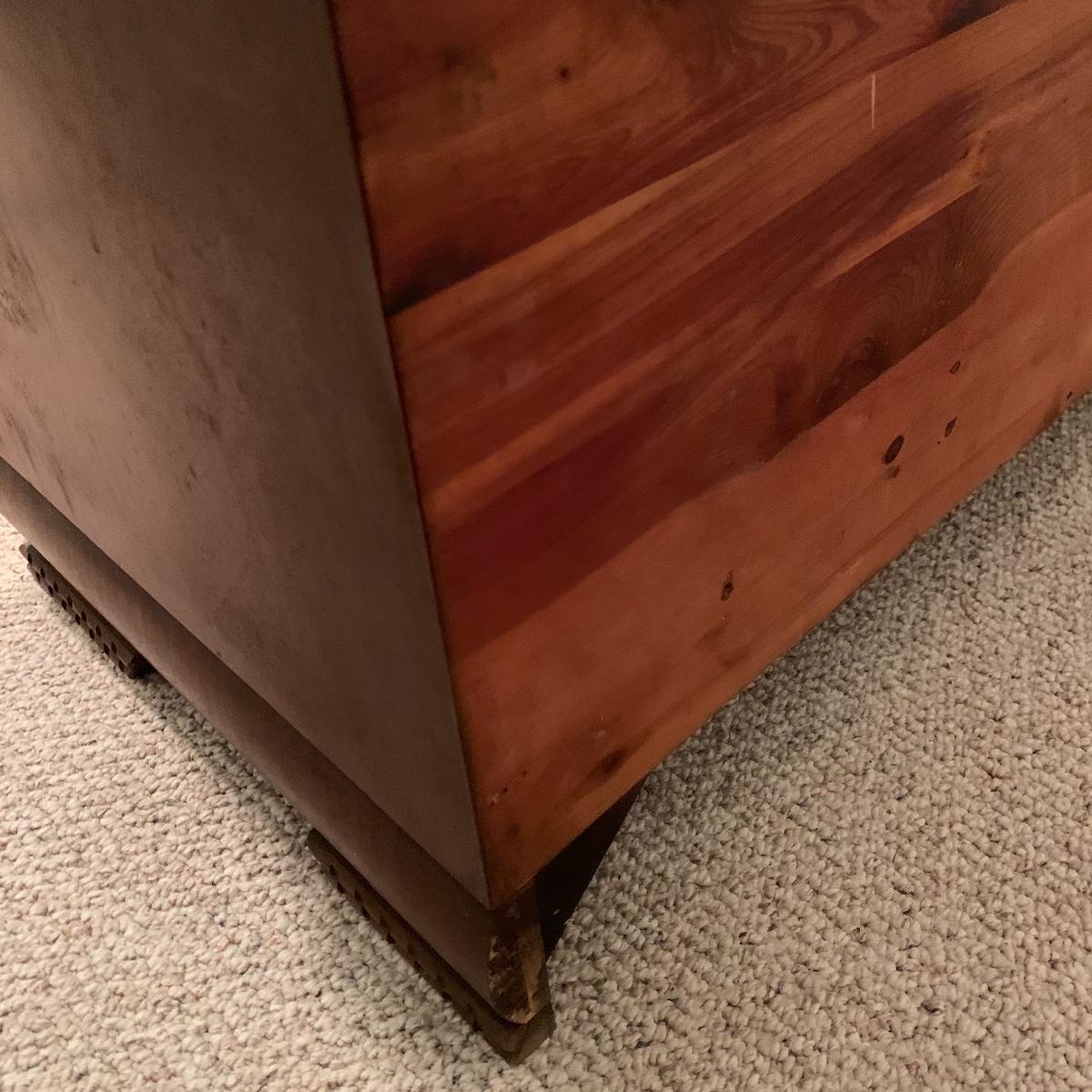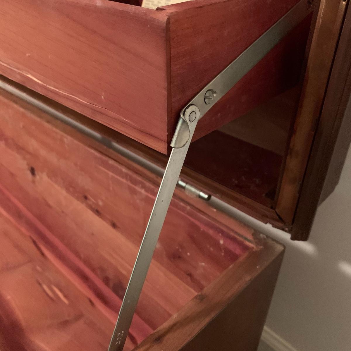 According to a card found inside this gorgeous wooden cedar chest, it was originally purchased in 1947. This chest truly has withstood the test of time, for when it is opened it still has the delightful woodsy aroma of cedar wood. This trunk was made by the Lane company in Altavista, Virginia. It is in excellent shape, with a few minor scratches and a crack in the inside wooden shelf panel. A key to the chest is included, but the lock does not seem to function. On the bottom of the chest it says it is Style Number 2101. This chest measures 47” x 18.5” x 21.5” and would fit perfectly at the end of your bed. Local pickup only.