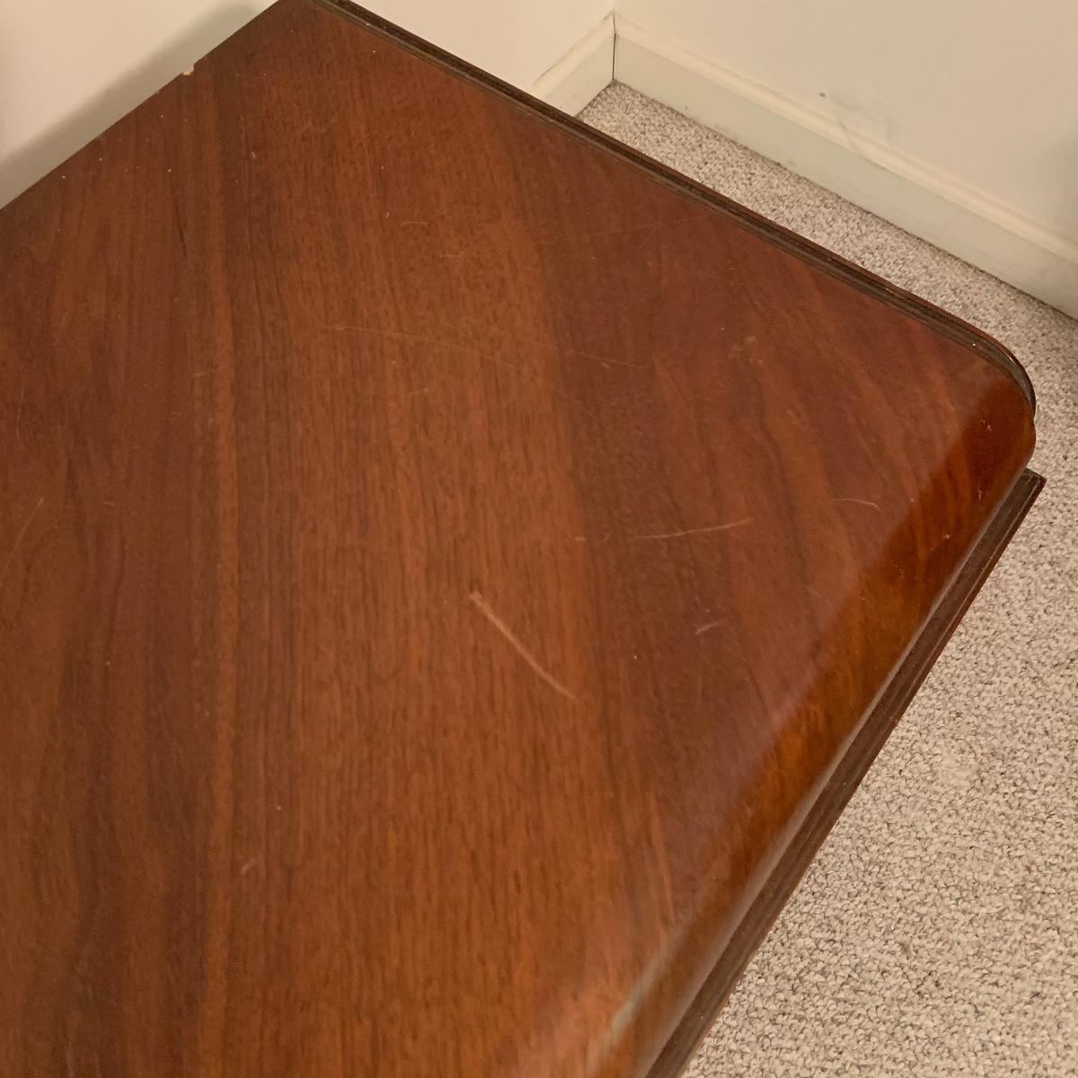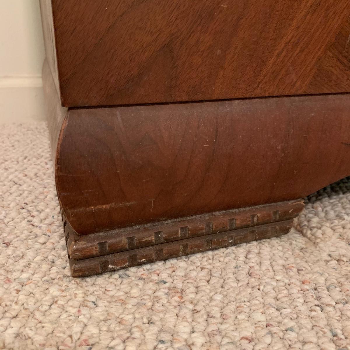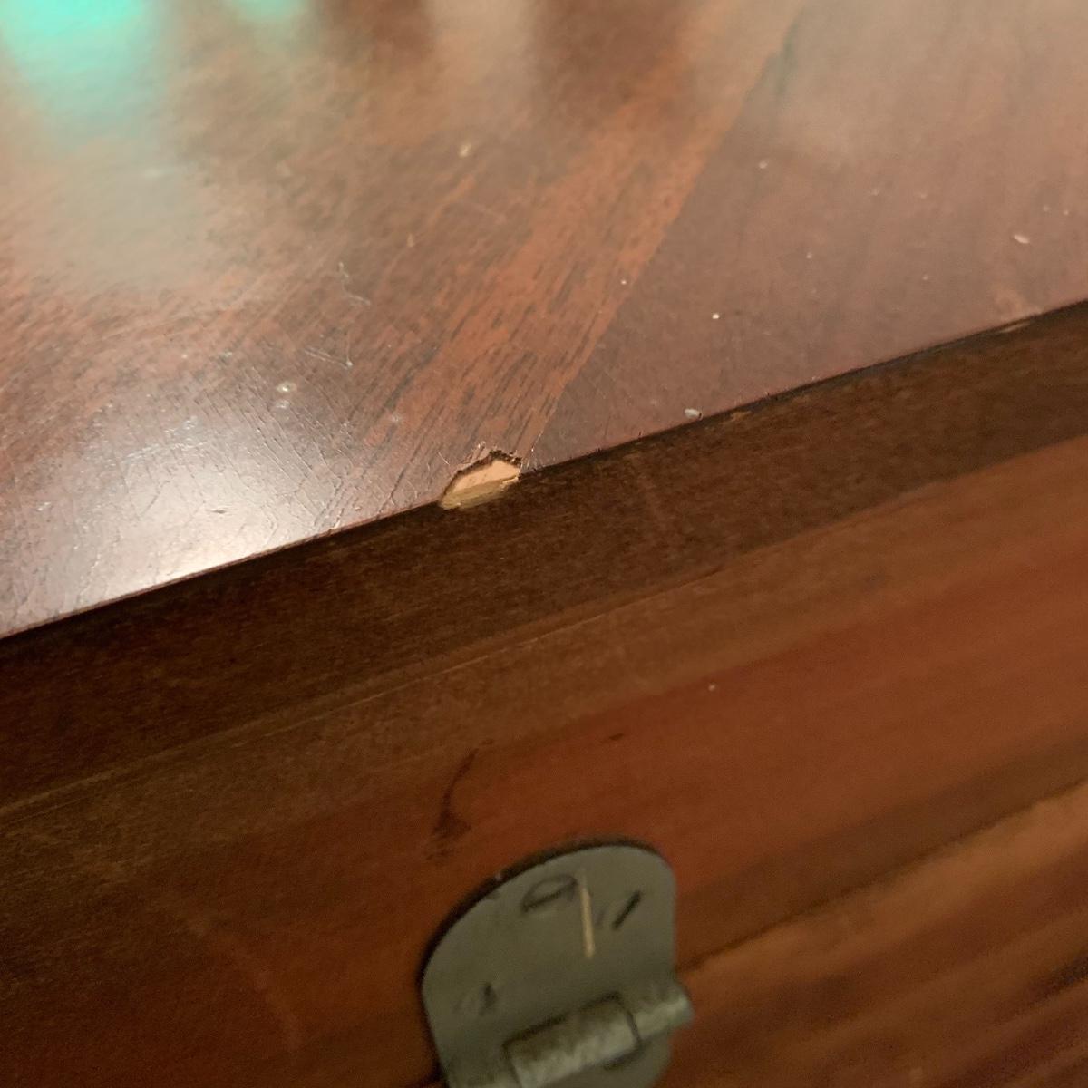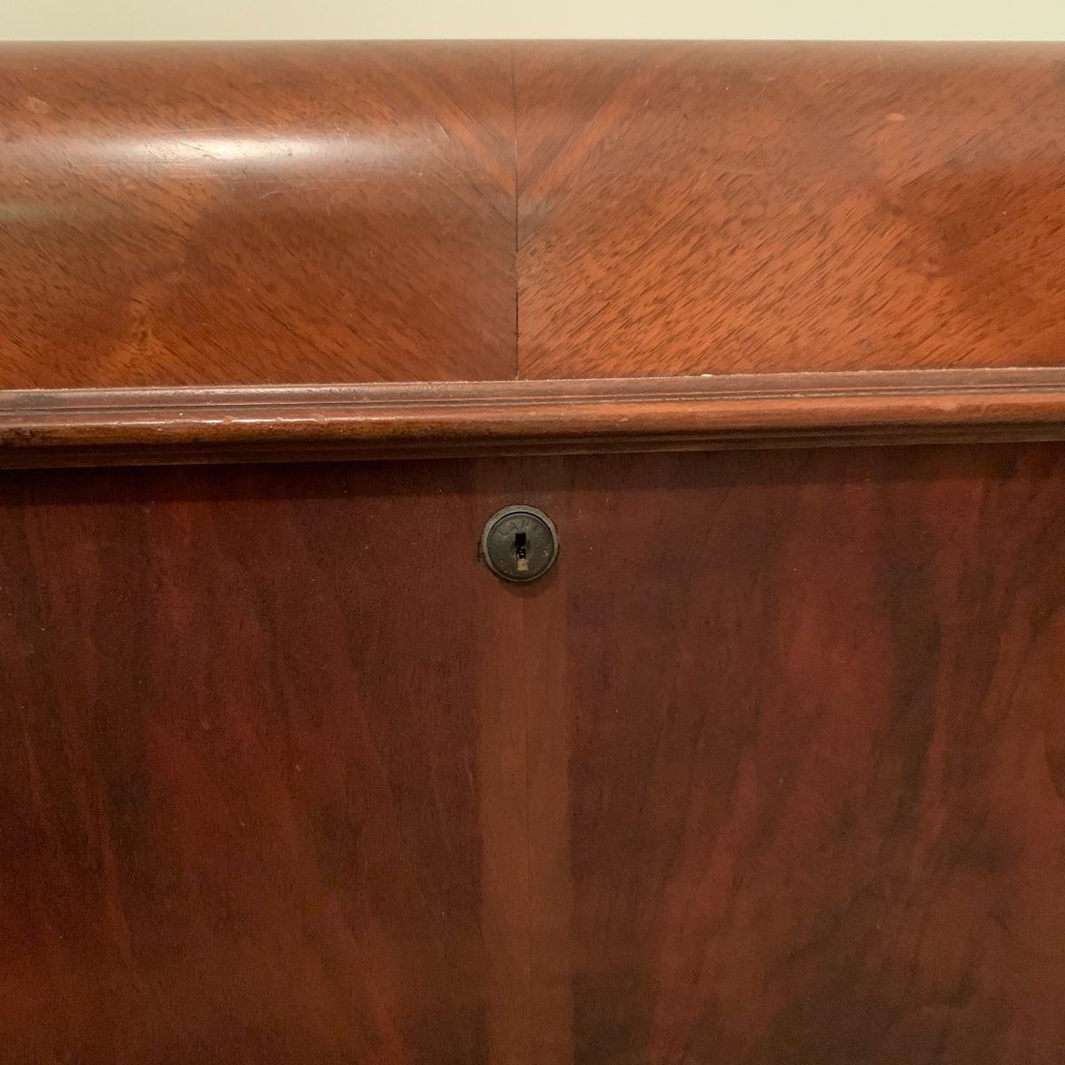 According to a card found inside this gorgeous wooden cedar chest, it was originally purchased in 1947. This chest truly has withstood the test of time, for when it is opened it still has the delightful woodsy aroma of cedar wood. This trunk was made by the Lane company in Altavista, Virginia. It is in excellent shape, with a few minor scratches and a crack in the inside wooden shelf panel. A key to the chest is included, but the lock does not seem to function. On the bottom of the chest it says it is Style Number 2101. This chest measures 47” x 18.5” x 21.5” and would fit perfectly at the end of your bed. Local pickup only.