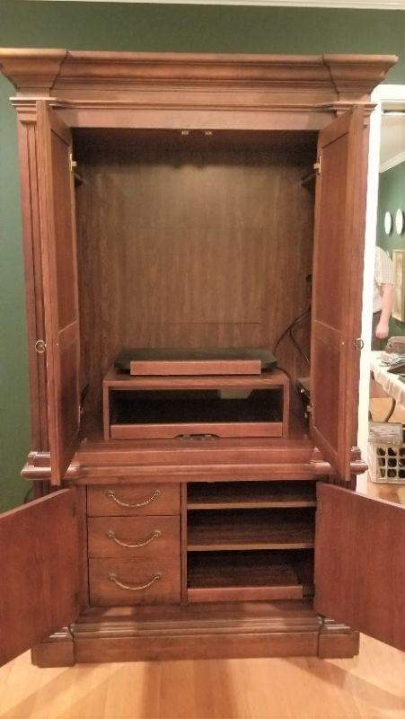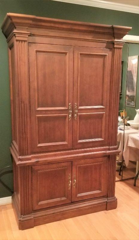 Here is a very nice Entertainment Center with room for your flat screen or other television and a nice storage area underneath for stereo equipment, clothes, or other items. Stands 80" tall, 46 1/4" wide, and 20 3/4 " deep. Excellent condition.
