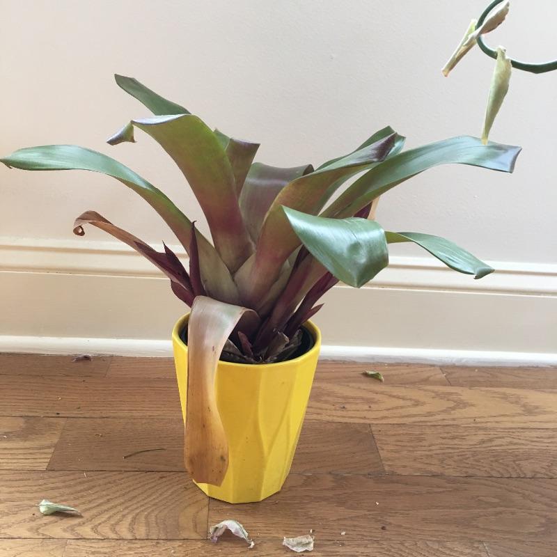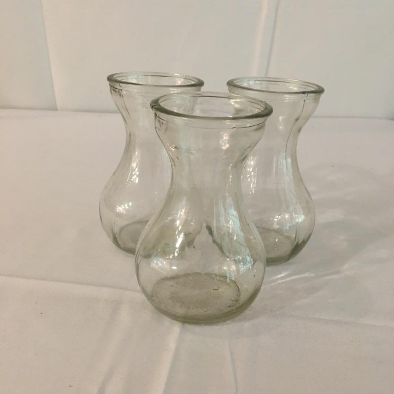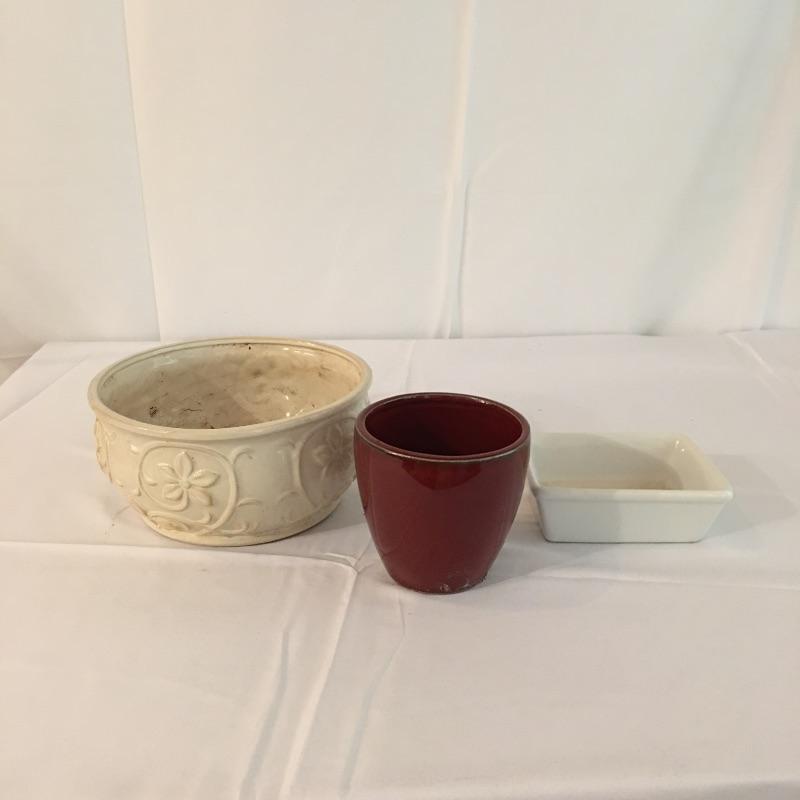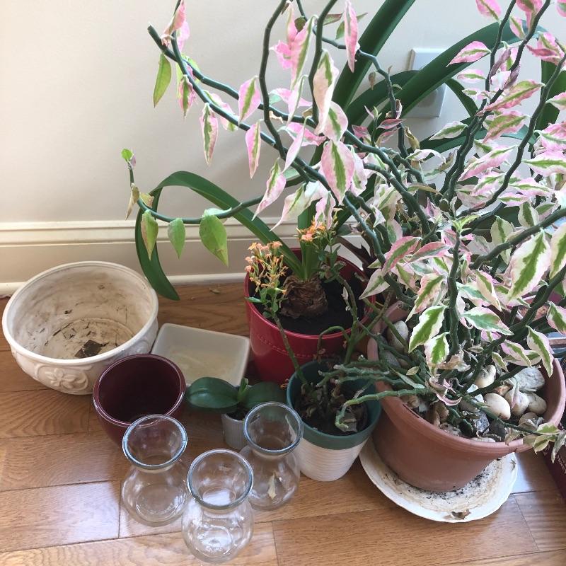 House plants and planters. Lot includes five plants in pots, three forcing bulb vases and three empty pots.