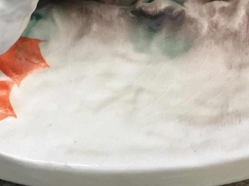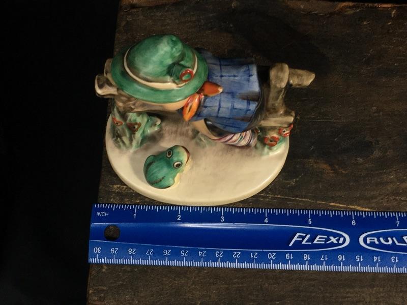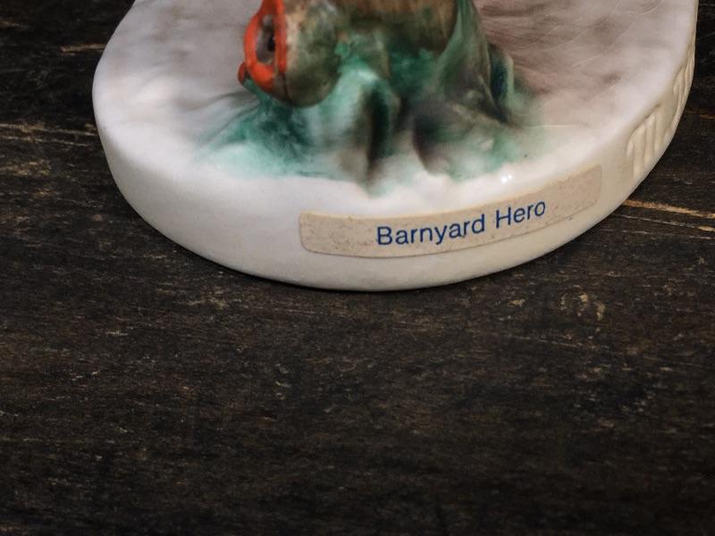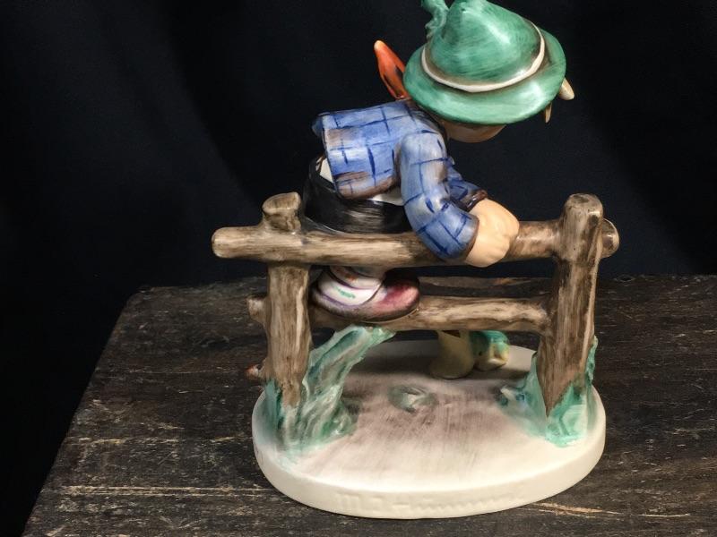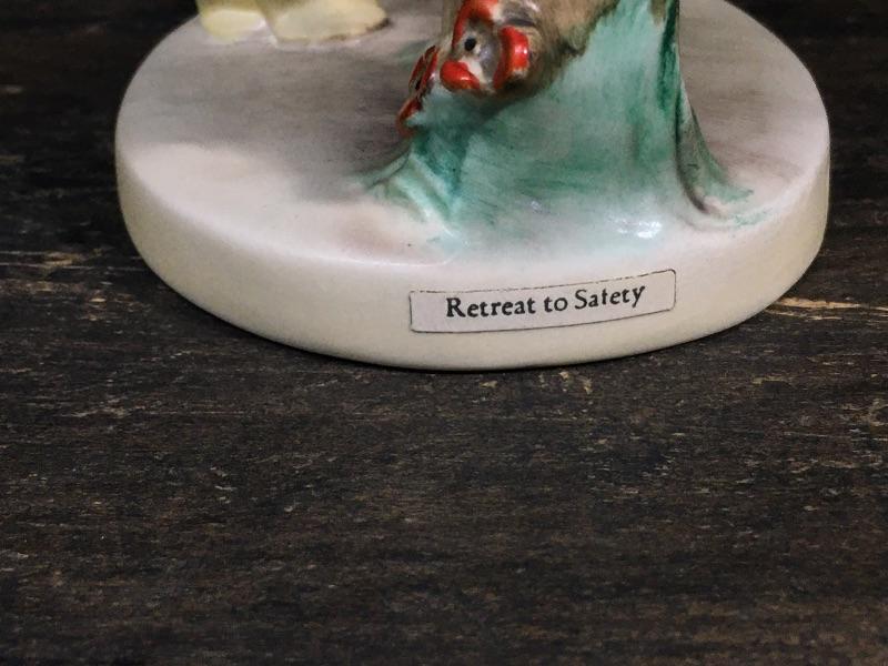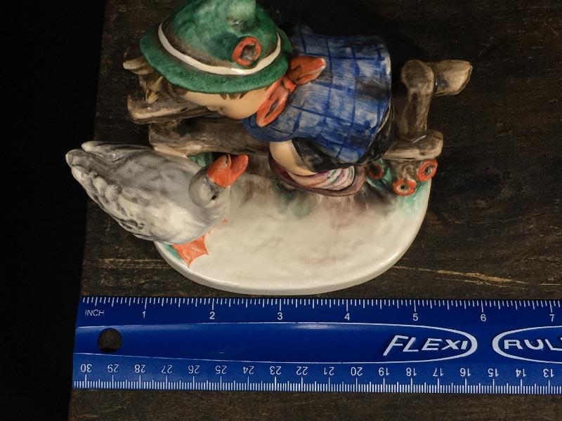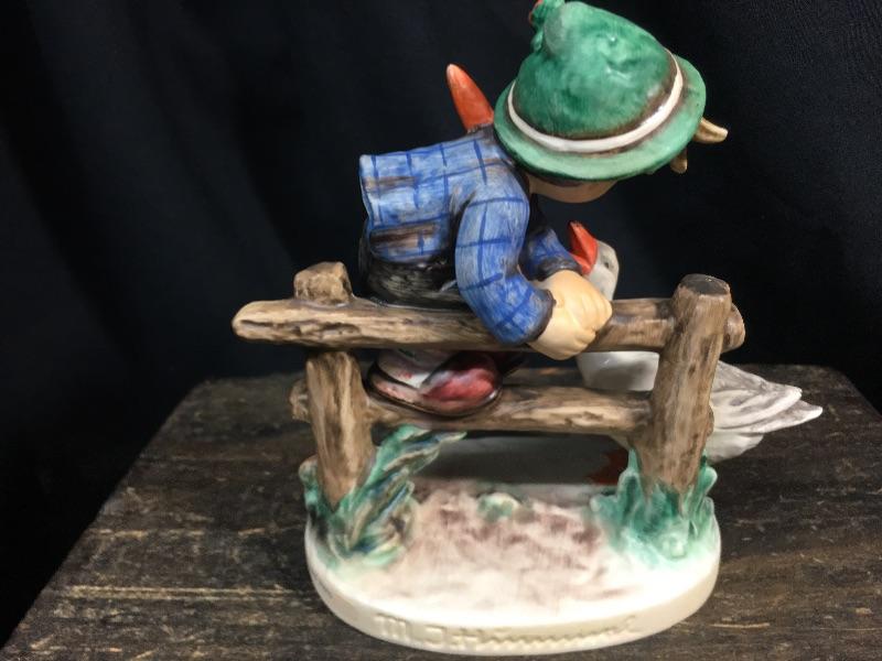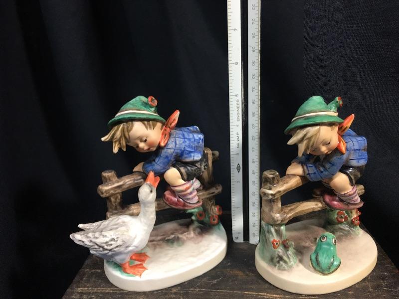 This pairing of Hummels contains Hummels #201/I “Retreat to Safety” and #195/I “Barnyard Hero”. “Retreat to Safety” is a TMK 5 Hummel and is in mint condition with no visible crazing. “Barnyard Hero” is also a TMK 5 and has some light crazing around its figure that is shown in the pictures.