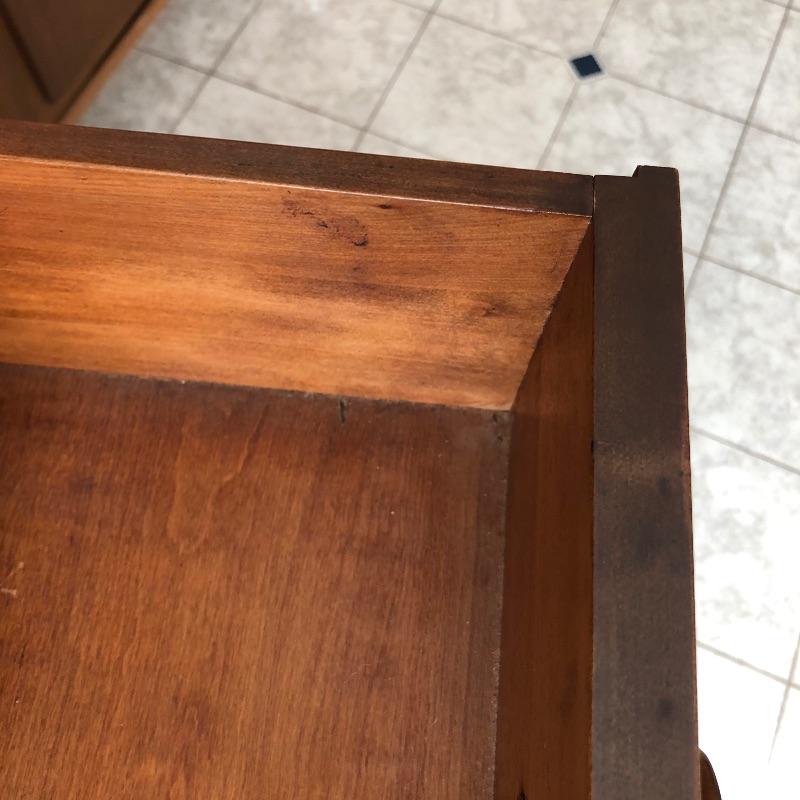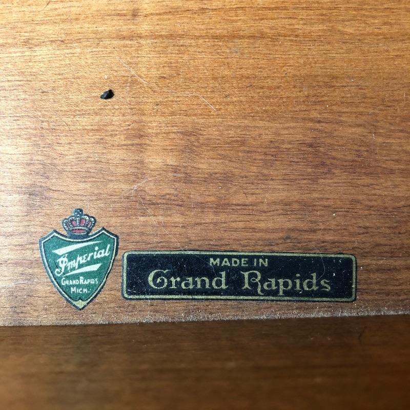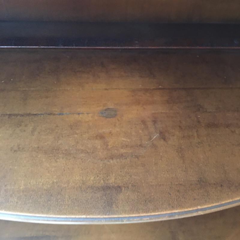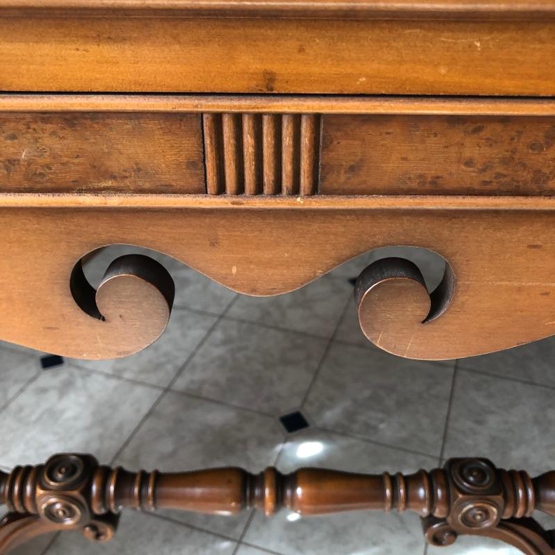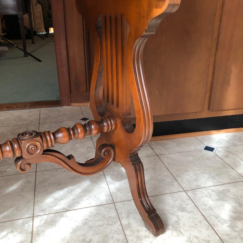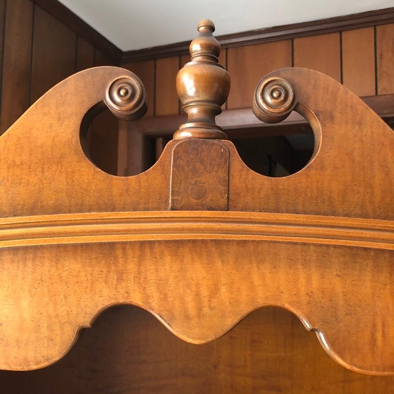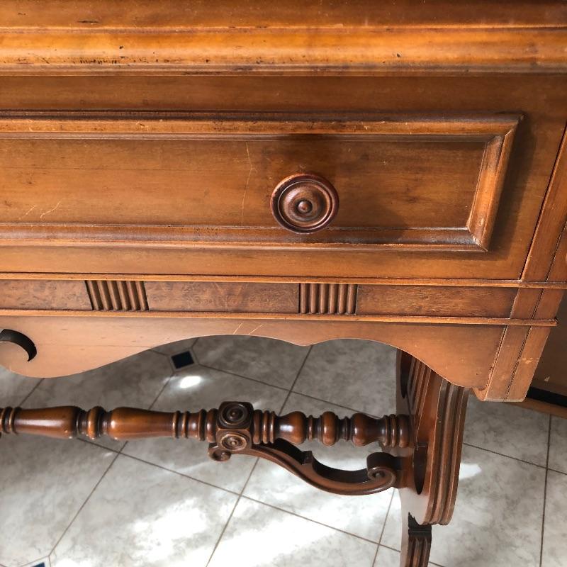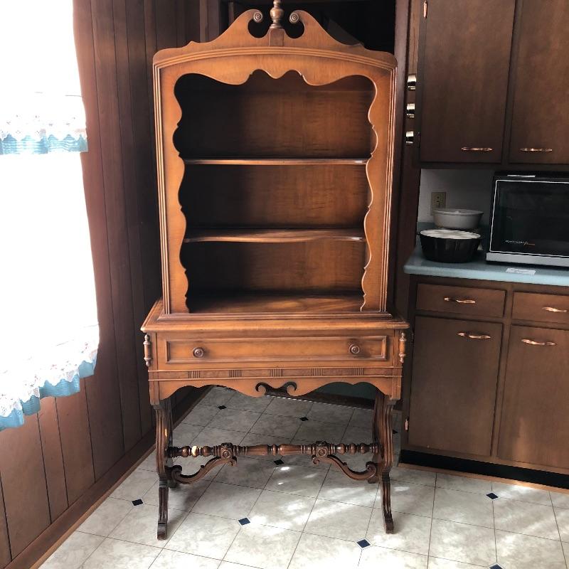 This elegant piece was made by Imperial of Grand Rapids and features some fabulous craftsmanship. All one piece, this unit comes with three shelves and one drawer. The wood is good and solid and a mid toned color. The wonderful carved detailing is found throughout this piece, see images. There are a few minor nicks and scratches that are shown in the images.