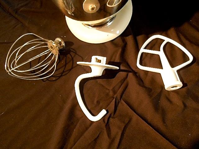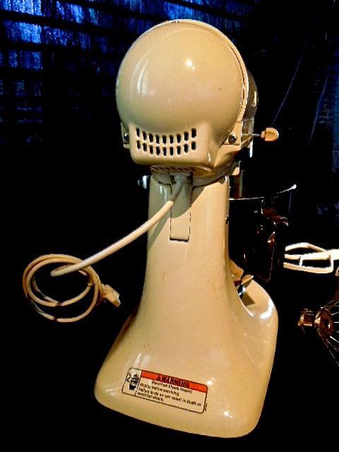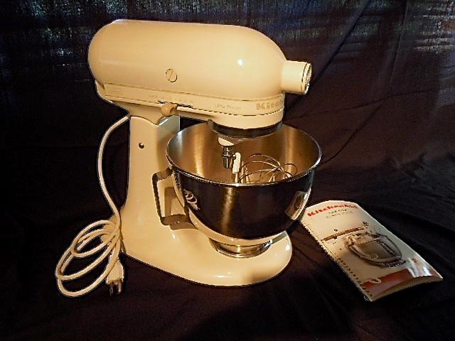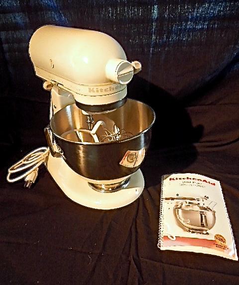 Kitchen Aid Stand Mixer Model KSM90AC with three attachments and user guide. 4.5 quart ultra power mixer from Kitchen Aid. 300 watt. Includes stainless steel bowl with handle and three attachments. Almond Cream color. Pin attaching mixer to base is loose and needs repair. Clean and in working condition.