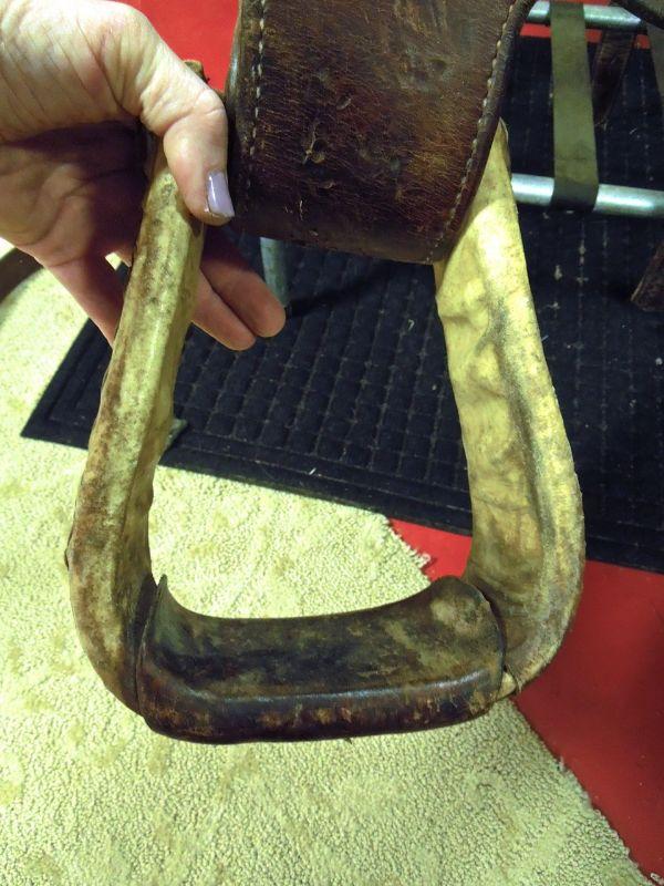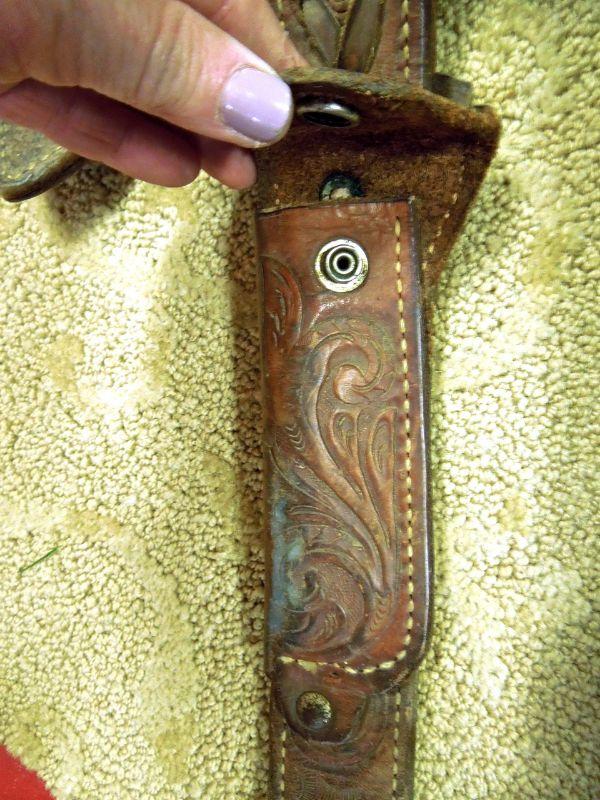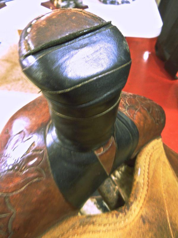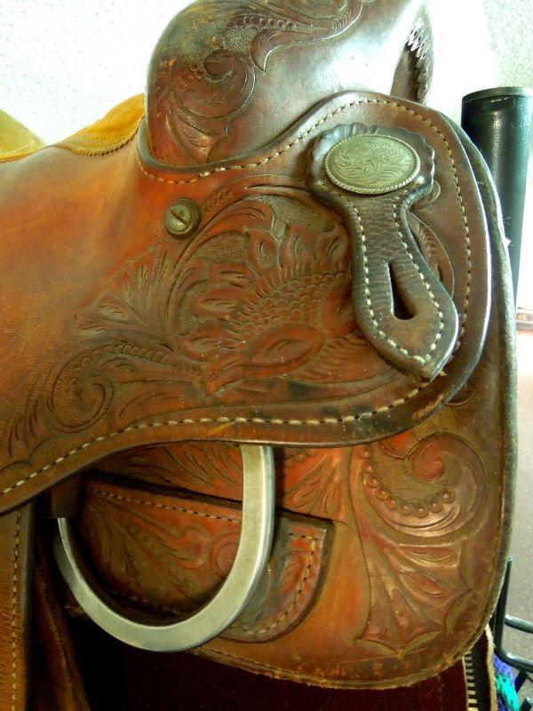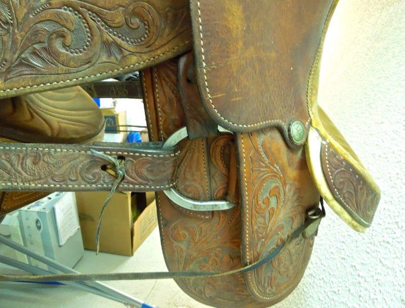 Longhorn brand 8138 15" leather saddle with sterling concha detail and knife sheath on strap. Rawhide stirrups. Long leather flank cinch.