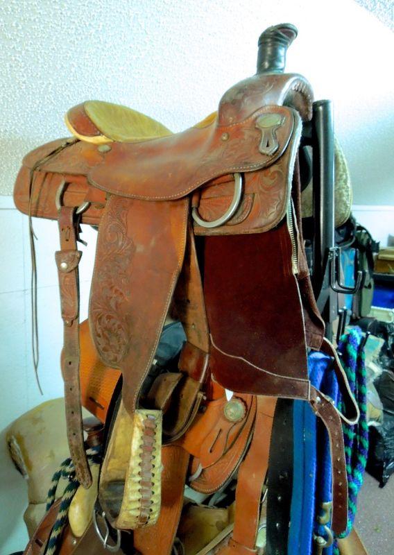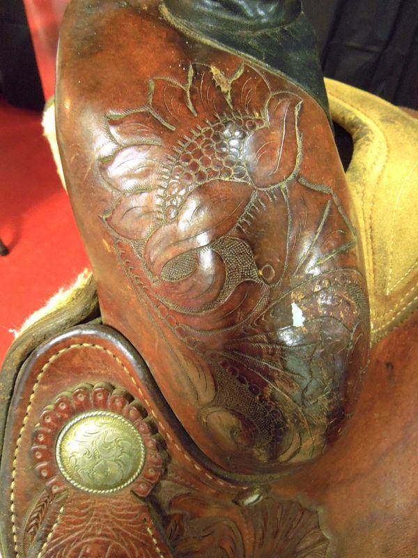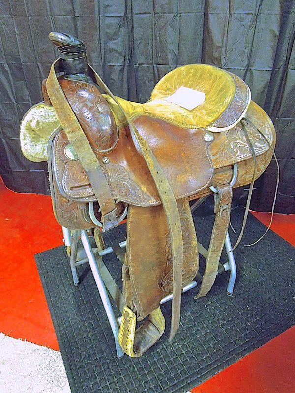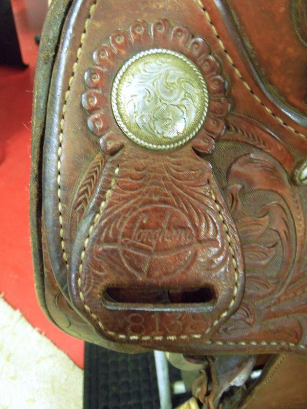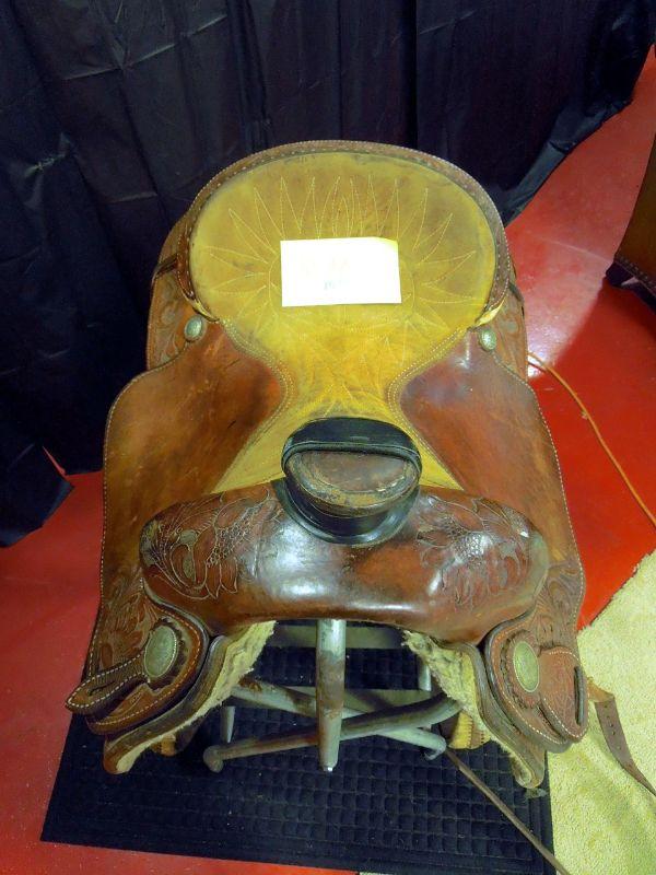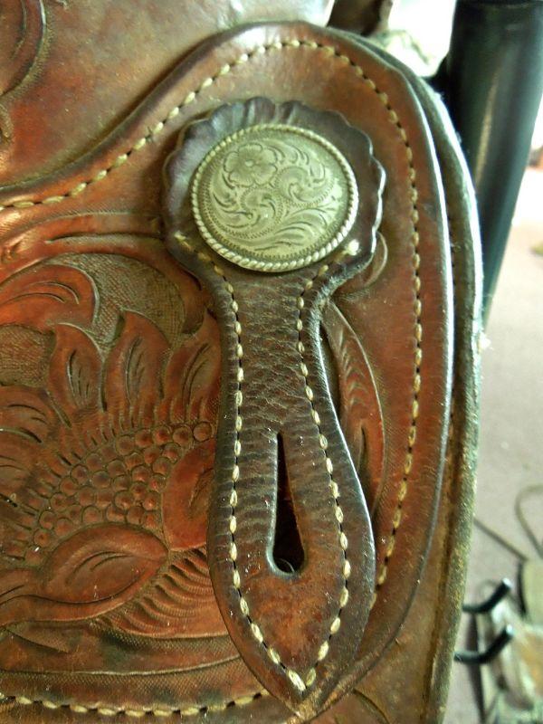 Lot 9: Longhorn Tooled 15" Western Saddle with Sterling Concha Detail
