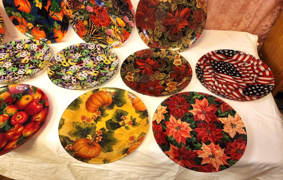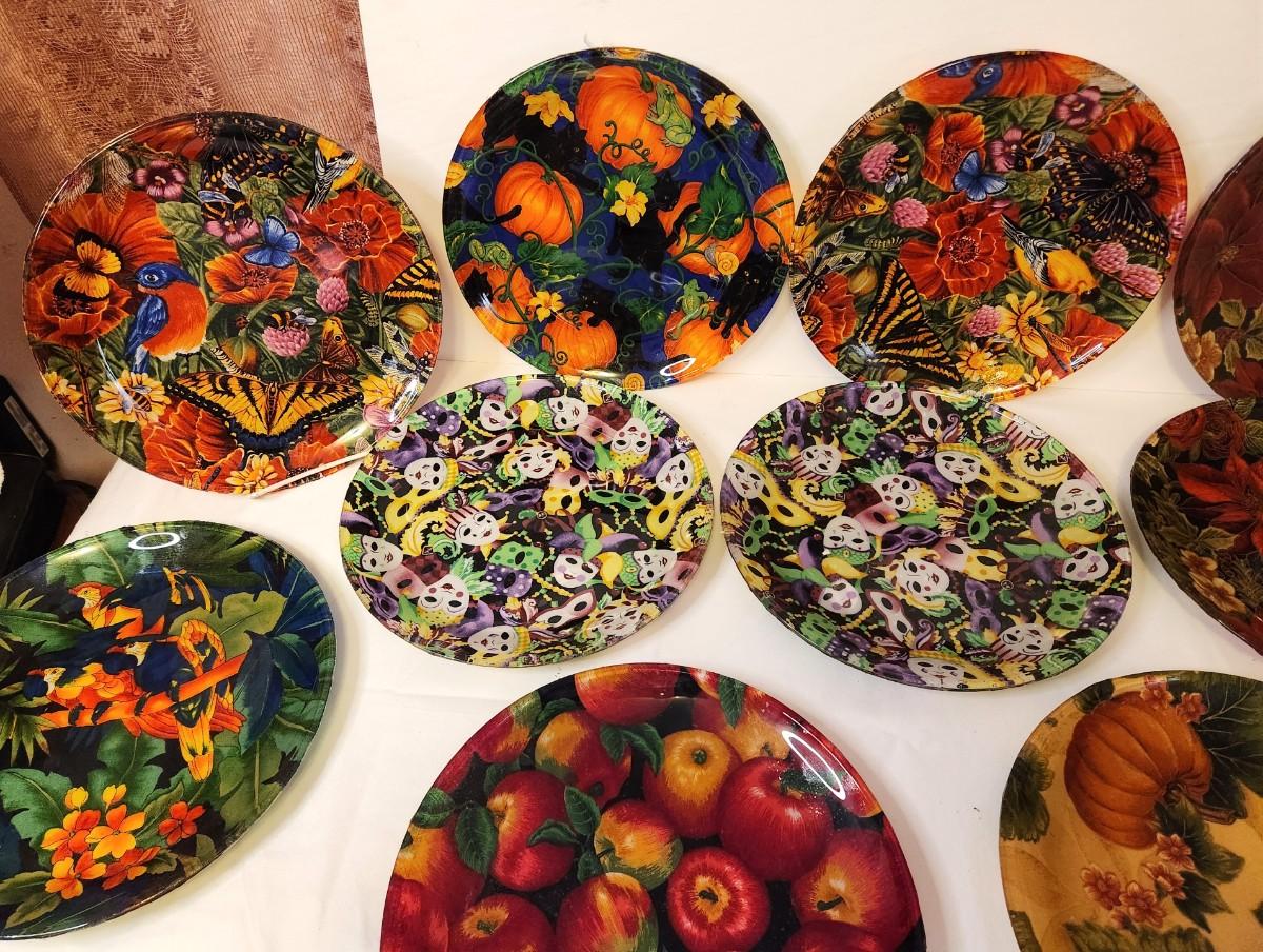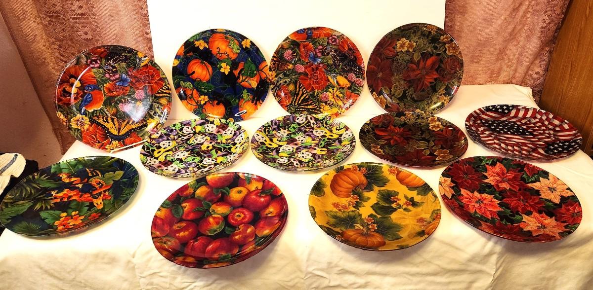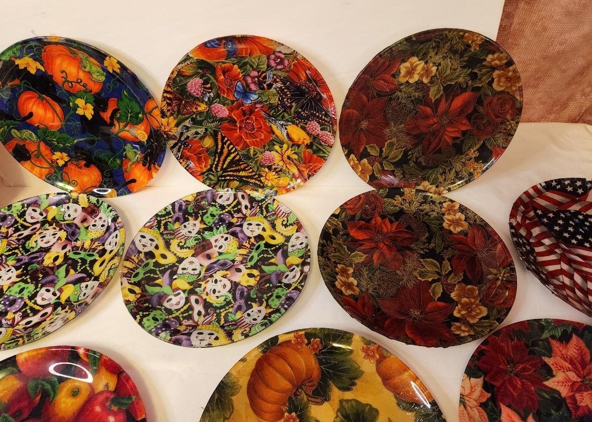Lot of 12 contemporary decorative glass plates - Christmas, Mardi Gras, Fall, etc themes. These are heavy.