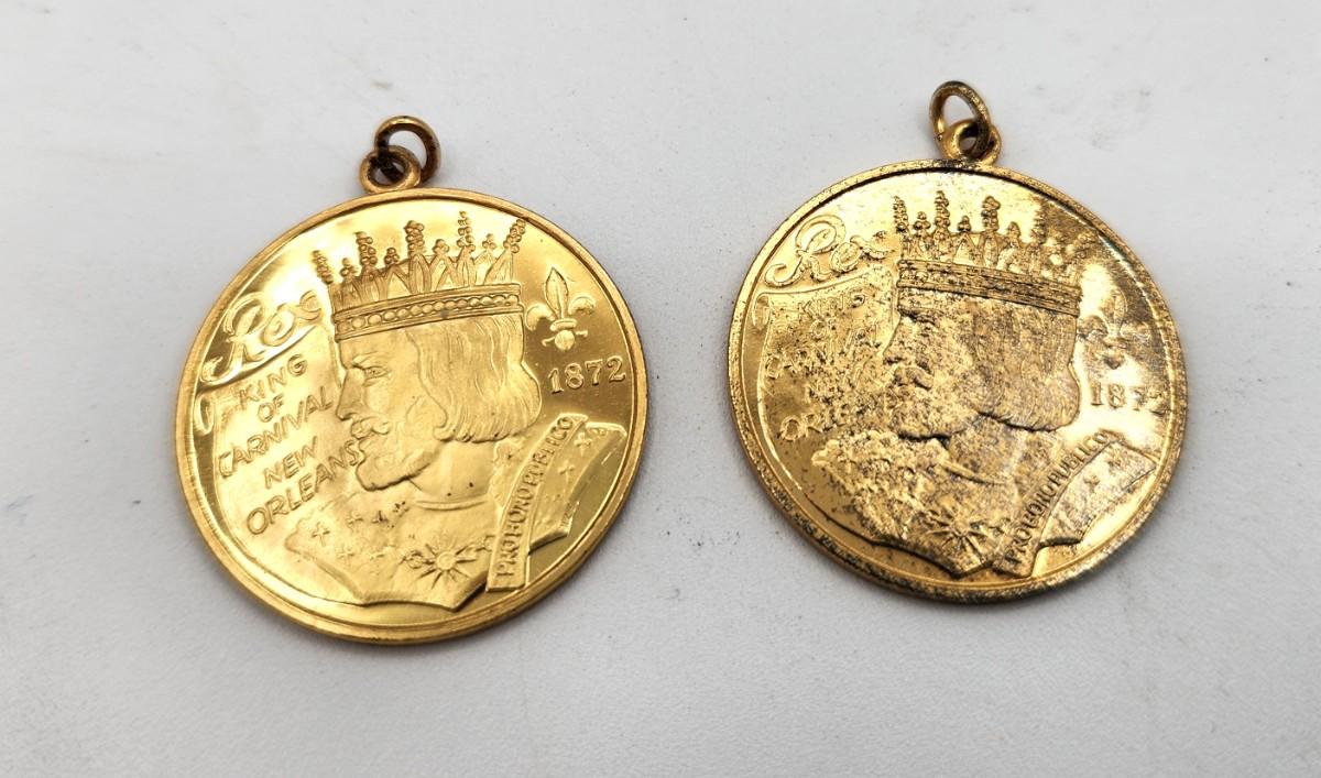 These charms/favors were produced by the Rex organization and were only available that year to the members by special order. Made in West Germany, each is sterling silver with gold overlay (vermeil). You get "His Majesty's Garden - 1979" and Rex and the Masters - 1978. The '79 is in better condition than the '78. We have not attempted to polish. SCARCE.
