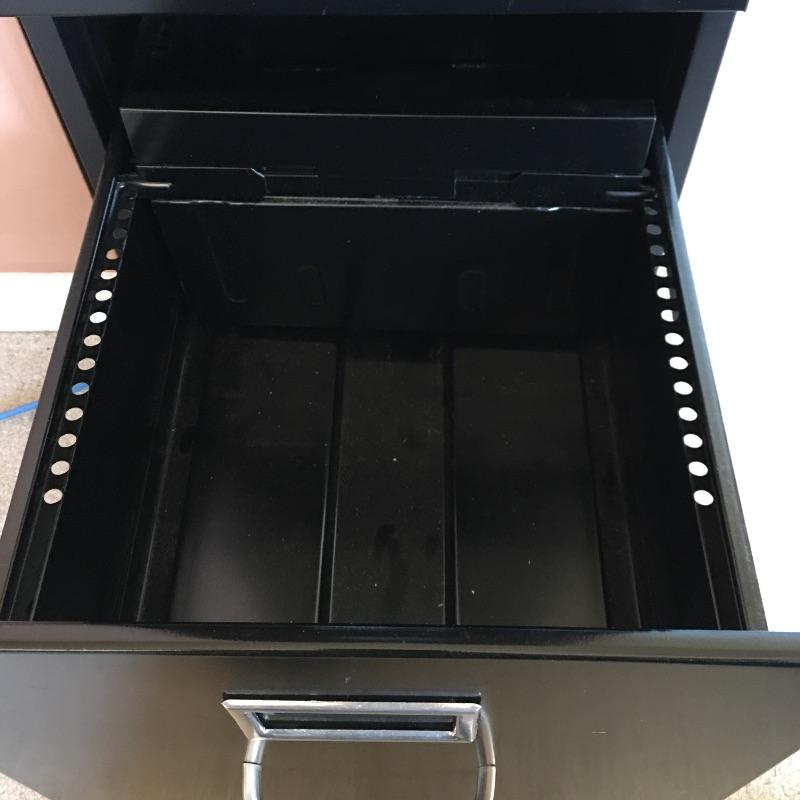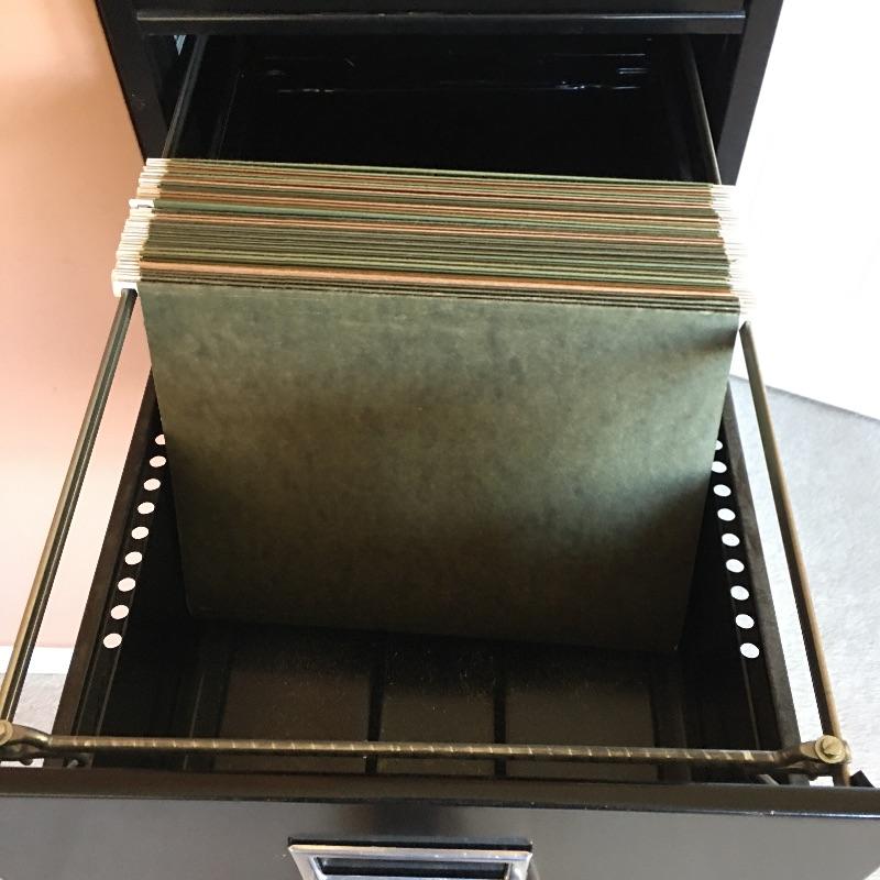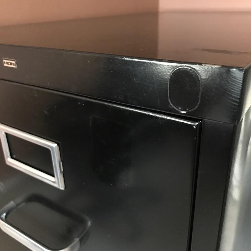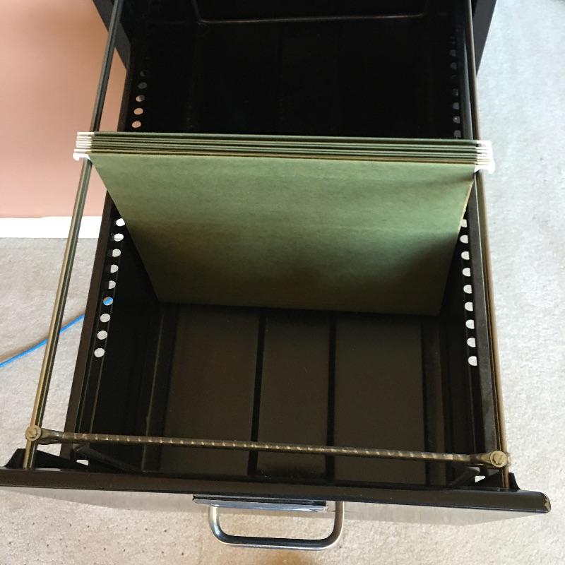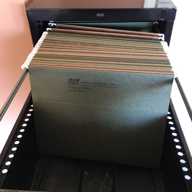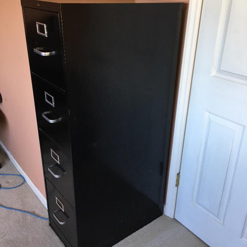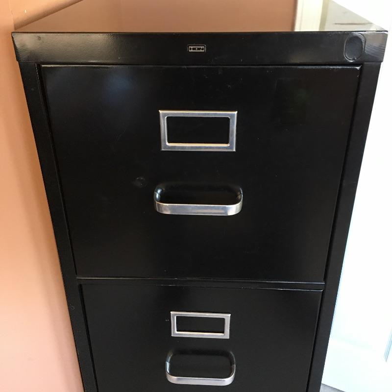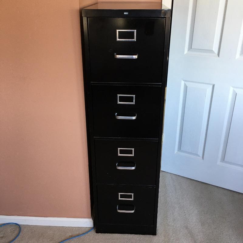 Four drawer metal file cabinet by HON. Top three drawers have hanging files. Has space for adding a lock if desired. All drawers open and close easily and include some hanging folders for you to get started. Bottom drawer does not have metal piece to hold files. You can easily purchase this or use it to stack large books or files instead. Cabinet measures 15” x 25” x 52”.
