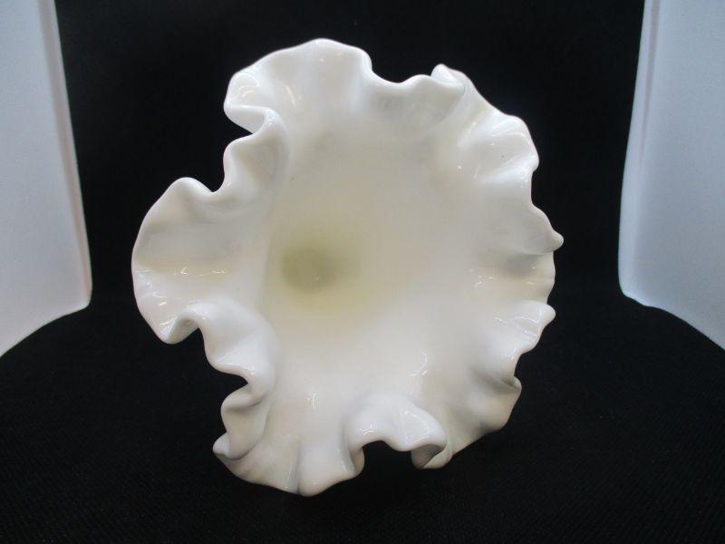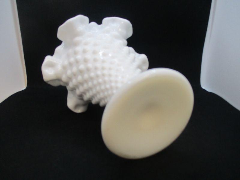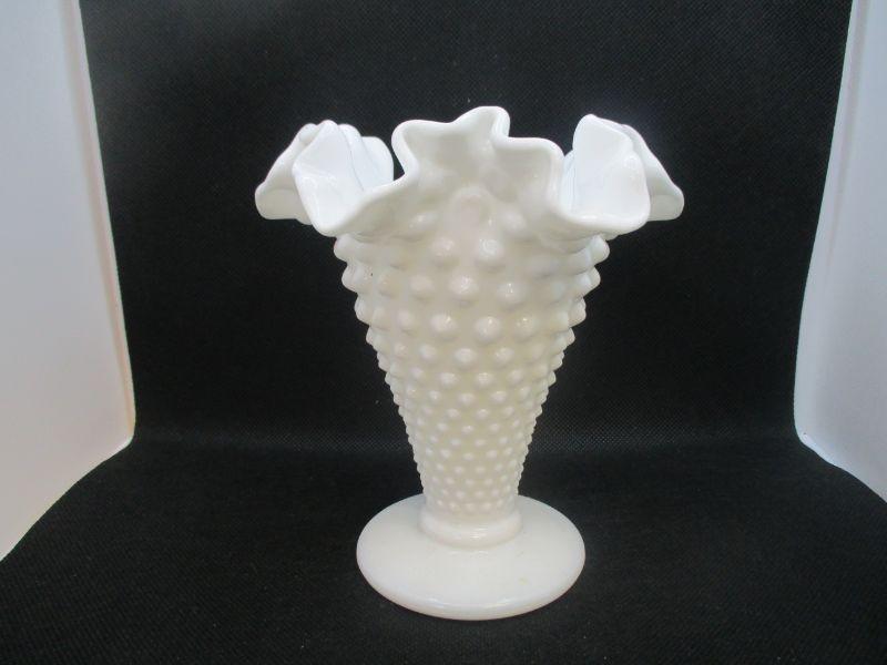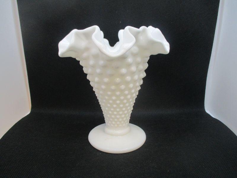 This is possible Fenton and in excellent condition. If it is Fenton, it was made during the paper label period. The vase is just over 5.5" tall.