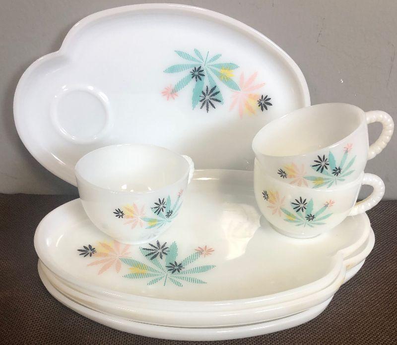 Lot# 9 Milk Glass Snack Set Leaf Pattern Anchor Hocking?