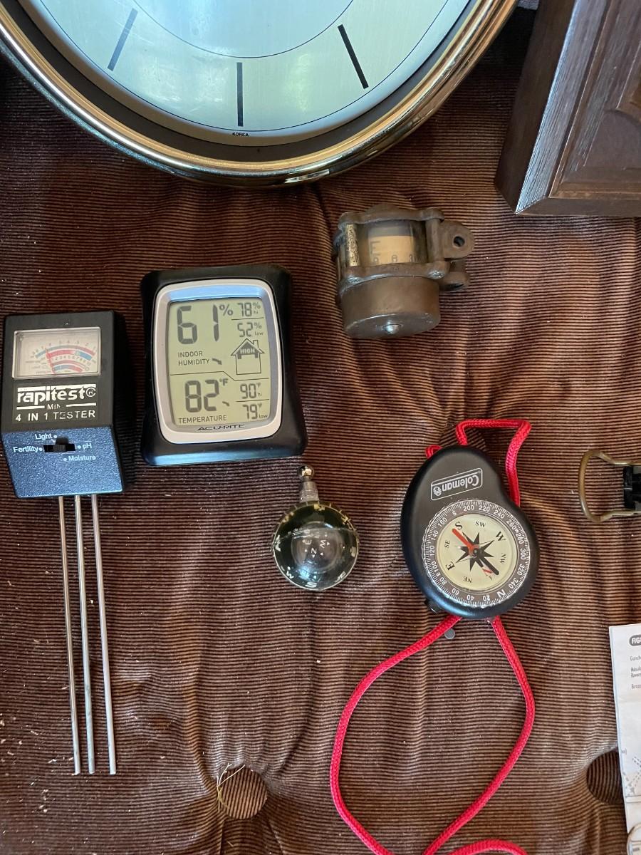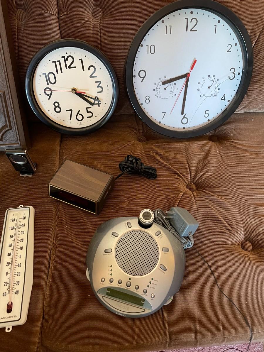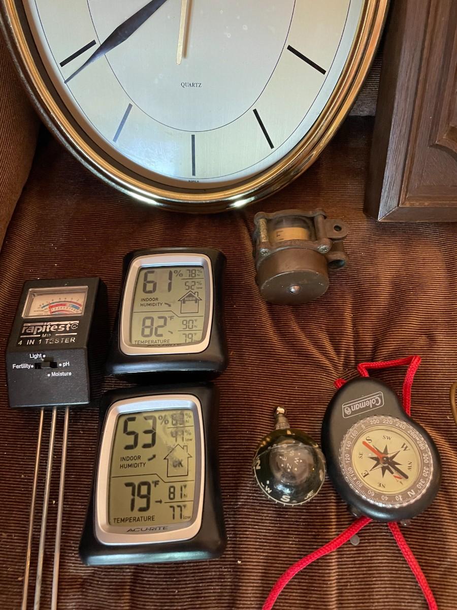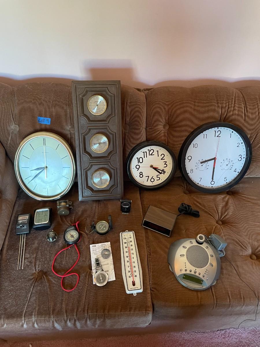 (2) Clocks, indoor humidity clock, rapidest, barometer, acurite, compasses, alarm clocks.